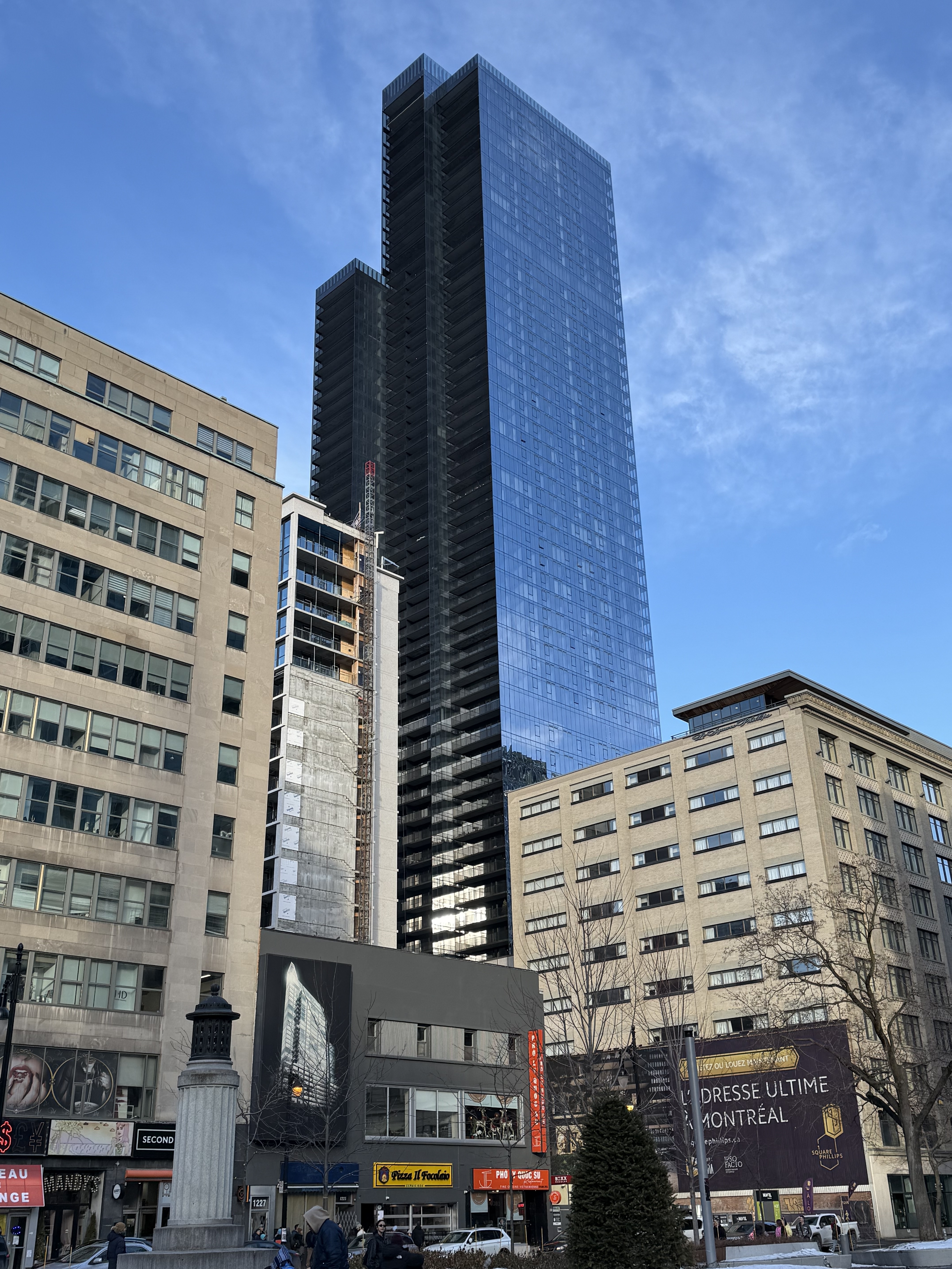 Il reste l’immeuble de 21 étages complété à 75% et l’hôtel à construire en façade du square Phillips.