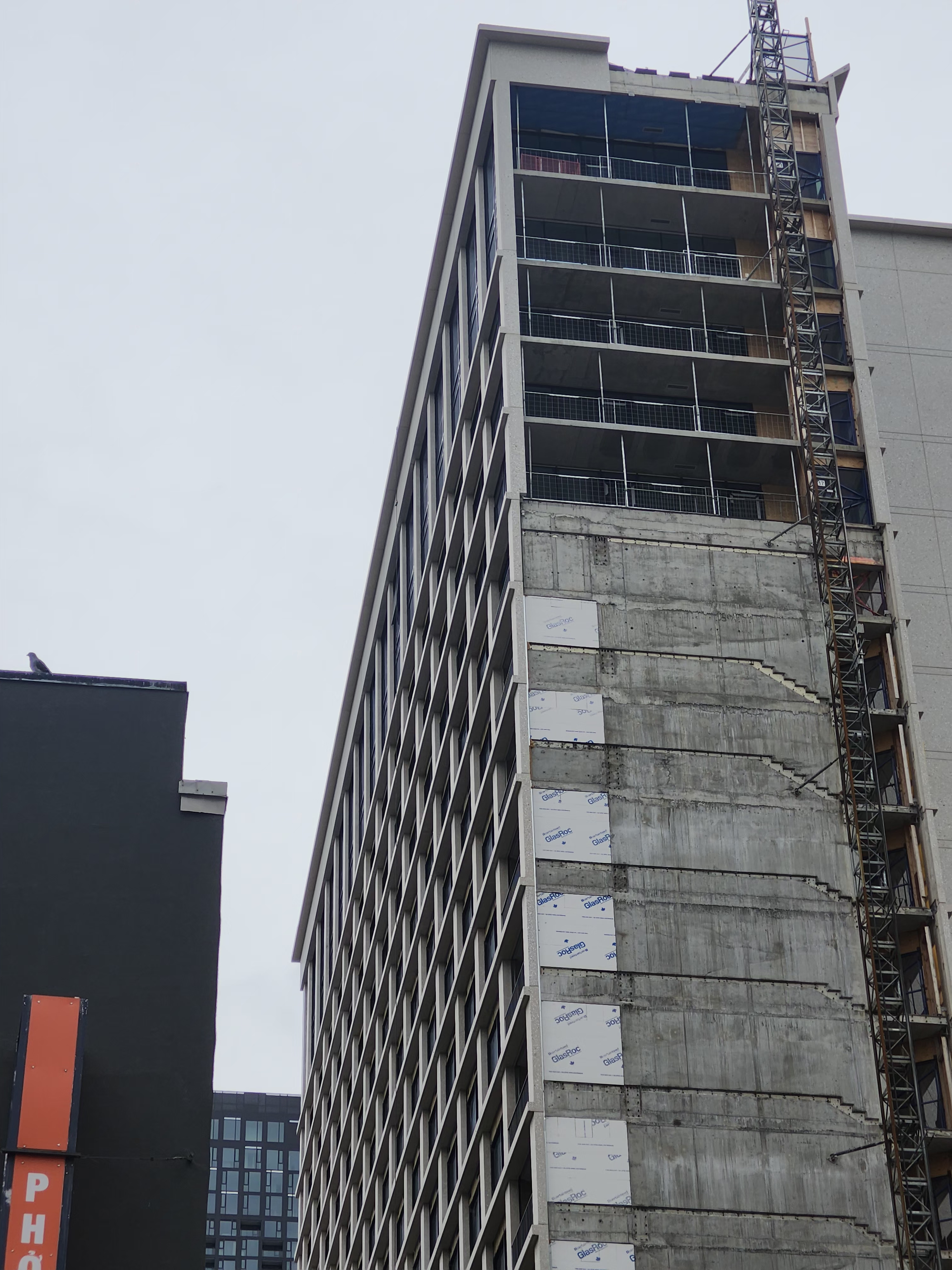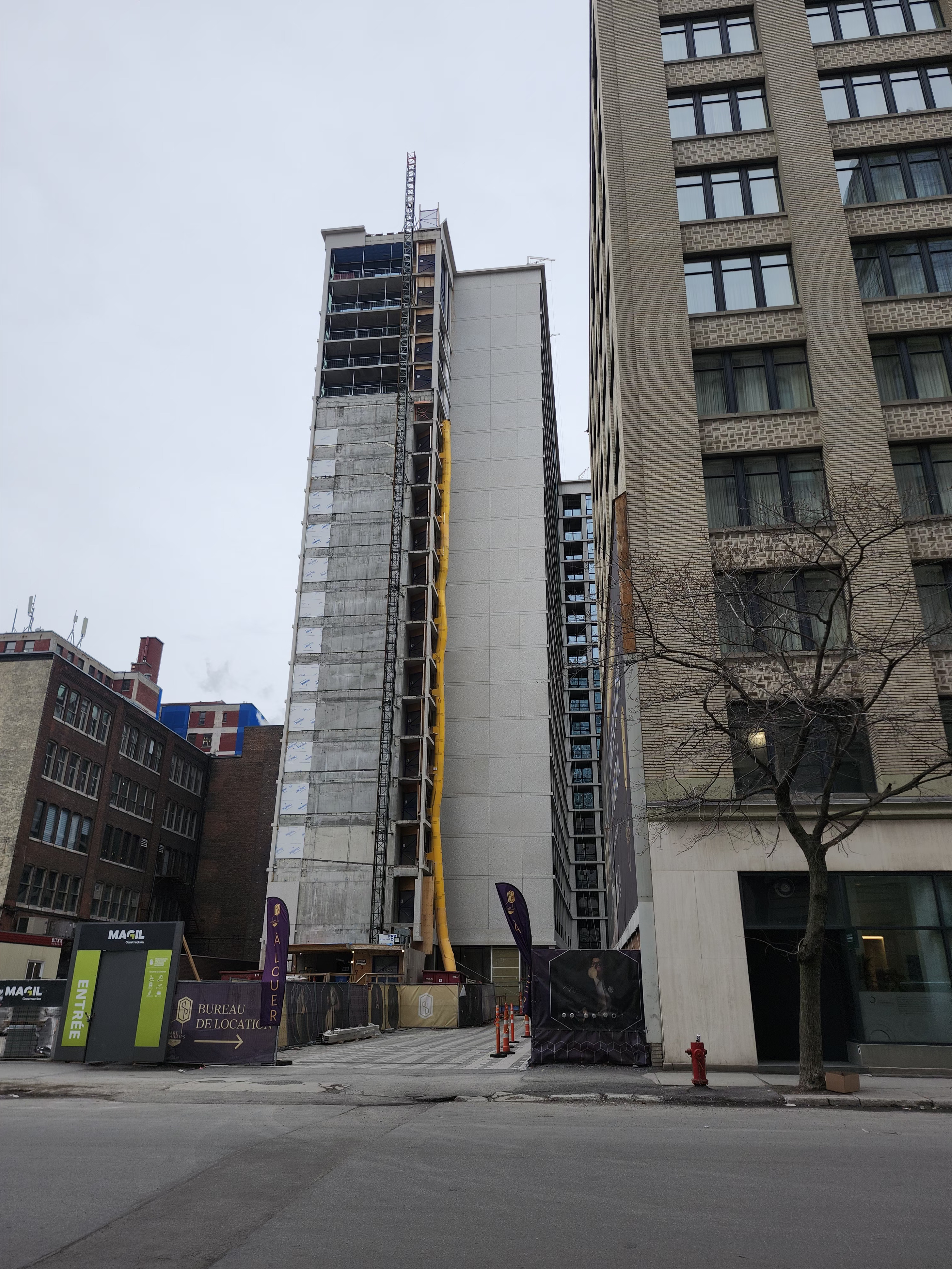 Ce chantier semble tourner au ralenti, les locations sont peut-être lentes étant donné que le chantier de l’hôtel en dérangera plusieurs. Étant enclavé il aurait sûrement été préférable que l’hôtel soit bâti en même temps que la dernière phase locative. Au moins toute la partie fondation est déjà réalisée, alors l’érection de l’hôtel (14 étages) ne partira pas de zéro et devrait être assez rapide une fois commencée.