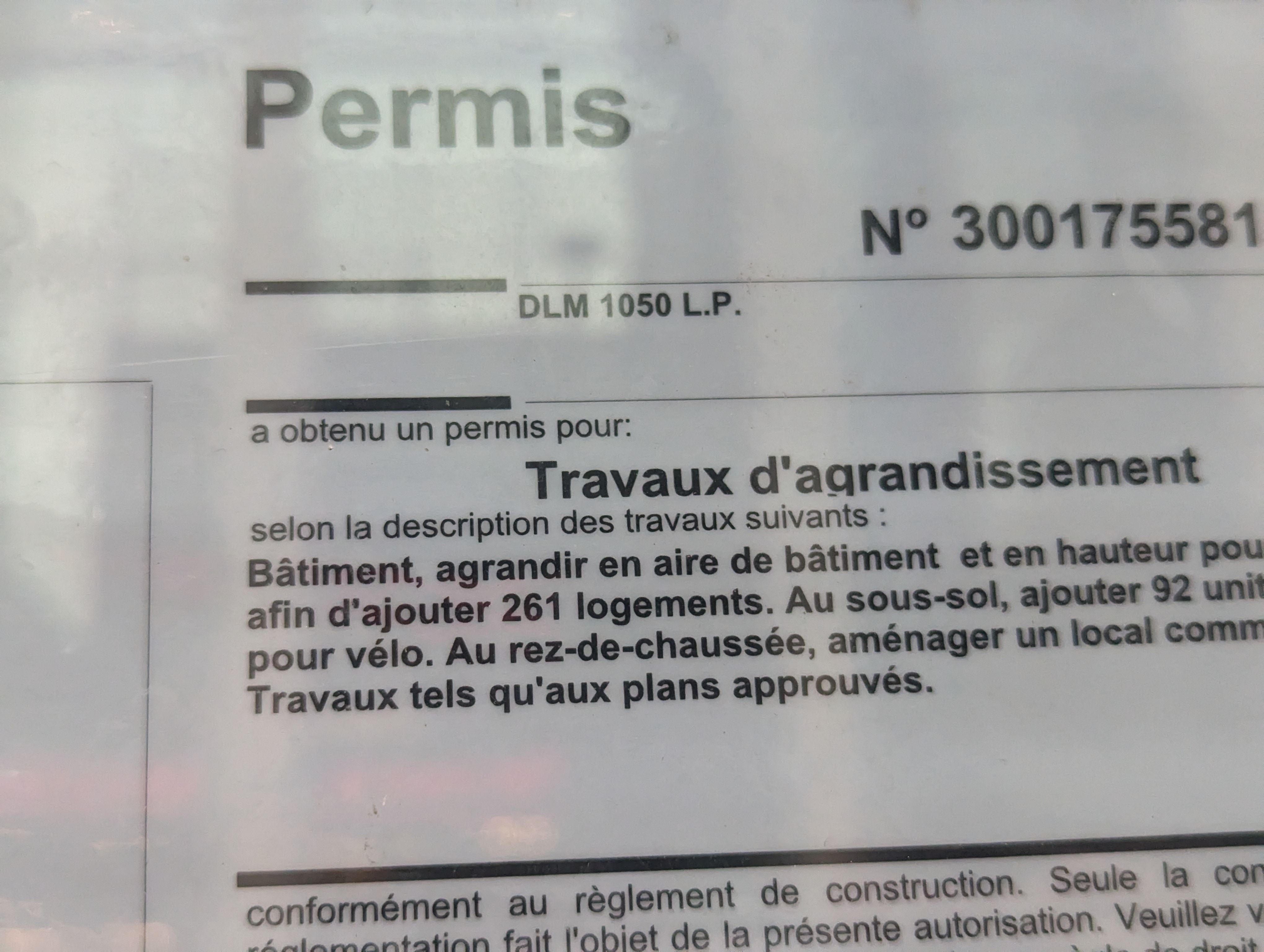 Bâtiment, agrandir en aire de bâtiment et en hauteur pour un total de 37 étages afin d’ajouter 261 logements. Au sous-sol, ajouter 92 unités de stationnement pour vélo. Au rez-de-chaussée, aménager un local commercial de 200 m². Travaux tels qu’aux plans approuvés.