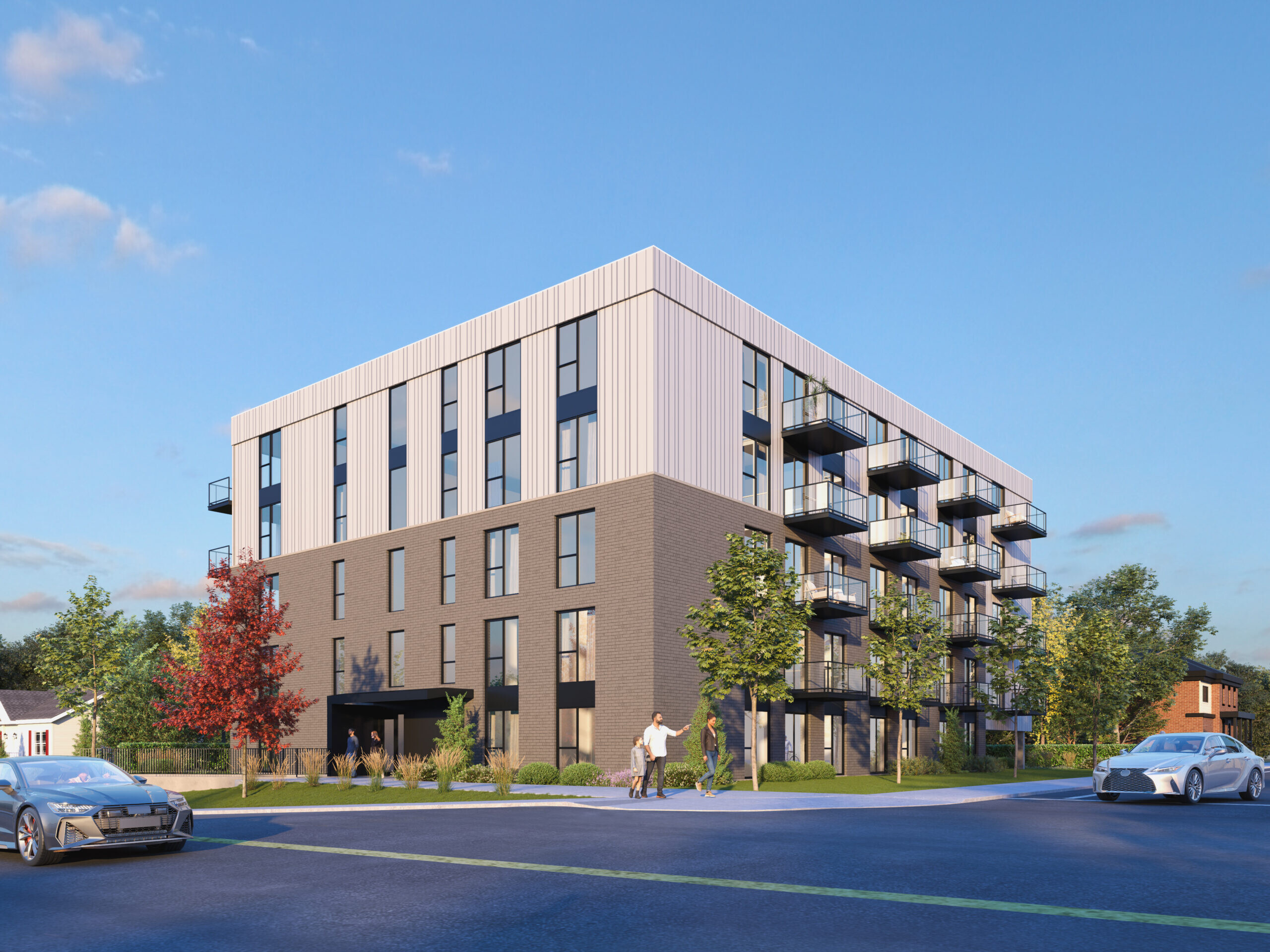 Projet de 43 logements réalisé près de la station Grand-Moulin du REM, en remplacement d’un bâtiment commercial et résidentiel construit en 1937.