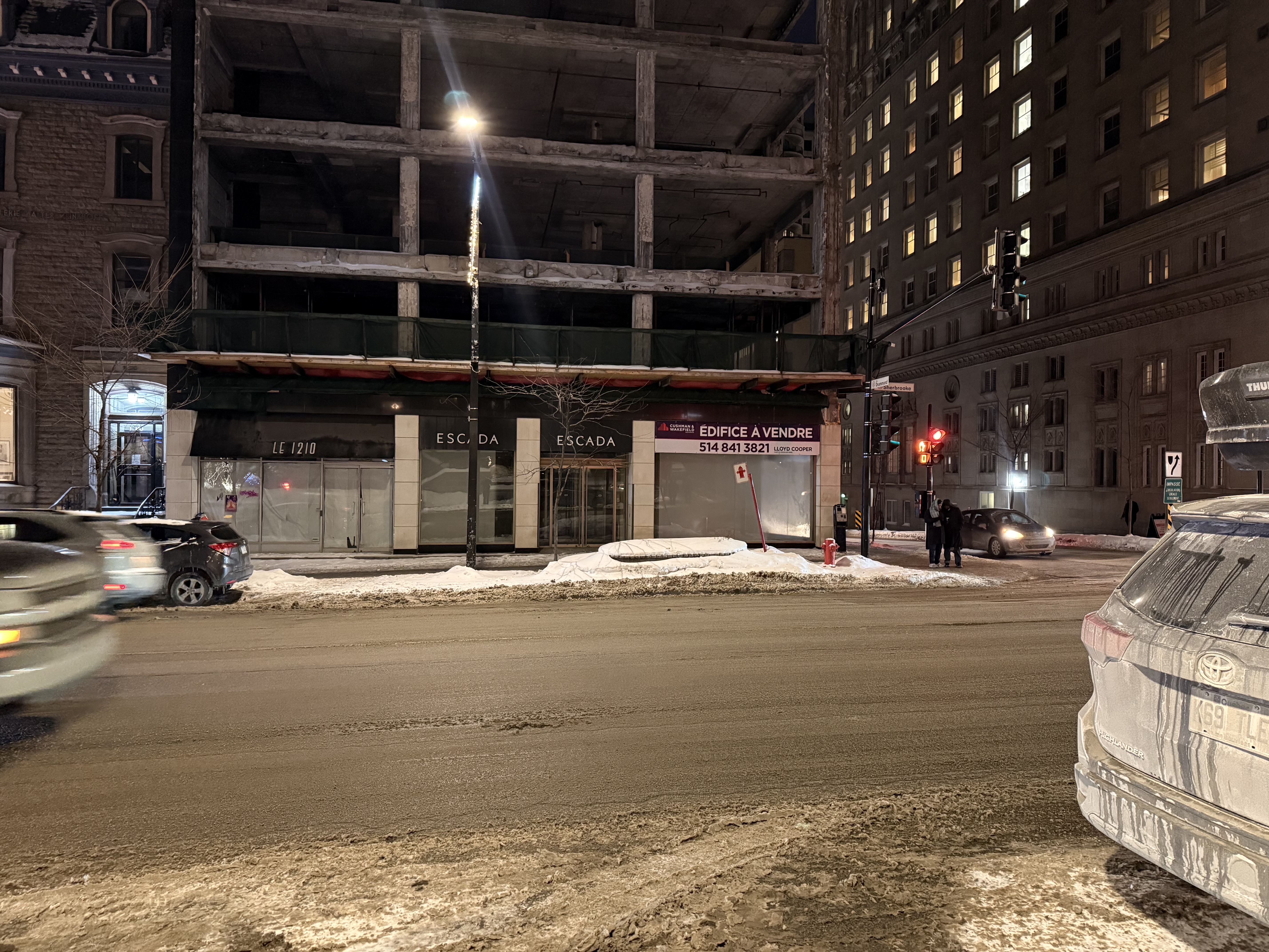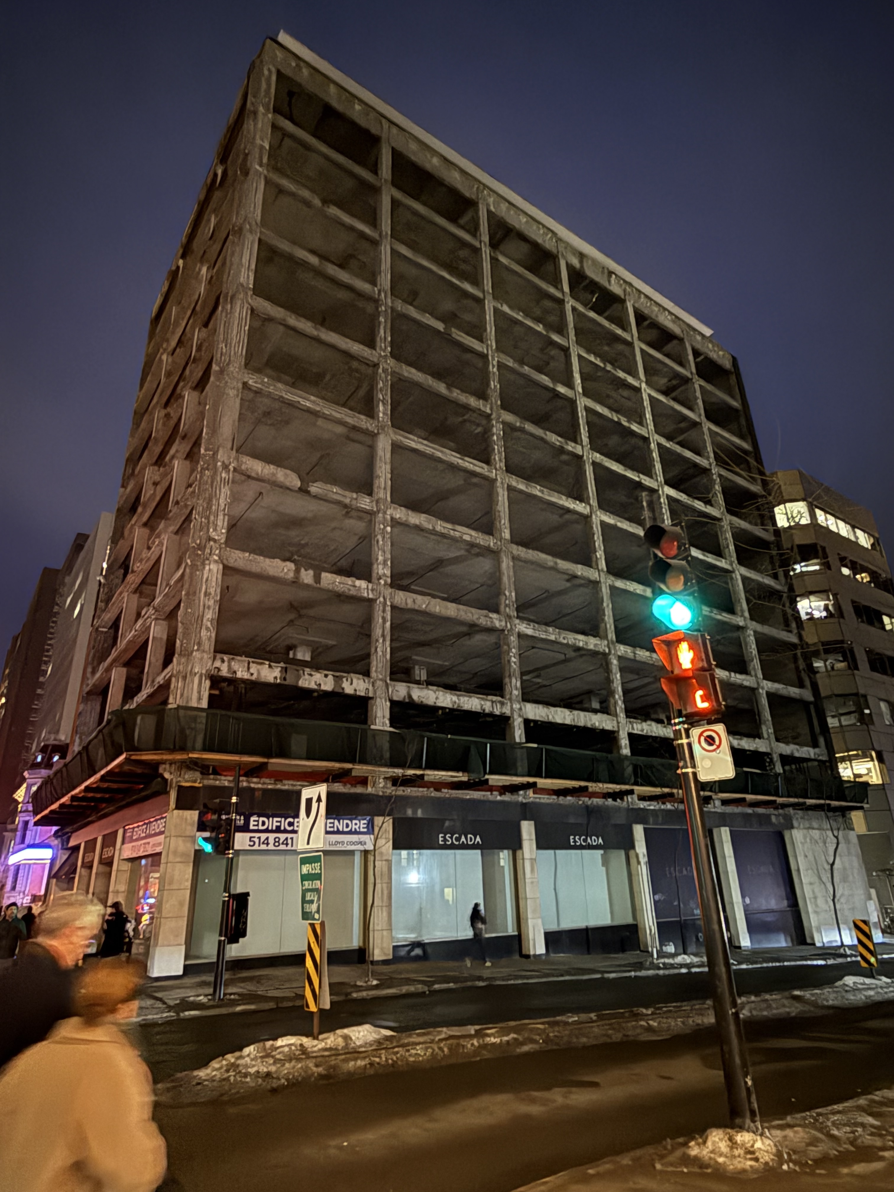 Il y a toujours des filets tout le tour de l’édifice si je ne me trompe pas . Pas très esthétique pour le coin présentement. C’est quand même un coin stratégique. Il y a une belle possibilité pour des appartements ou un hôtel . En plein Golden Square Mile. Ça fera facilement presque qu’un an que cet édifice est vide.