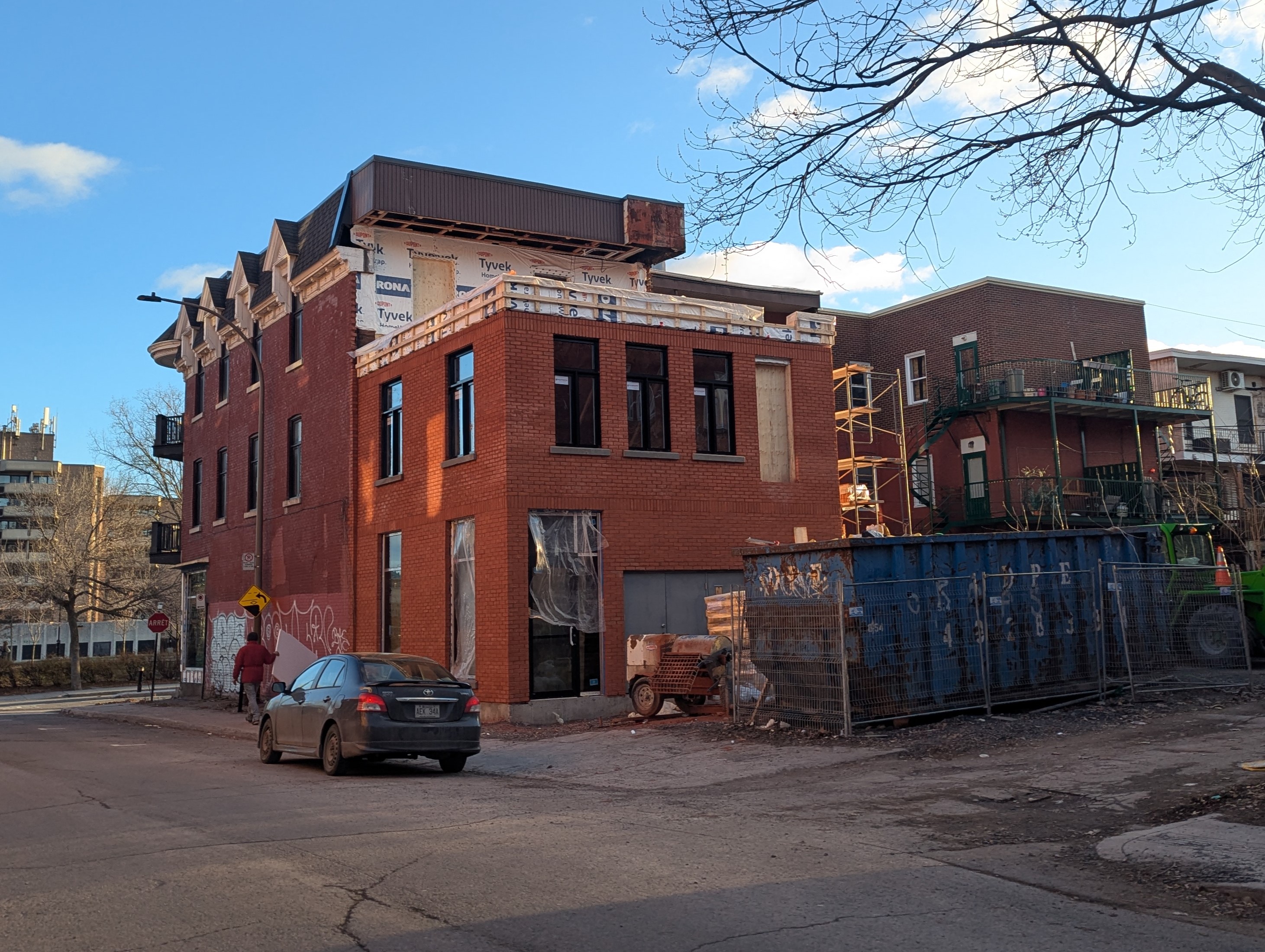 Projet d’agrandissement à l’arrière d’un bâtiment de 3 étages au coin de la rue Saint-Jacques et de l’avenue Walker par l’ajout d’un volume de 2 étages avec terrasse sur le toit et d’un escalier extérieur en colimaçon.