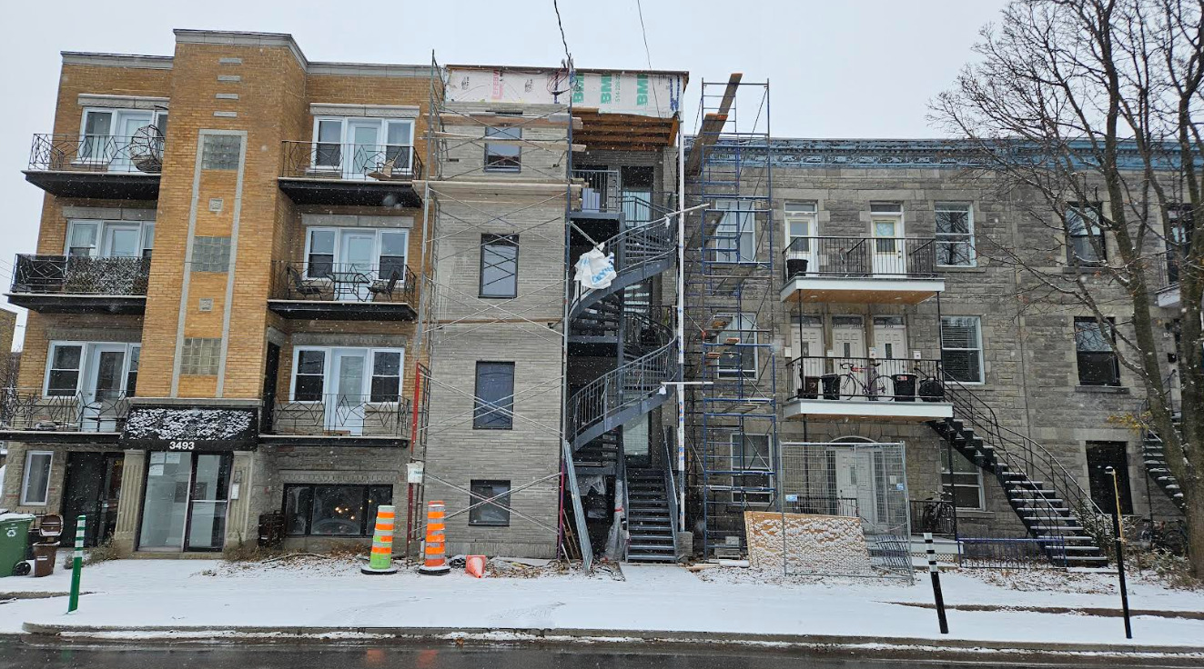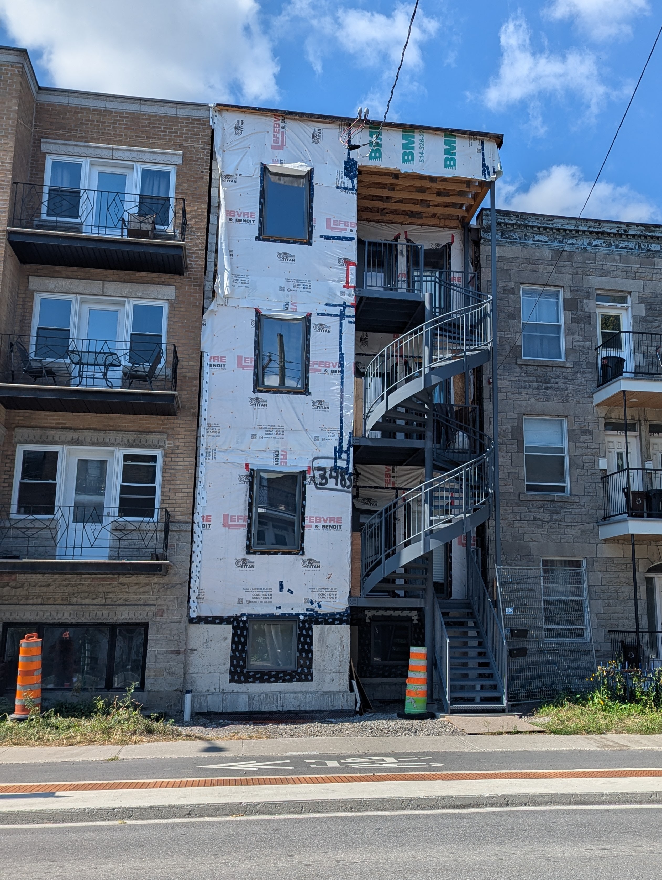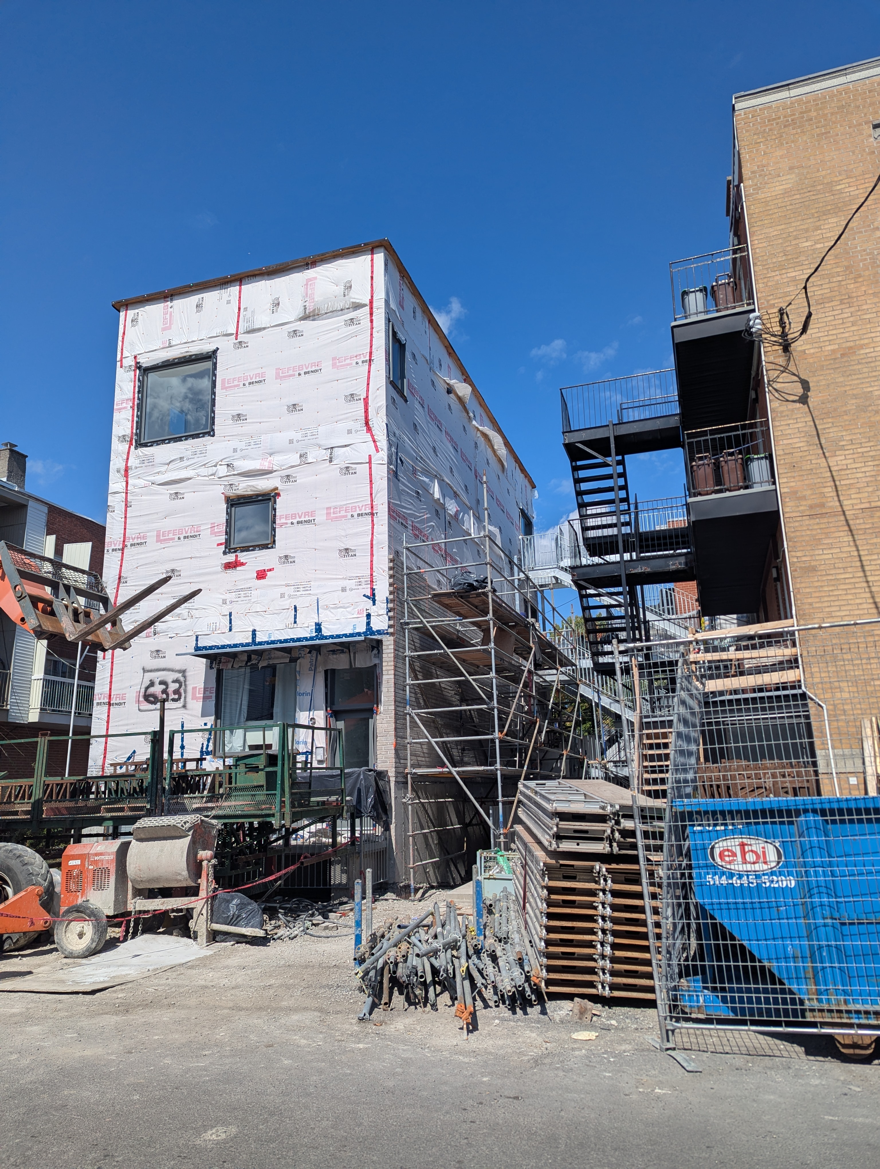 L’extérieur semble avoir peu progressé depuis le mois d’avril, à part la structure des balcons sur la rue de Verdun