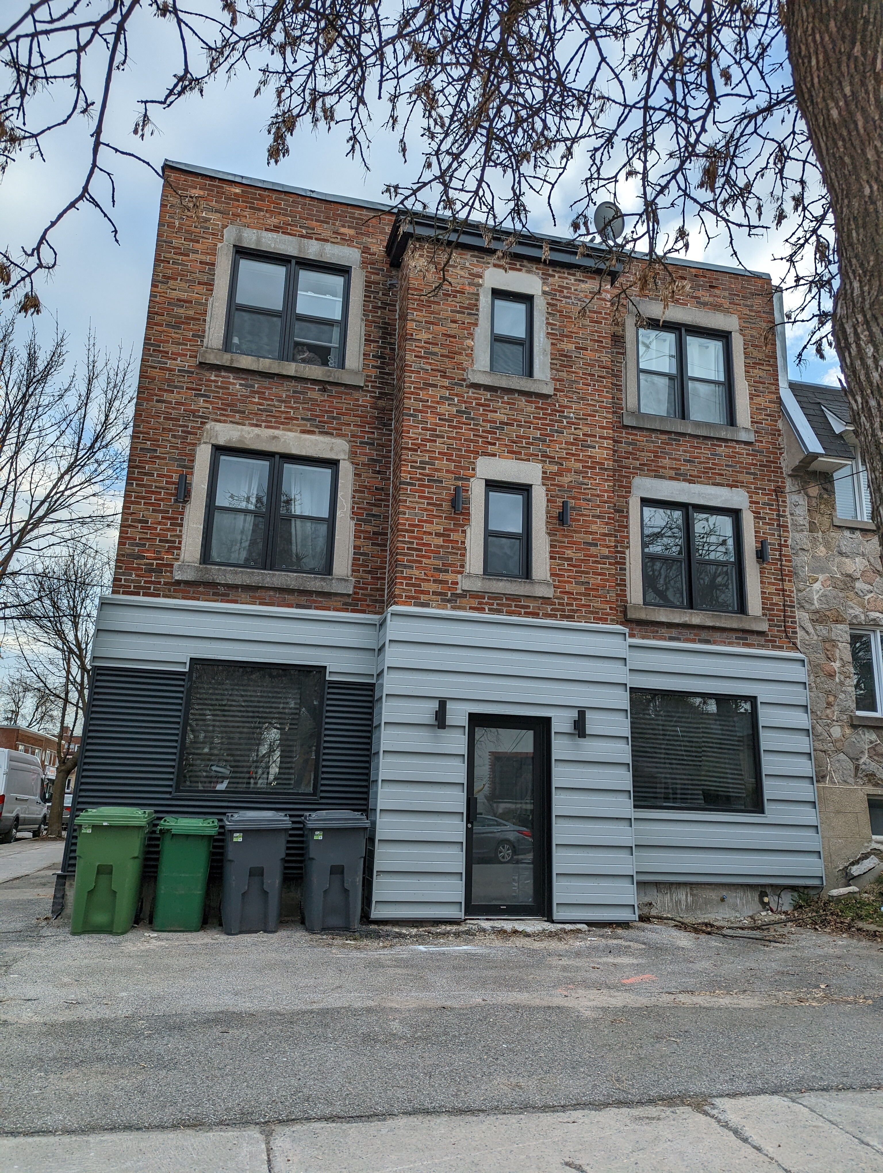Quelques détails du niveau de finition. Je trouve le travail amaturé. On peut voir les côtés non peinturés des pièces, il y a des coups bruts partout (même près des choses que les personnes doivent toucher), et les murs sont visiblement pas droits. La nouvelle façade est attachée aux briques originaux par les vis de béton (“concrete anchors” en anglais, qui ne fonctionnent pas bien dans le coulis).