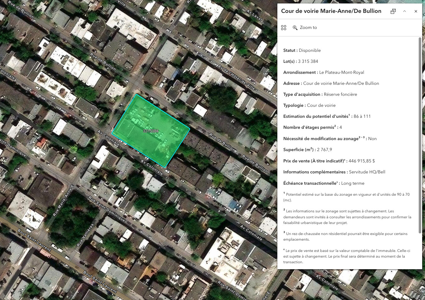 Statut : Disponible Lot(s) : 3 315 384 Arrondissement : Le Plateau-Mont-Royal Adresse : Cour de voirie Marie-Anne/De Bullion Type d’acquisition : Réserve foncière Typologie : Cour de voirie Estimation du potentiel d’unités¹ : 86 à 111 Nombre d’étages permis² : 4 Nécessité de modification au zonage² ̄ ³ : Non Superficie (m²) : 2 767,9 Prix de vente (À titre indicatif)⁴: 446 915,85 $ Informations complémentaires : Servitude HQ/Bell Échéance transactionnelle⁵: Long terme