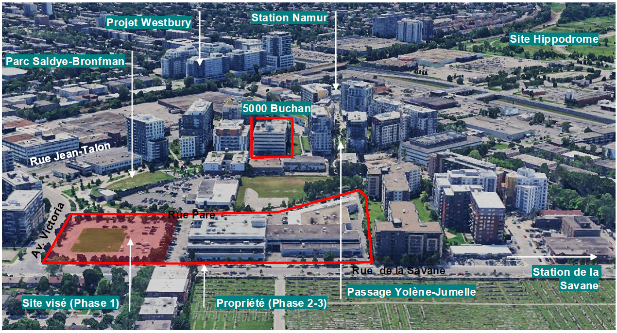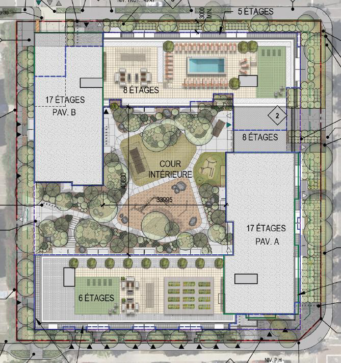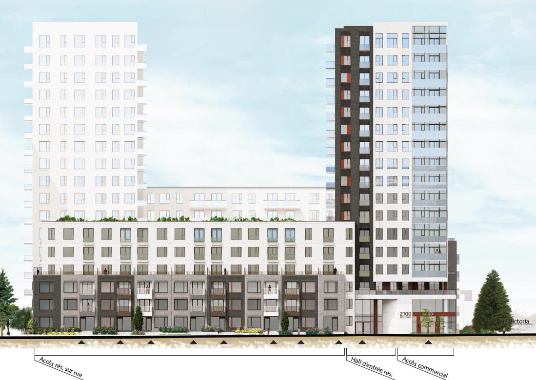Le projet consiste à construire un bâtiment résidentiel d’une hauteur variant entre 6 et 17 étages, destiné à accueillir environ 565 logements dont une partie dédiée à du logement social ou abordable et à une superficie commerciale ou communautaire d’environ 150 m2. La superficie d’aire de plancher brute serait d’environ 35 182 m2 pour la partie privée (COS de 4,41) et de 8 172 m2 pour la partie sociale ou abordable pour une superficie de plancher totale brute de 43 354 m2 (40 274 m2 de superficie nette) soit un COS total de 5,42.