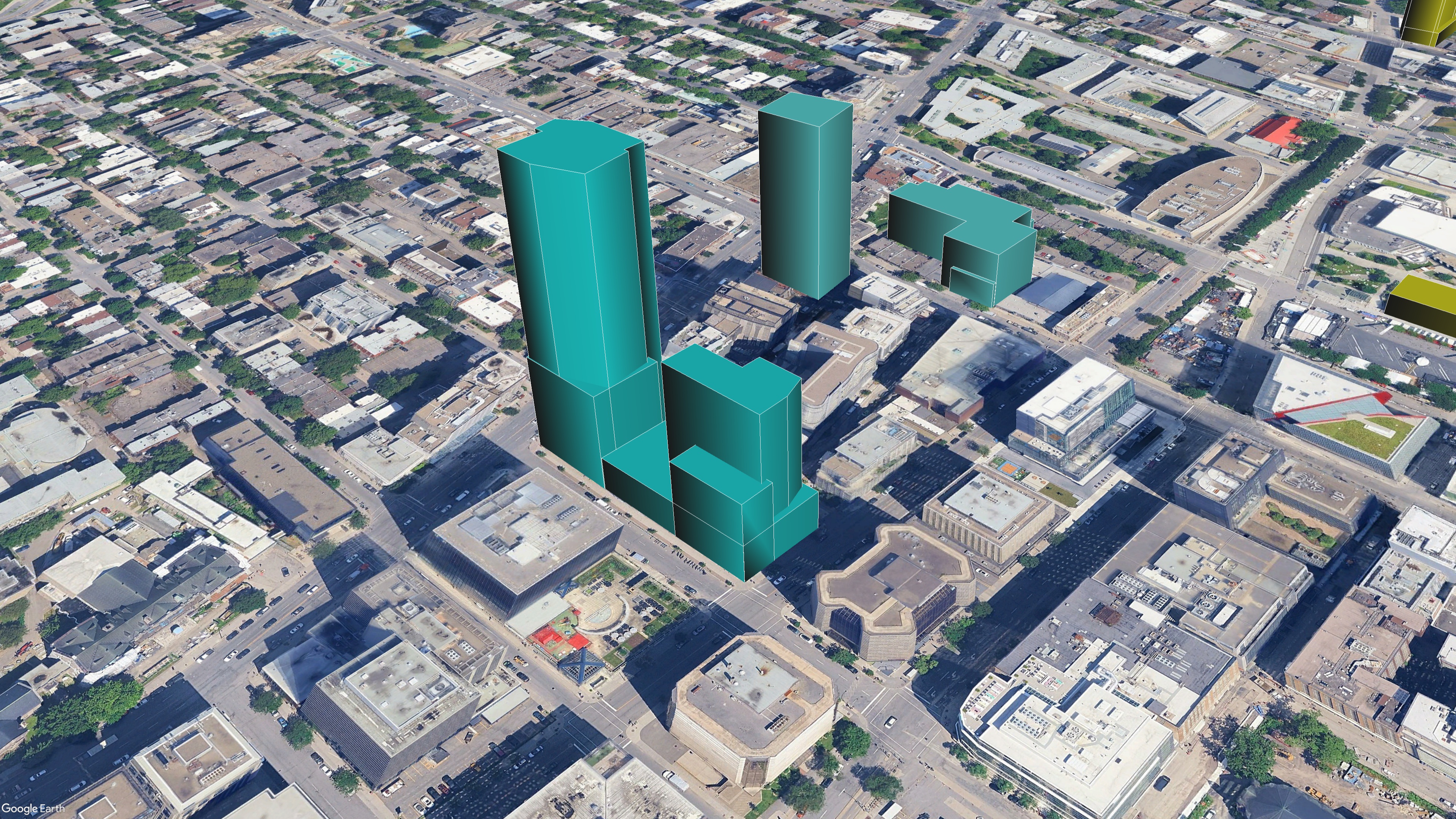 J’ai complété le modèle 3D de ce projet (raffiné la tour de 34 étages, et fait celle de 18 étages). La section de 18 étages est un peu perdu dans les volumes actuels, cependant.