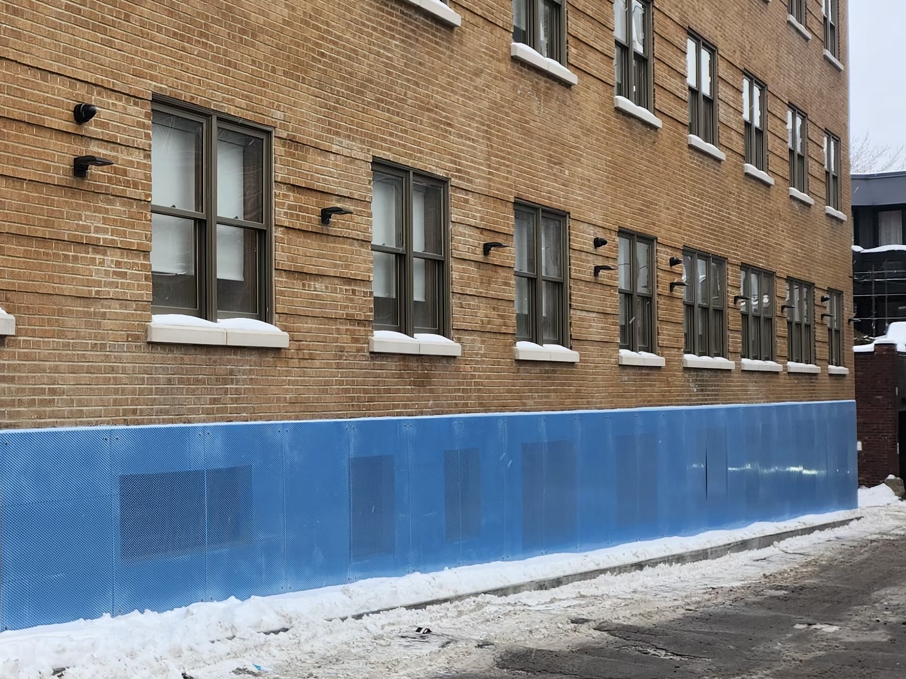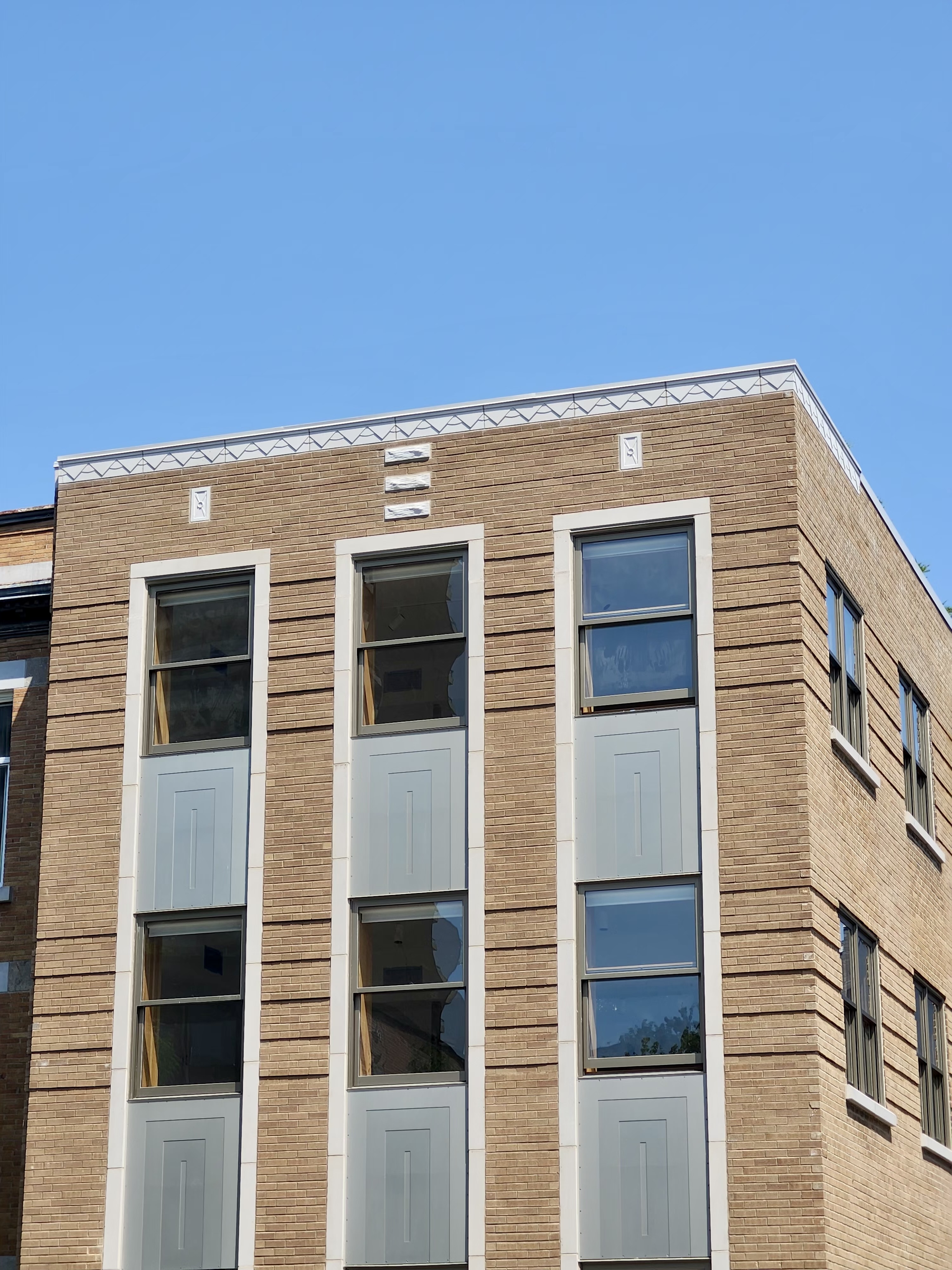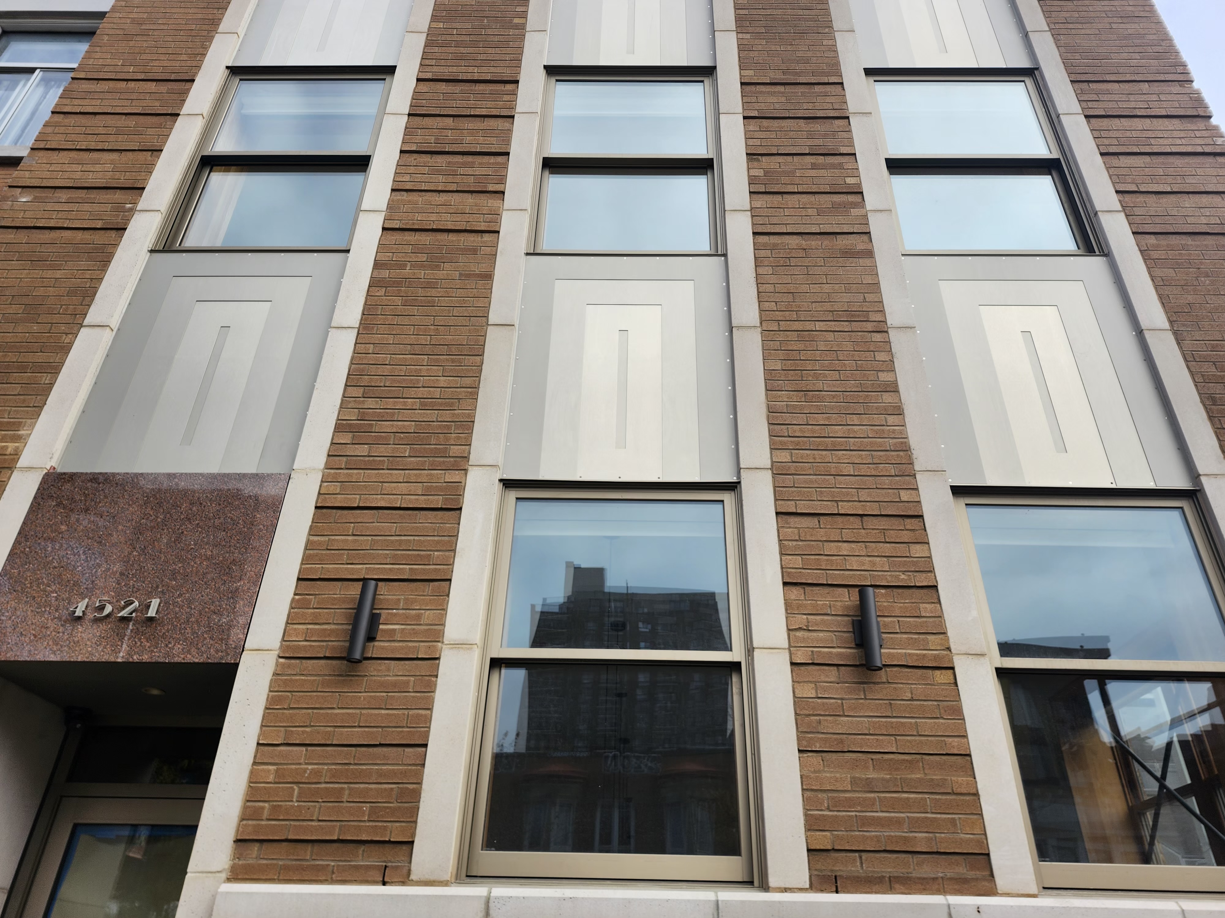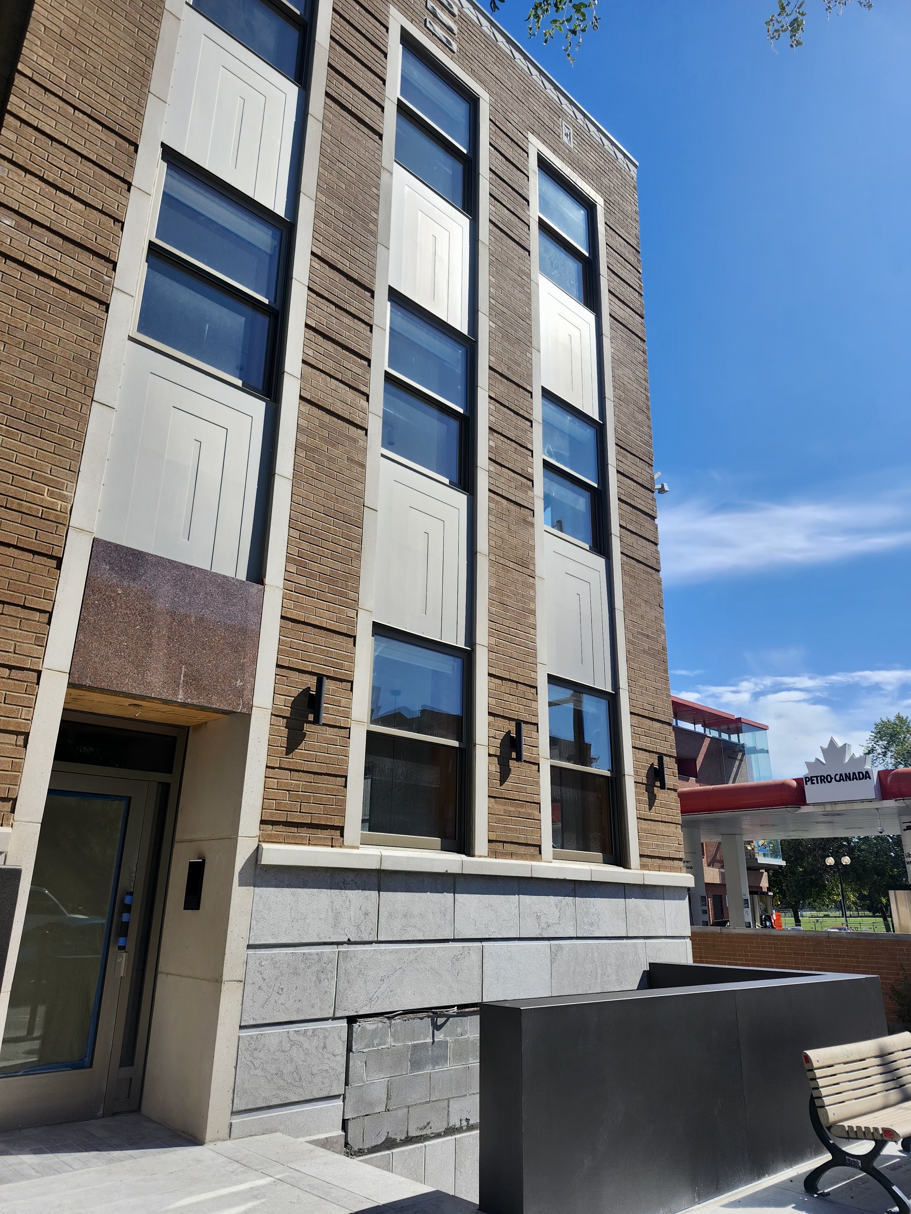En façade, remplacer la brique avec insertions de béton et pierre calcaire dans le bas. Sur mur latéral sud, près du coin, remplacer parement de pierre calcaire dans le bas et retirer/réinstaller l’insertion de béton du couronnement. Suite au permis 3001684395-24, modifier la couleur de brique pour les murs privatifs nord des 2 édicules au toit: Glen-Gery Red Smooth Modular.