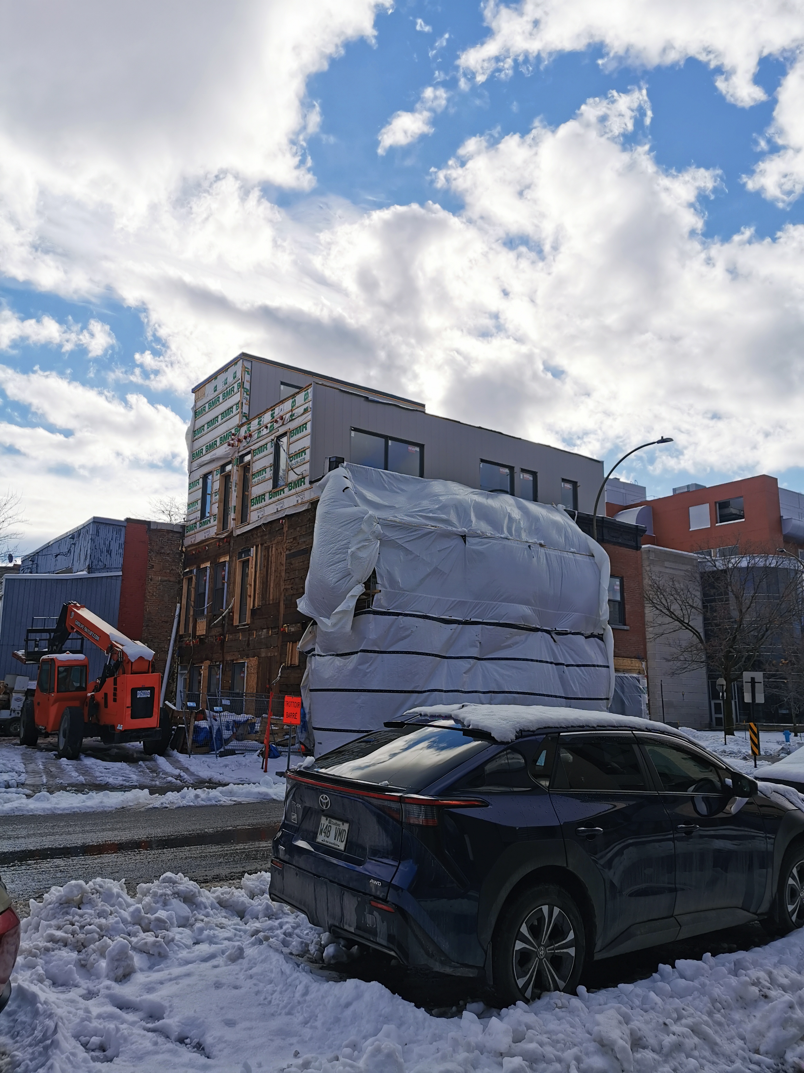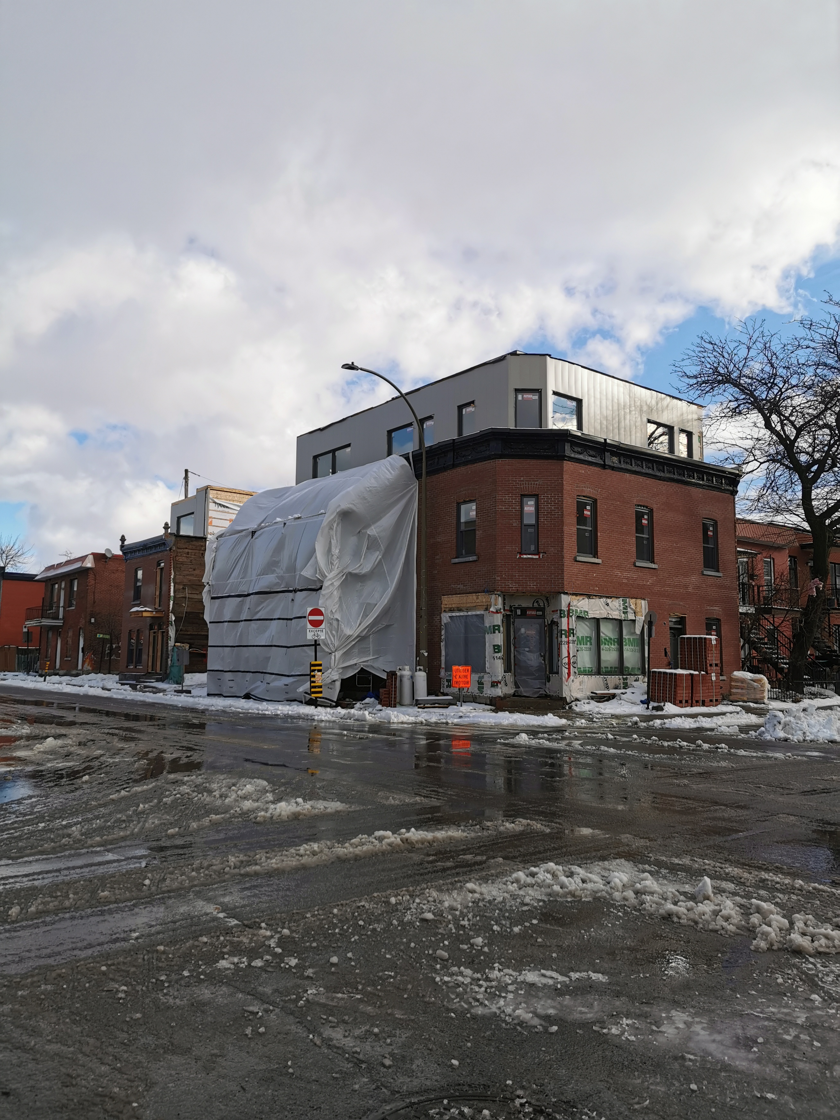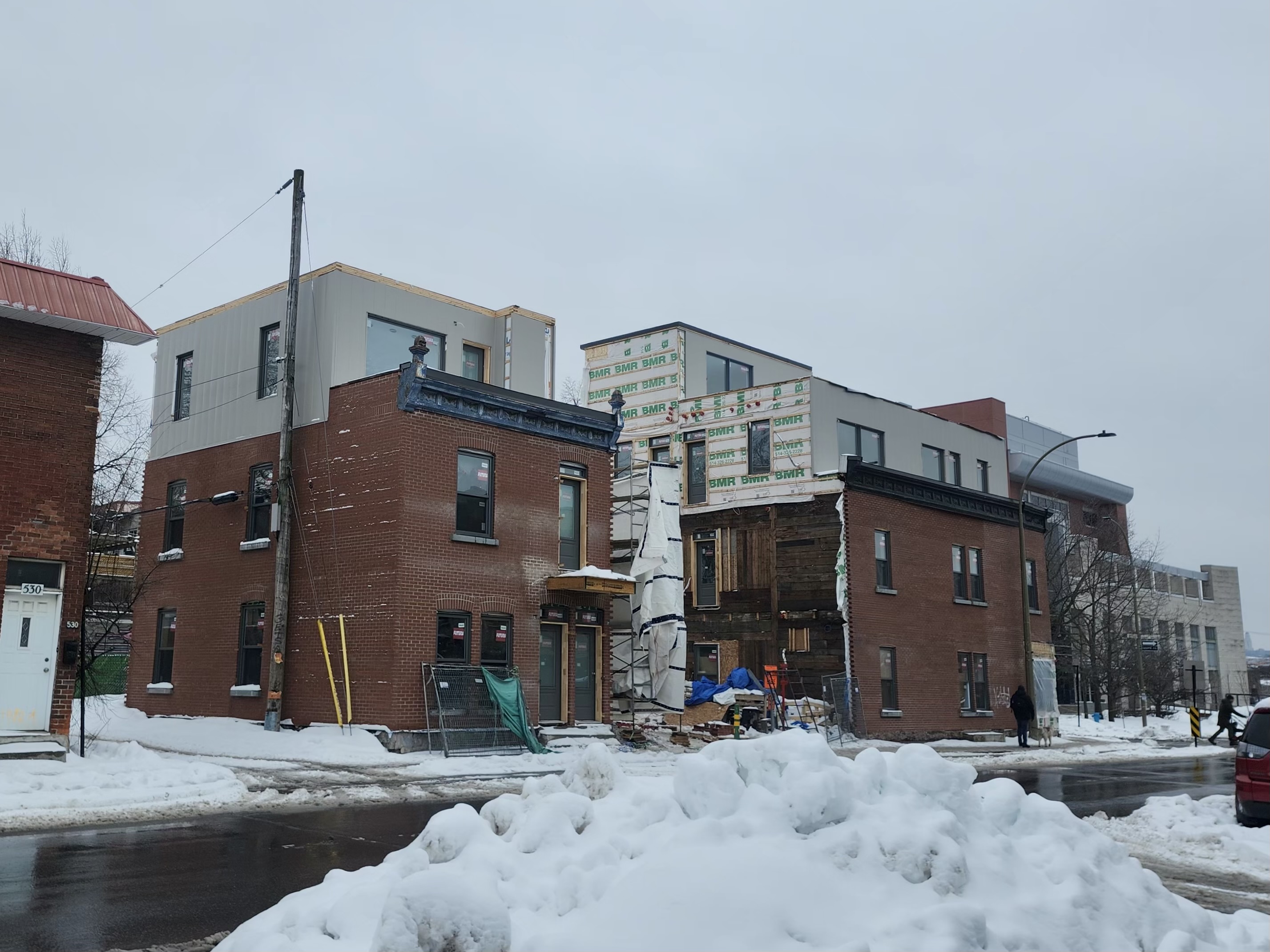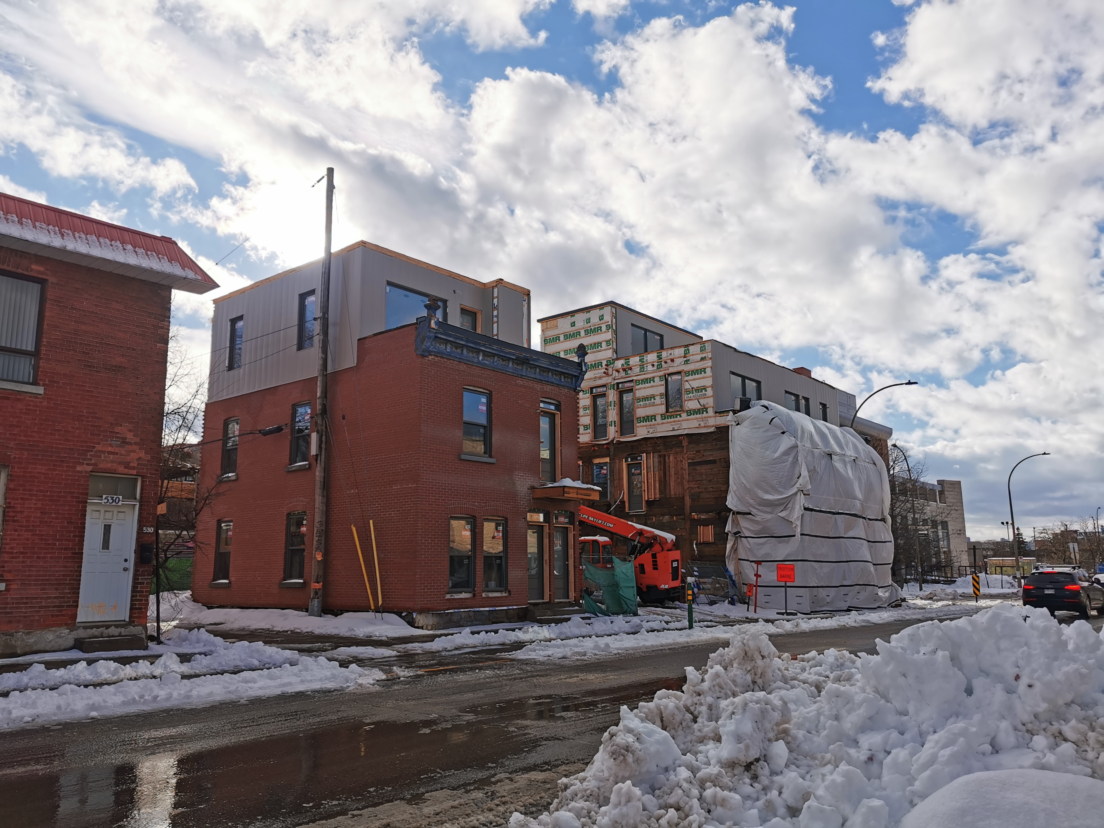 Ce n’est vraiment pas réussi cet agrandissement. La combinaison d’un étage en retrait surmonté d’une mezzanine fait l’effet d’un gâteau de mariage. Et comme c’est sur un coin de rue, on voit le gâteau de tous les côtés. Peut-être que le résultat final sera mieux, mais ça ne regarde pas bien pour le moment.