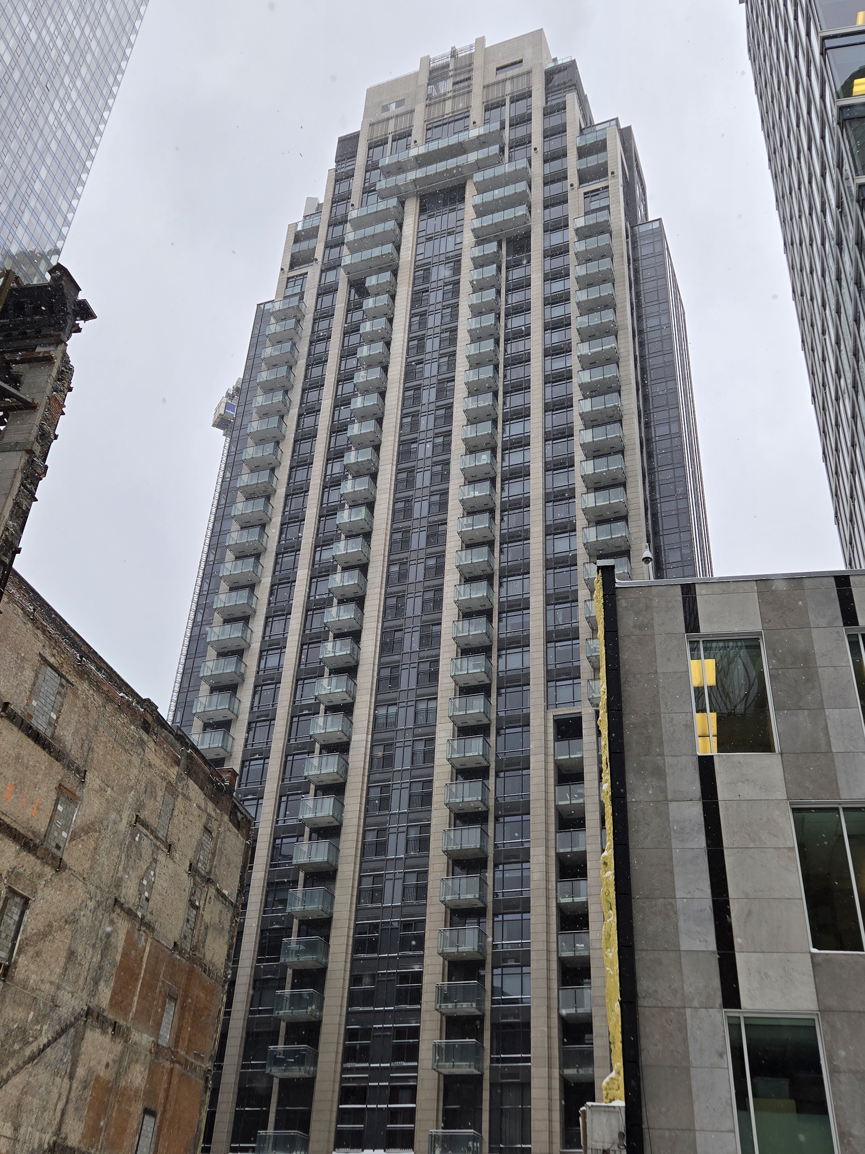 On vient d’installer une protection pour les piétons à la base de la tour à condo. Y aurait-il un enjeu de façade en hauteur ou est-ce pour un simple nettoyage des fenêtres? Il y a une nacelle à la base.