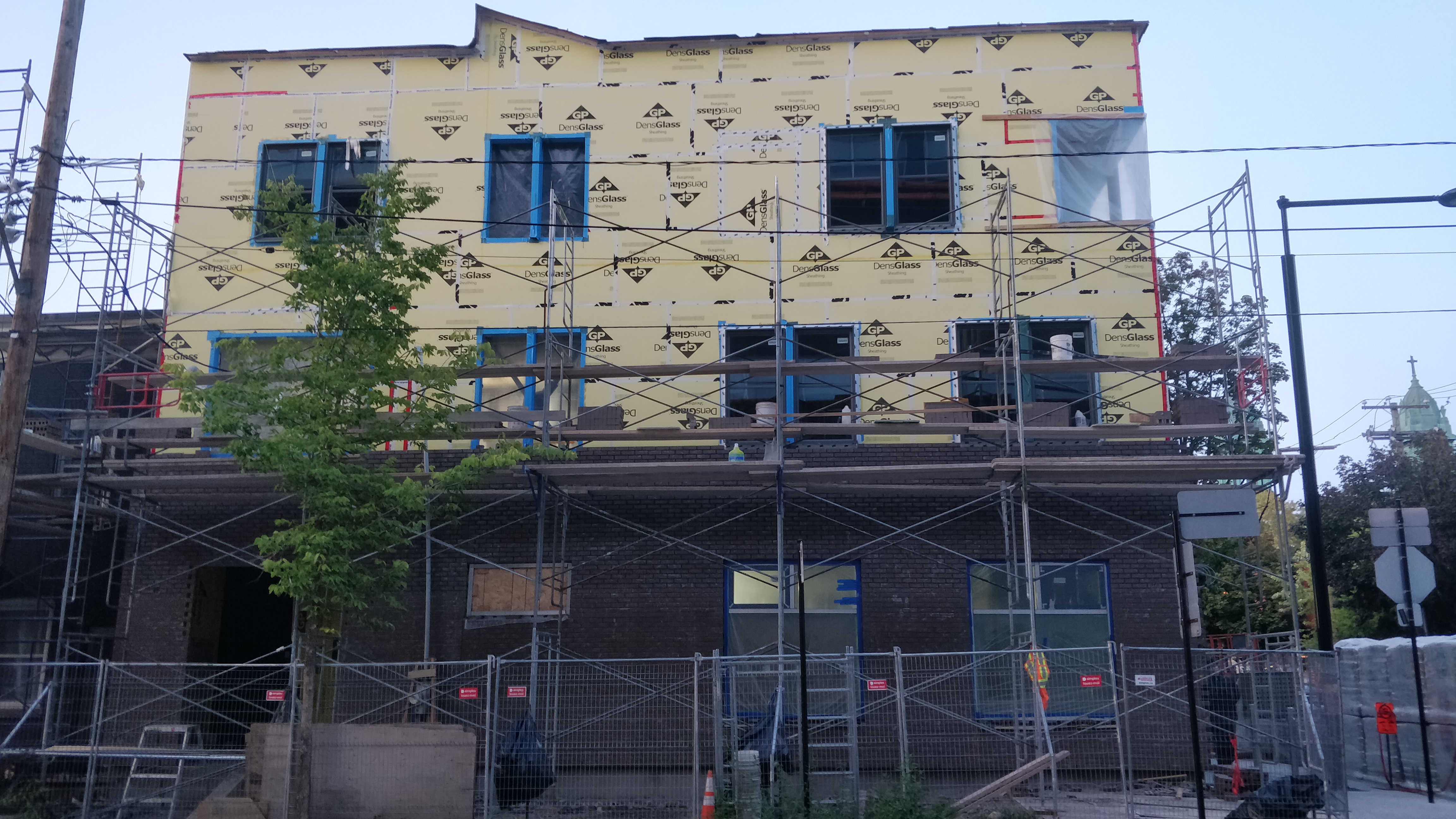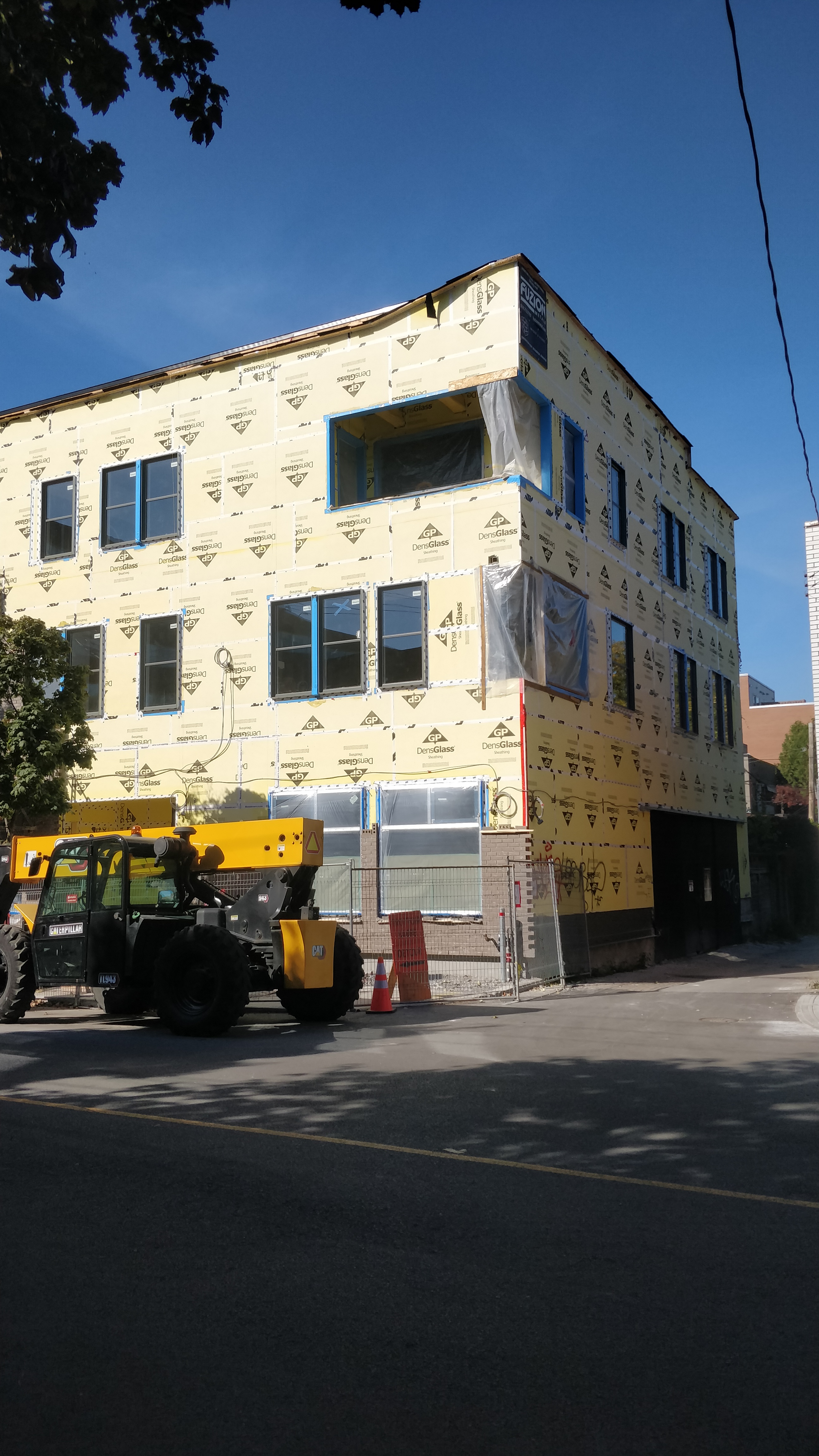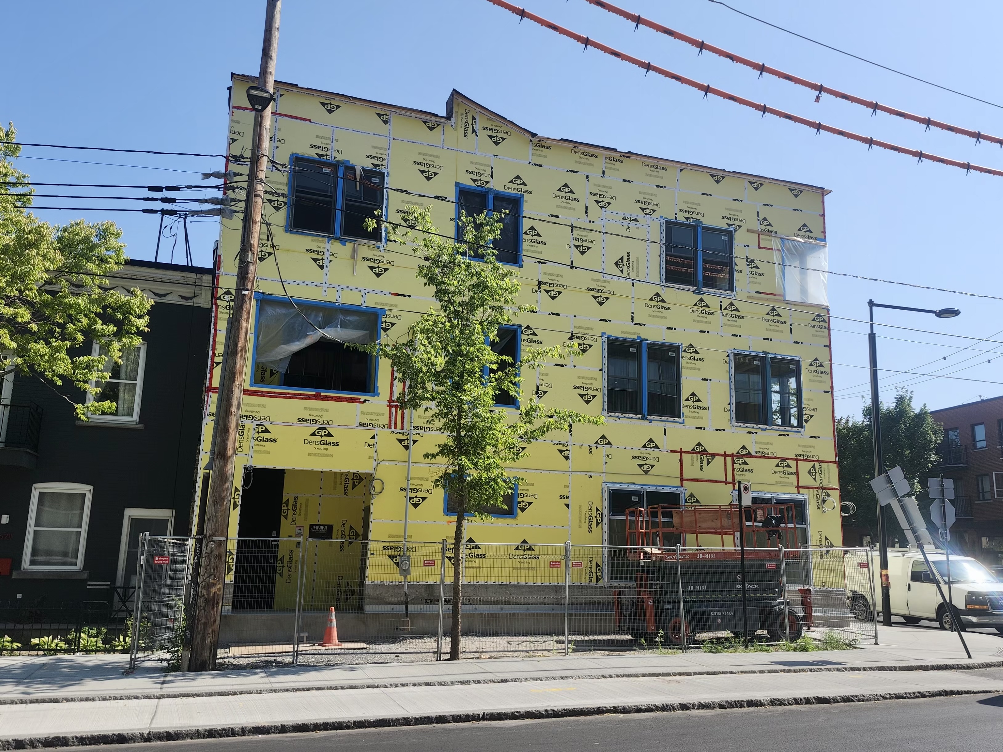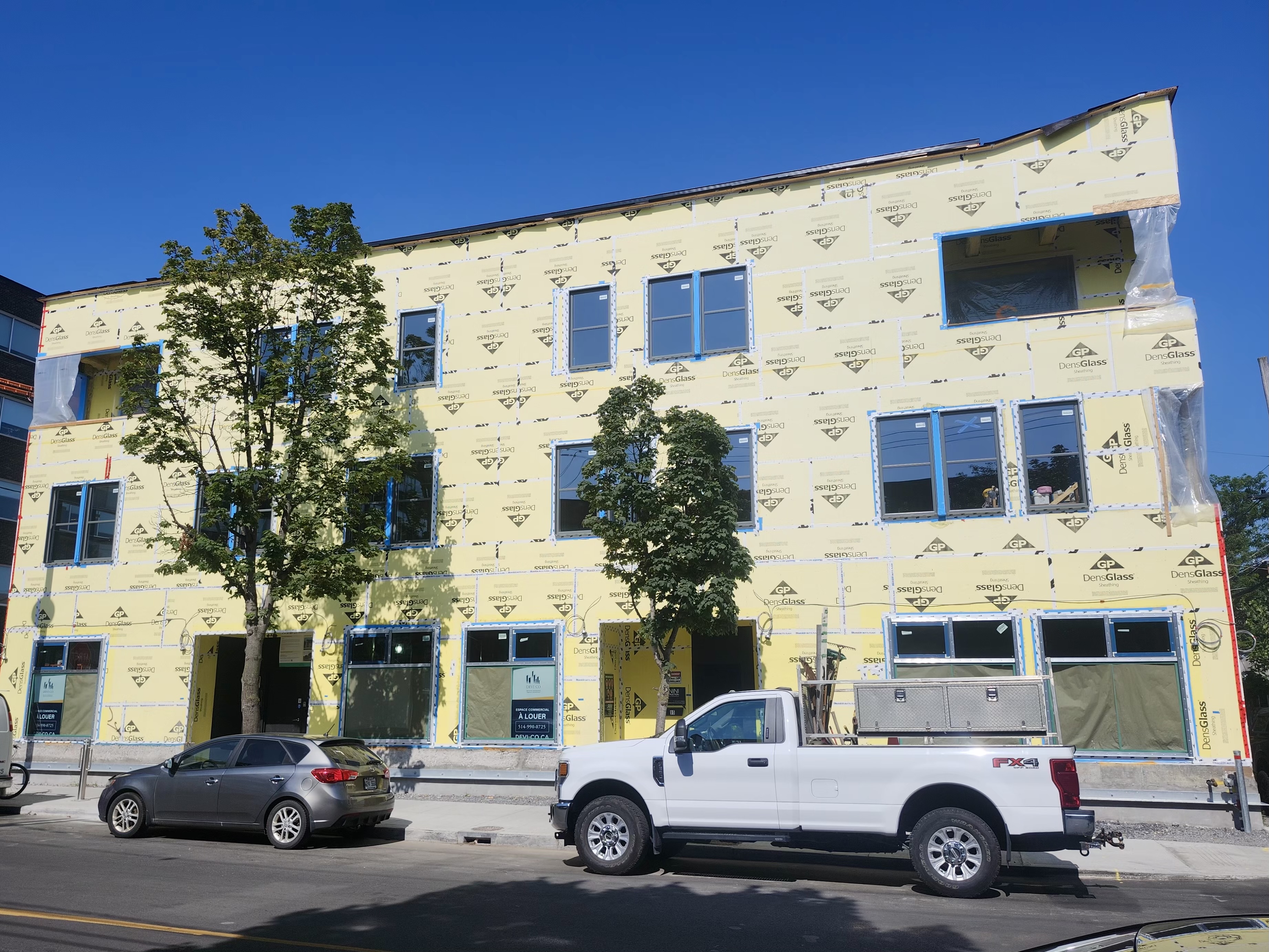 Les trous pour les fenêtres existent sous l’enveloppe actuelle, on dirait qu’ils ont fait ça pour fermer temporairement le chantier!