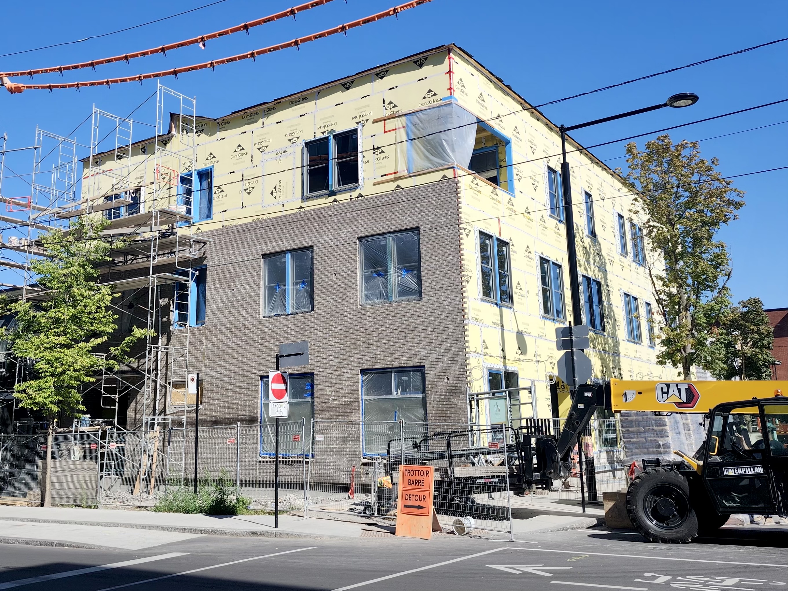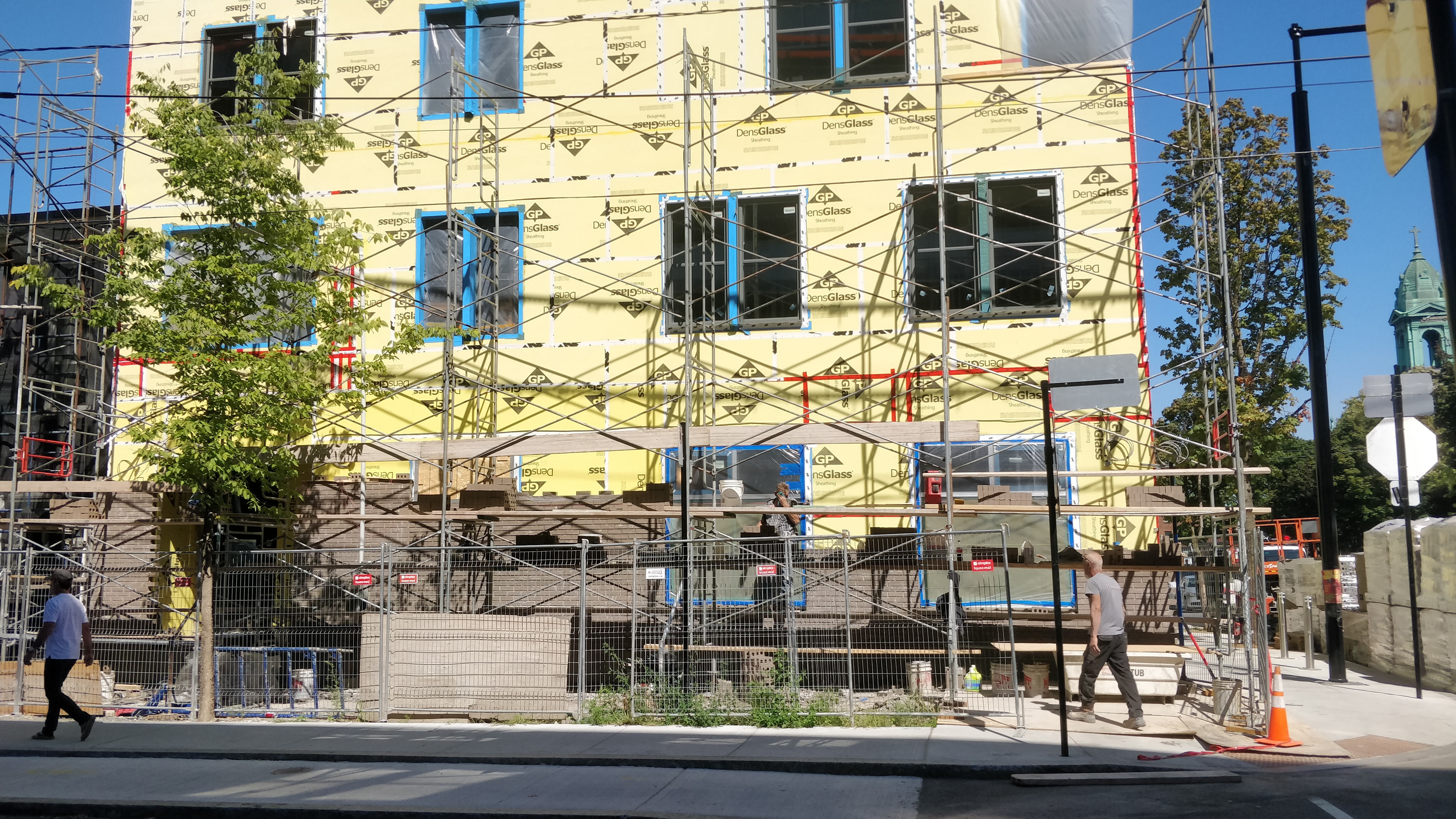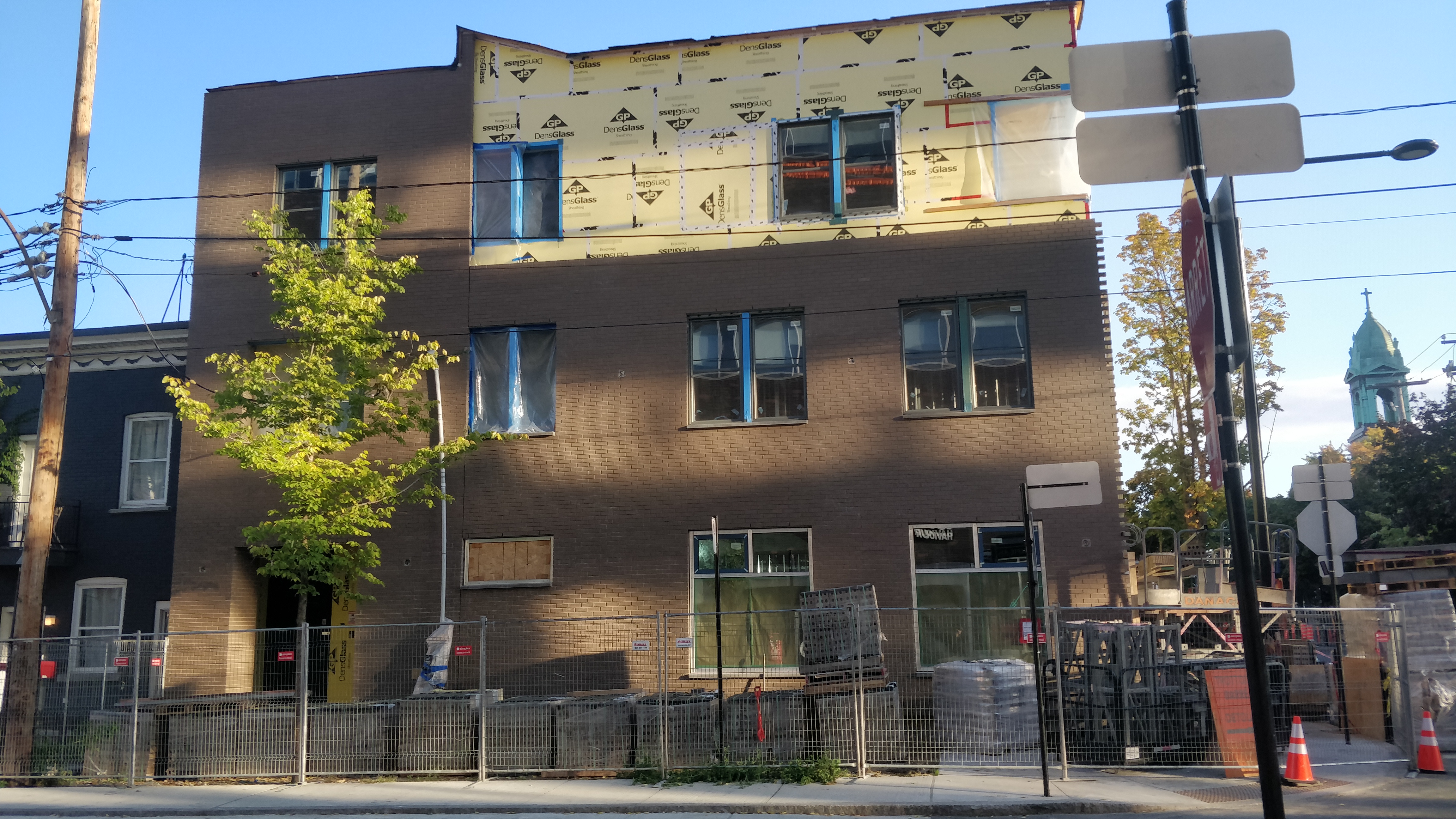 Les trous pour les fenêtres existent sous l’enveloppe actuelle, on dirait qu’ils ont fait ça pour fermer temporairement le chantier!