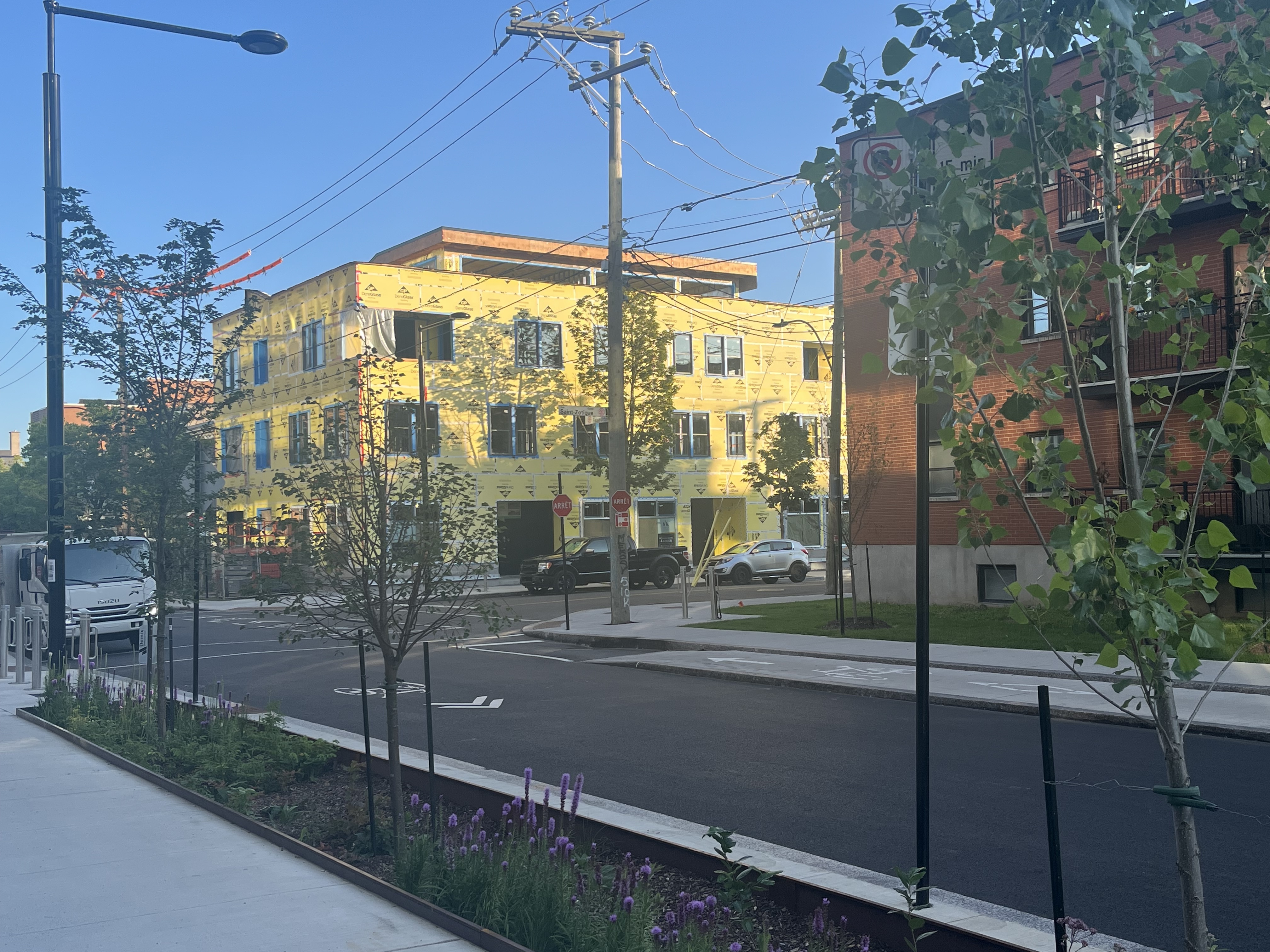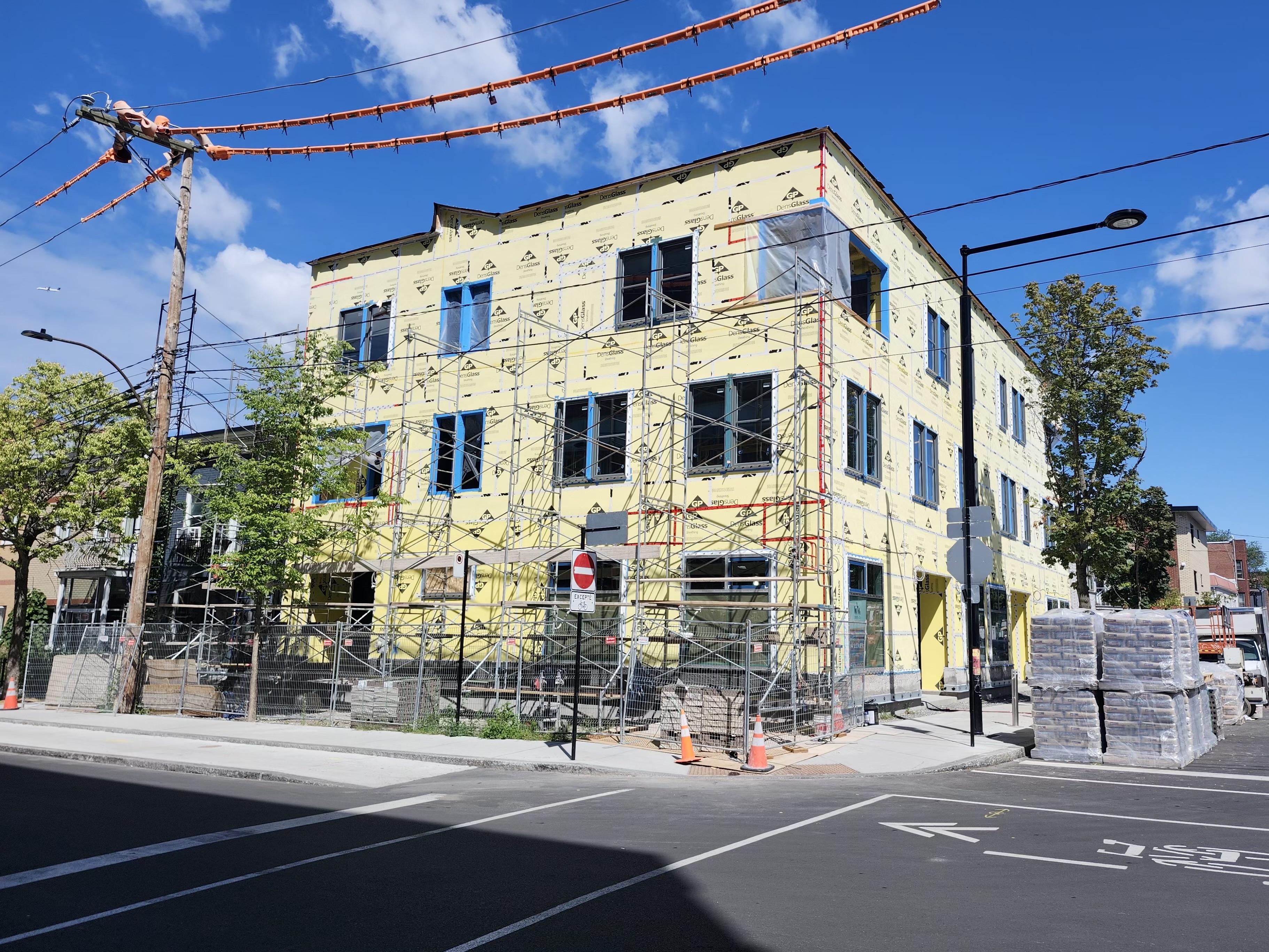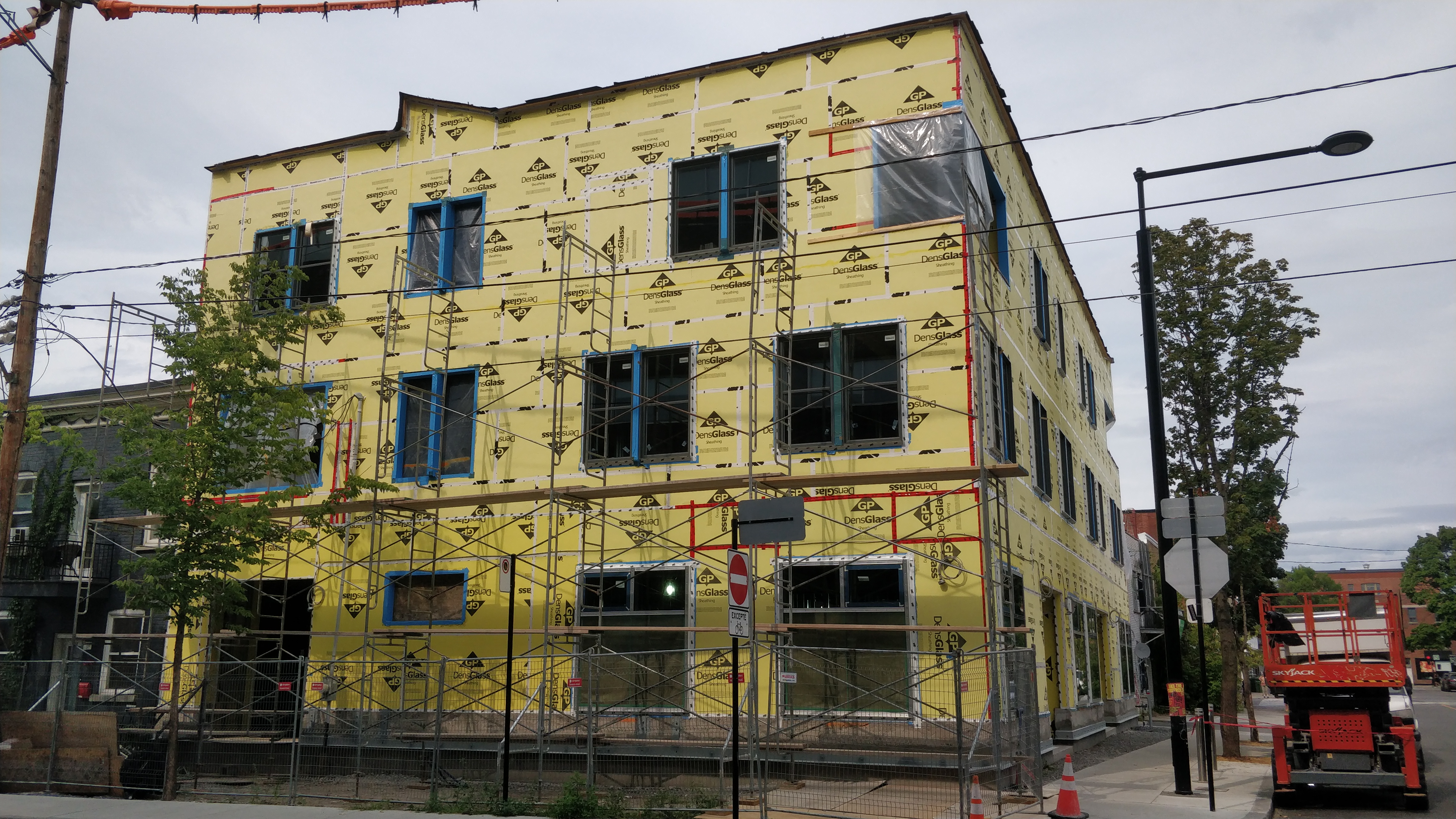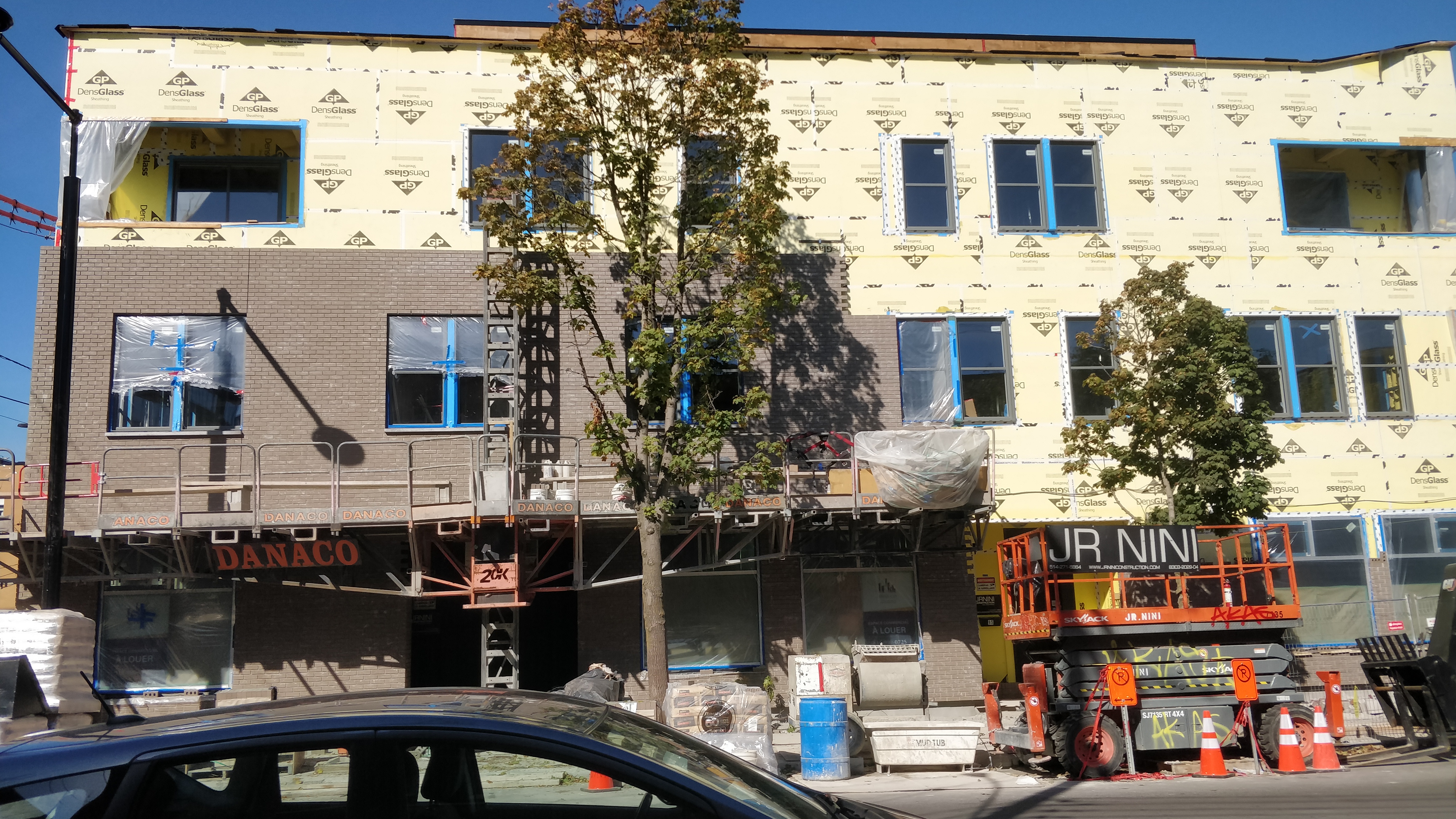 Les trous pour les fenêtres existent sous l’enveloppe actuelle, on dirait qu’ils ont fait ça pour fermer temporairement le chantier!