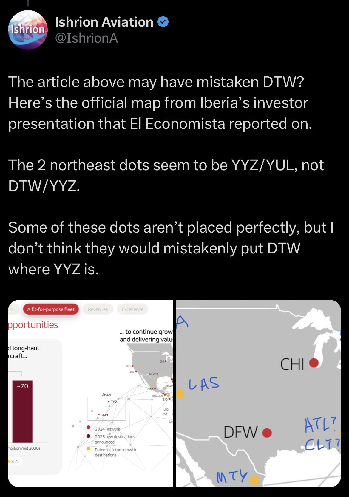 Some good news! It seems the article about Iberia’s future growth did not read the map correctly. They thought Toronto and Detroit were the cities marked for the future but a closer look shows it’s actually Toronto and Montreal!