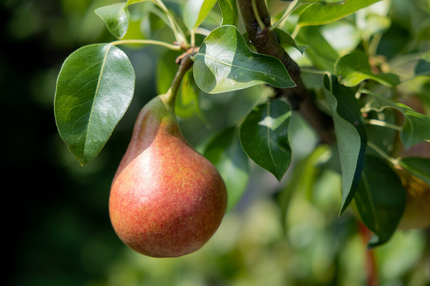 Une abeille se pose sur une grosse fleur rose et commence à la butiner. Au-dessus d’elle, la branche d’un arbre ploie sous le poids des dizaines de poires qu’elle porte. À quelques pas, un oiseau s’envole d’un petit arbuste.