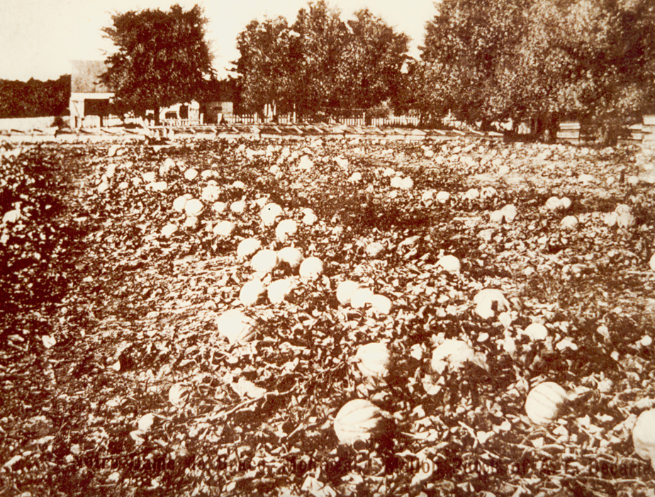 Sur le cliché, un certain M. Aubin pose au milieu d’un champ de Notre-Dame-de-Grâce. L’action se déroule en 1925. L’homme porte dans ses bras deux gros fruits alors qu’un inspecteur du ministère de l’Agriculture en tient un autre.