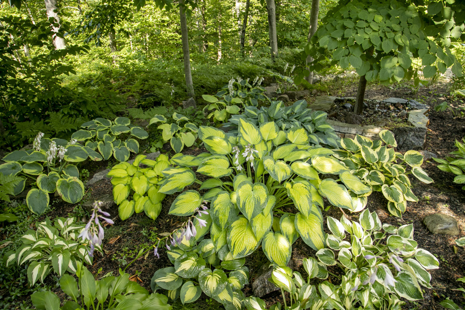 Plusieurs hostas s’épanouissent dans ce jardin ombragé.