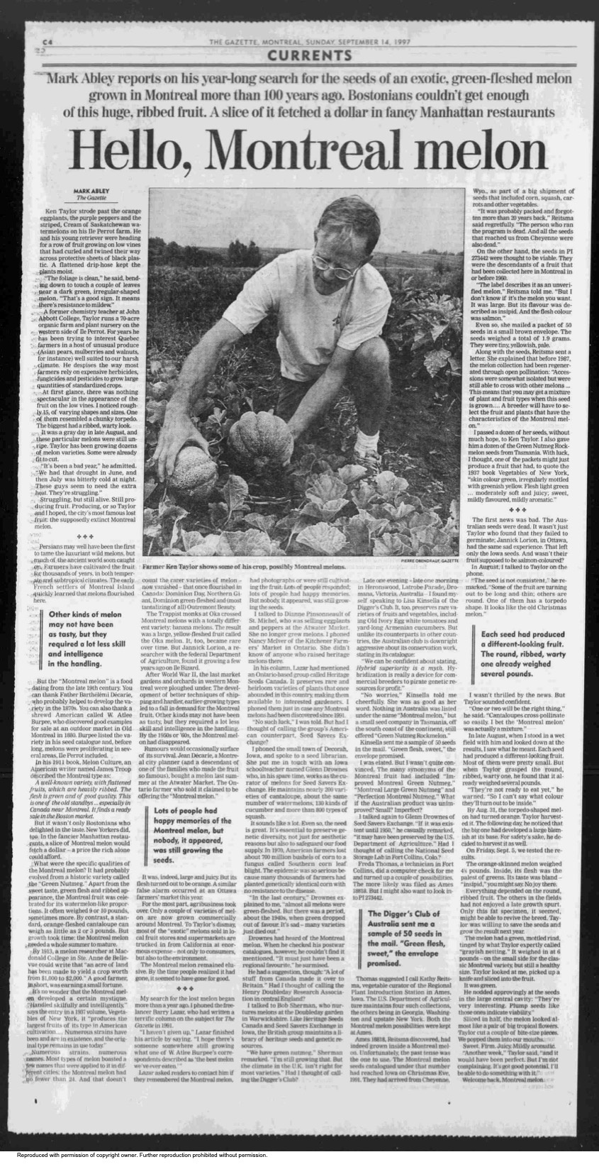 En 1997, un journaliste de la Gazette, Mark Abley, mène une grande enquête pour retrouver le fruit disparu. Il retrouve 50 graines de melon provenant de Montréal dans une banque de semences de l’Iowa. Il en confie une douzaine à un agriculteur de L’Île-Perrot.