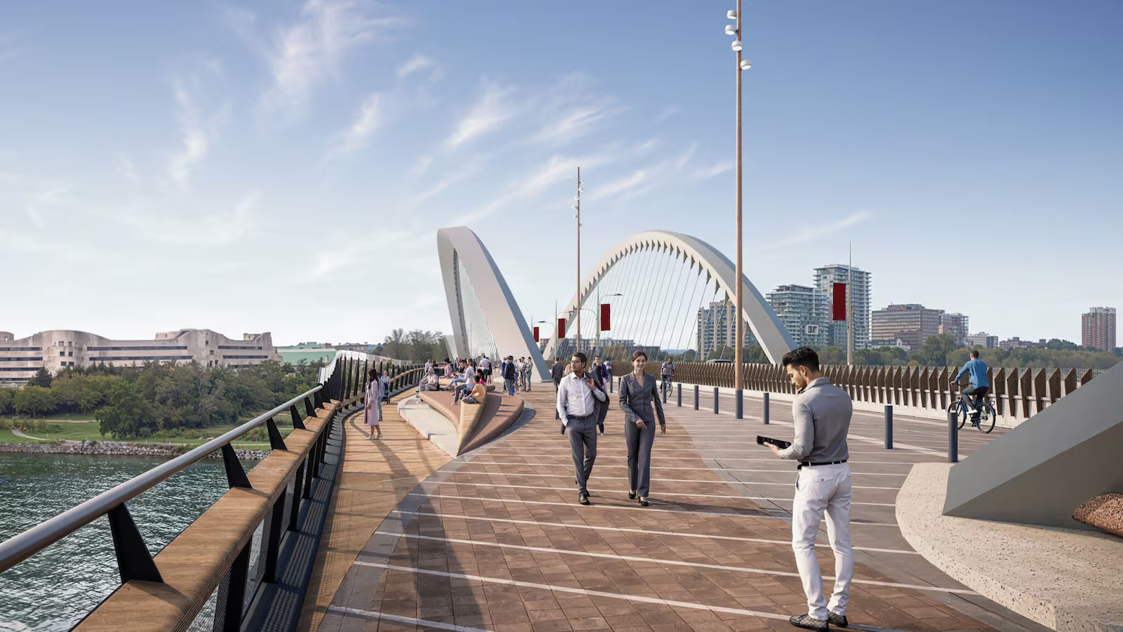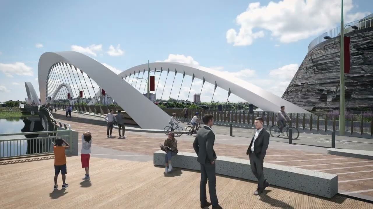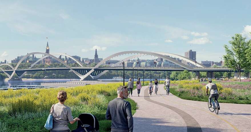 The new bridge design moves the current industrial design into the 21st century, with a triple archway spanning across the Ottawa River to connect downtown Ottawa with Gatineau.
