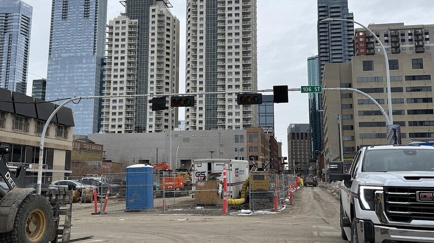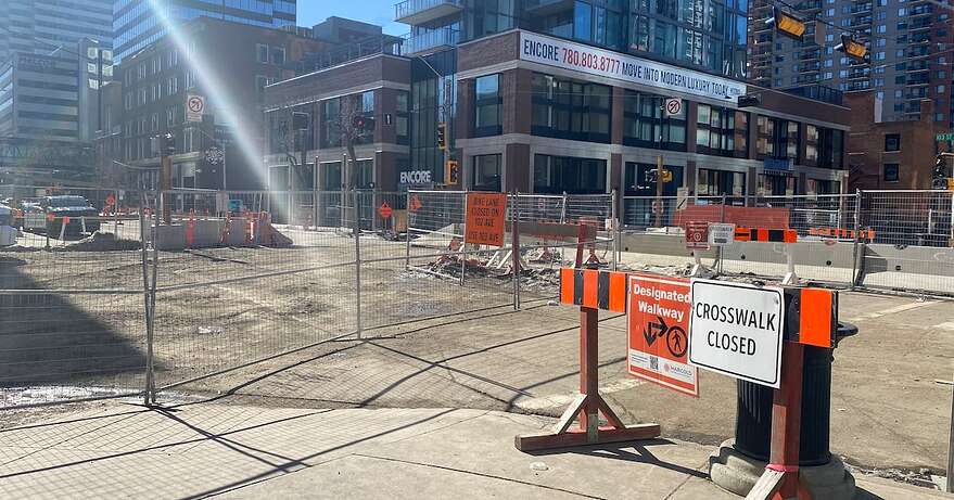 Au centre-ville d’Edmonton, ce ne sont pas les chantiers de construction qui manquent. Dans un quadrilatère de quelques mètres seulement, il y a pas moins de six chantiers en activité. Le plus imposant est celui du train léger. Sa construction est commencée depuis plusieurs mois et devrait durer jusqu’en 2029.