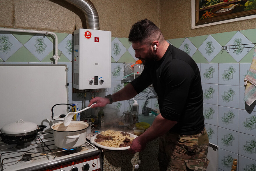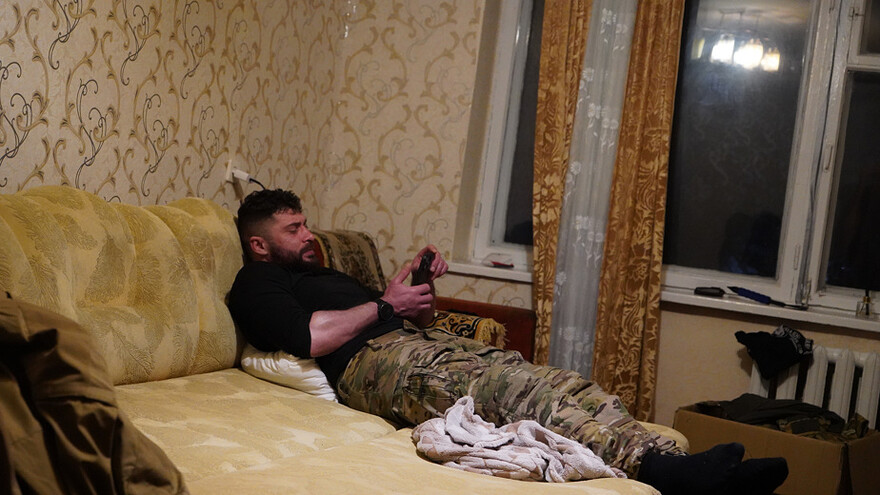 Dans une chambre à la lumière tamisée, derrière des rideaux couleur poussière, Adam*, nom de guerre Berkhi, un autre combattant tchétchène, s’attelle à sa prière. Des drones et des obus sont posés dans un coin. Sur le canapé, plusieurs fusils sont entassés en vrac.