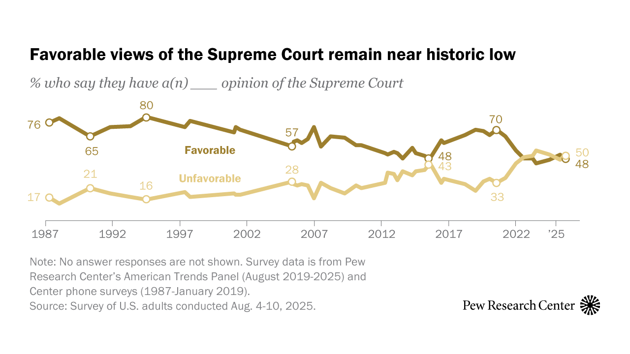 D’après le Pew Research Center, des majorités égales de démocrates et de républicains (87 % chacun) estiment que les juges ne devraient pas introduire la politique personnelle dans les décisions.