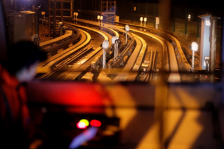 On peut voir la ligne de train passer perpendiculairement sur une structure en acier tubulaire au dessus des voies du metro.