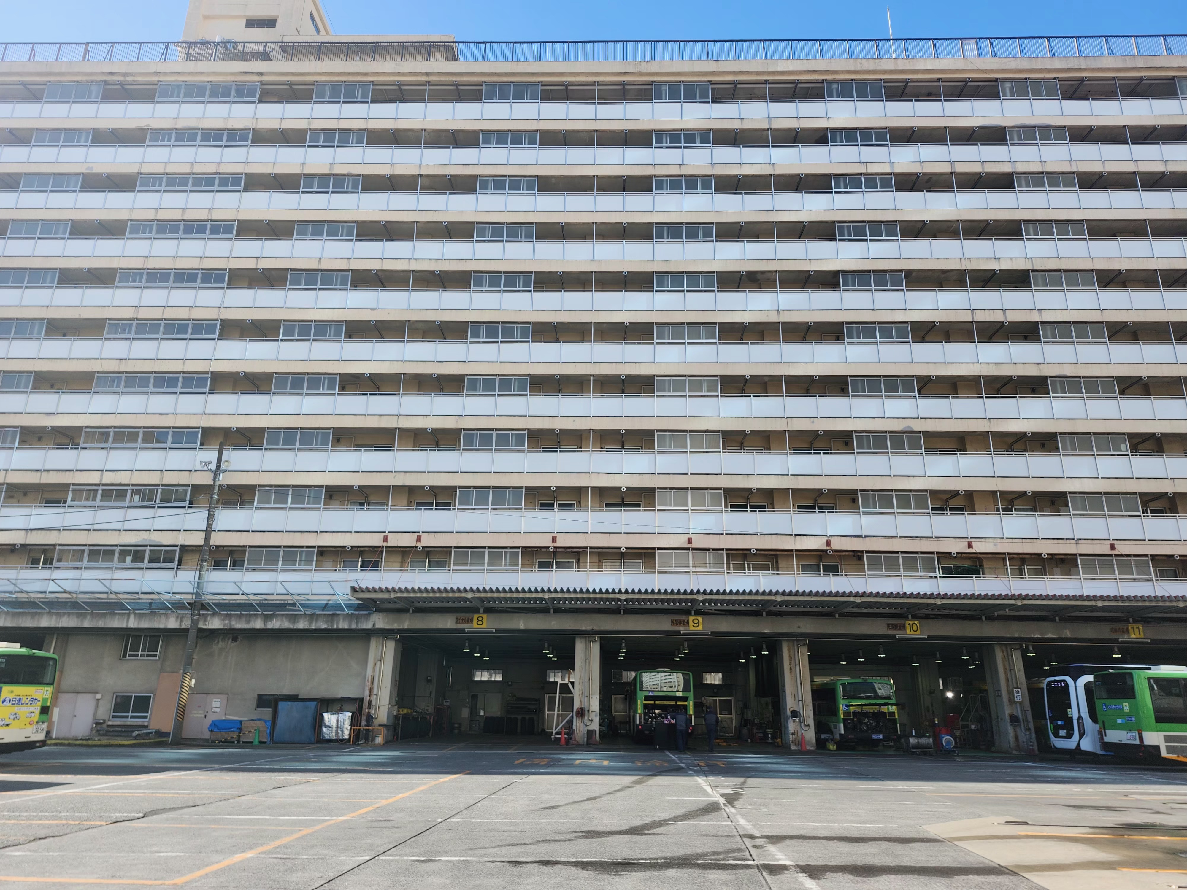 Petite curiosité, ce centre d’entretien d’autobus est au rez-de-chaussée d’un édifice résidentiel. Toute une mixité!