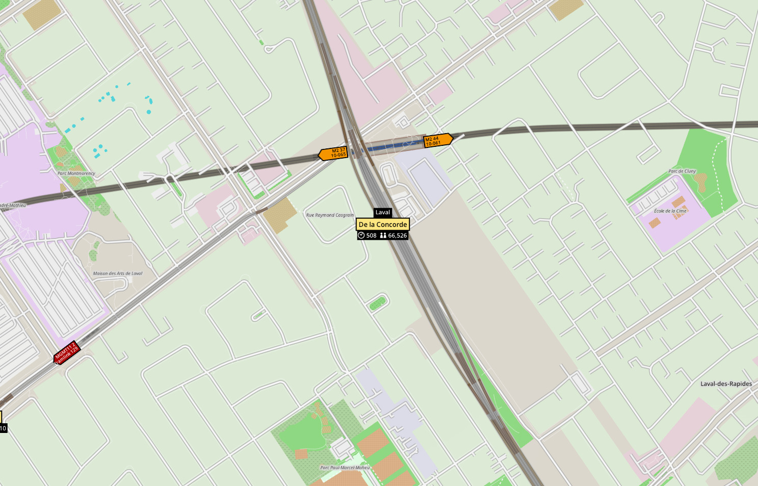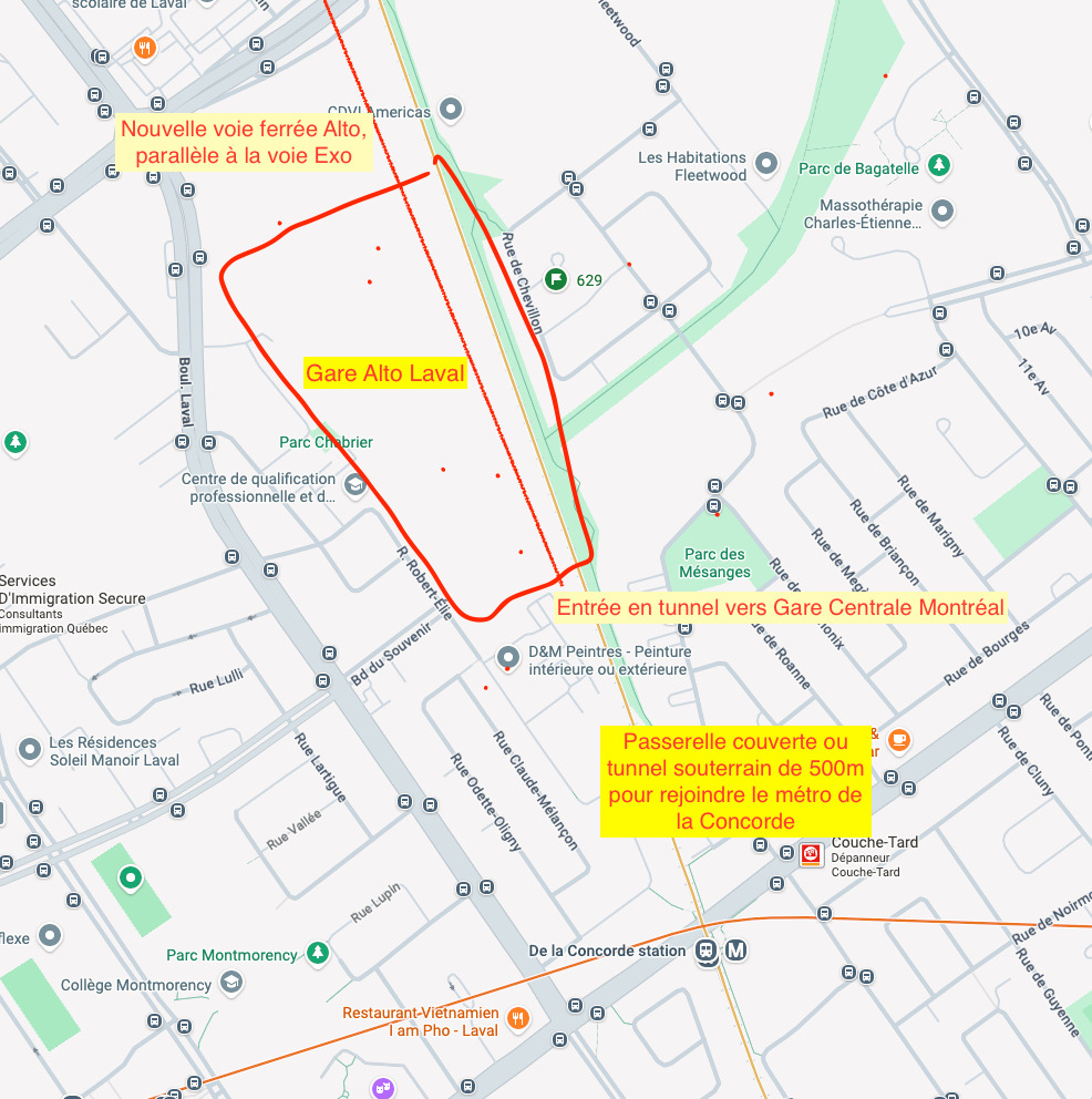 Après avoir lu les commentaires sur la gare de Laval, il apparaît que le site actuel de la gare Exo De la Concorde est trop contraint : espace limité, proximité immédiate de résidences et du parc Napoléon-Prud’homme, ce qui complique l’implantation d’une gare à grande vitesse.