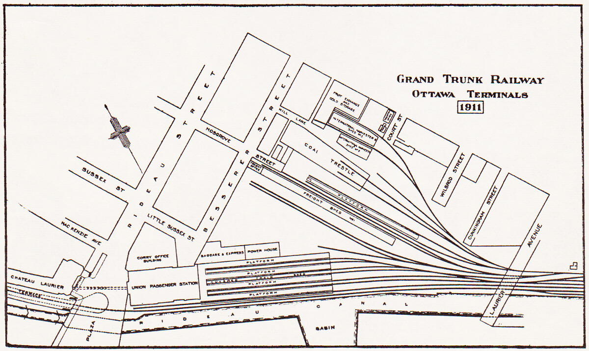 Mais l’ancienne gare ne fonctionnait pas en cul-de-sac à l’origine, n’est-ce pas? Les voies continuaient vers le nord en passant sous l’hôtel et en longeant le canal pour ensuite emprunter un pont et traverser la rivière en direction de Gatineau. C’est du moins ce que j’avais cru comprendre.