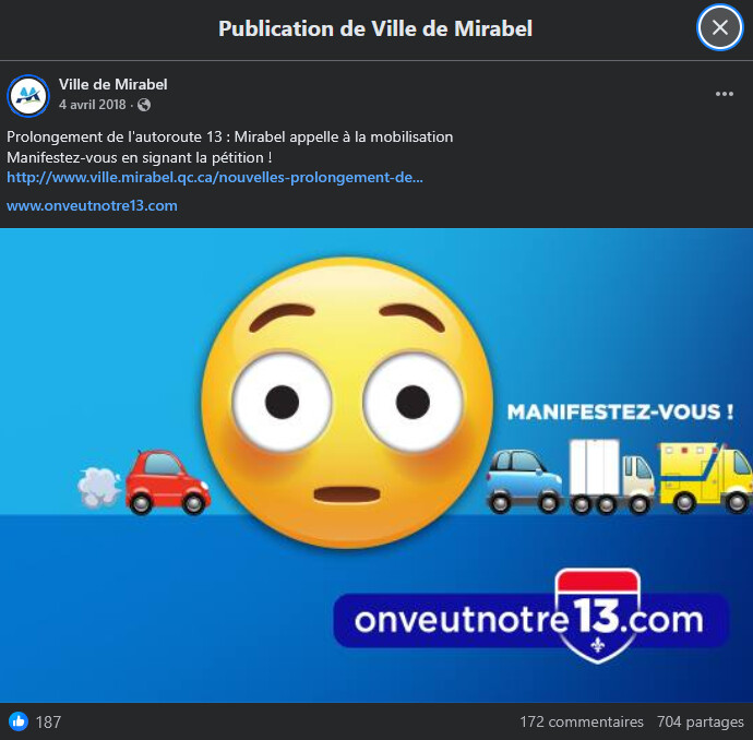 Et pourtant, sur la carte de 2016 sur le site de la ville de Mirabel, ils y affichent encore le prolongement de l’autoroute 13, sous la mention «réseau routier structurant planifié» !