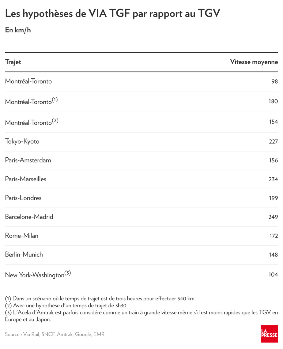 M. Imbleau avait prévenu les lecteurs que cet exemple ne signifiait pas que les trains atteindraient cette vitesse au Canada. L’exemple témoignait, disait-il, de la cohabitation entre les tronçons à haute vitesse et les arrêts plus fréquents sur d’autres segments.