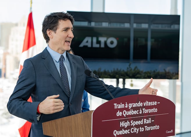 Le premier ministre Justin Trudeau annonce un nouveau réseau ferroviaire à grande vitesse pour le corridor Toronto-Québec à Montréal, le mercredi 19 février 2025. (Christinne Muschi/Archives La Presse Canadienne)