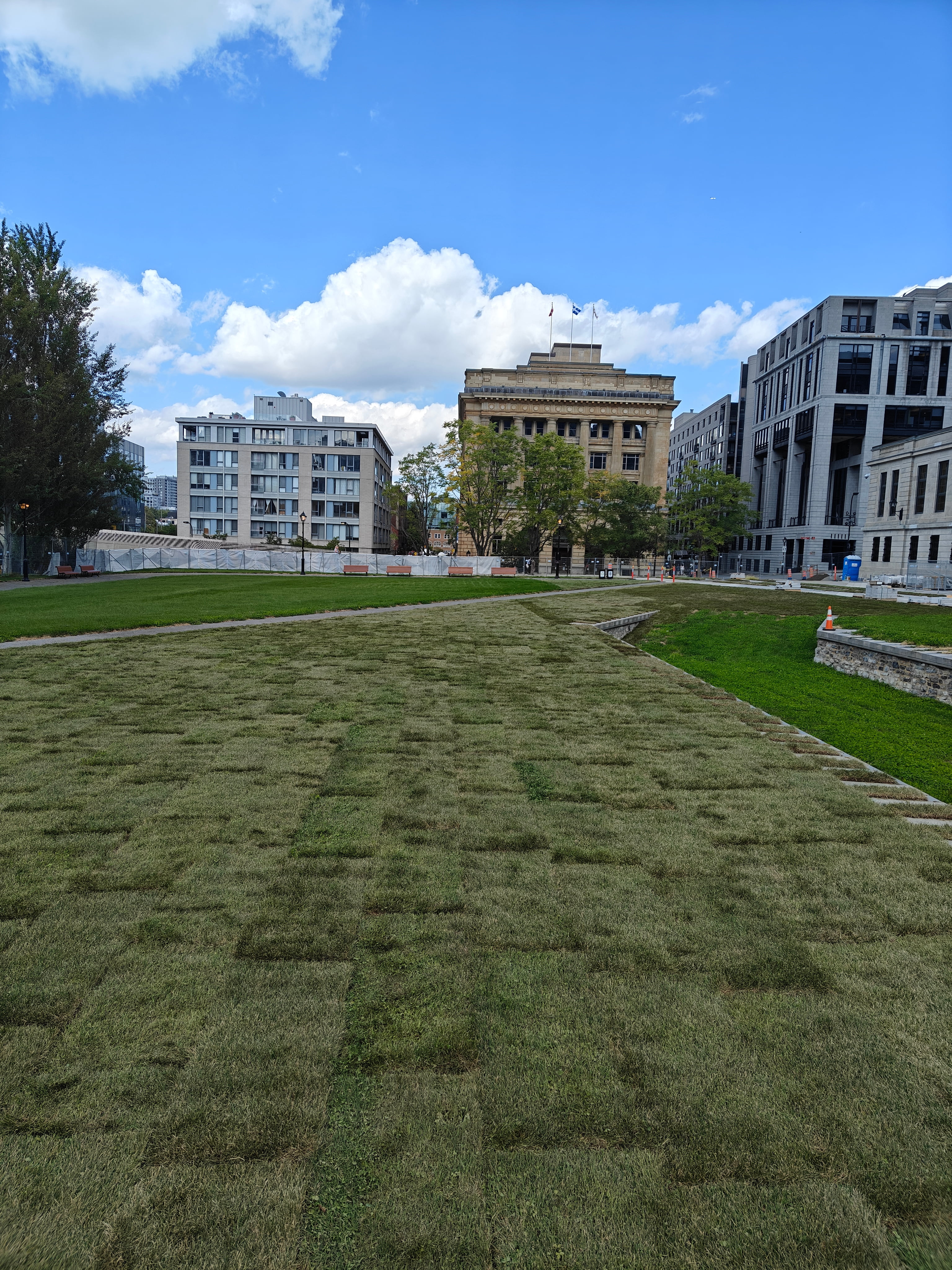 Le gazon a été posé. Très hâte au jour où la traverse au-dessus des vieilles fortifications sera complétée.