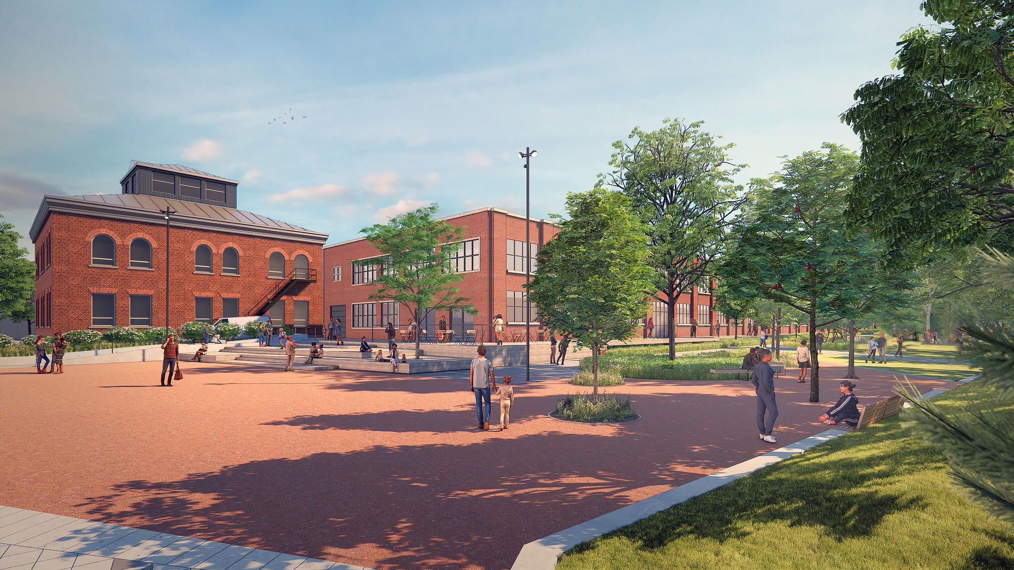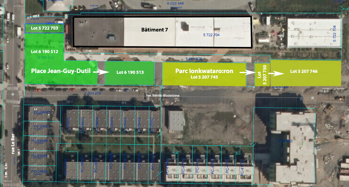 La place publique Jean-Guy-Dutil se déploiera à l’entrée du Bâtiment 7 et offrira un espace de détente et de regroupement. Une rampe d’accès assurera l’accessibilité universelle.