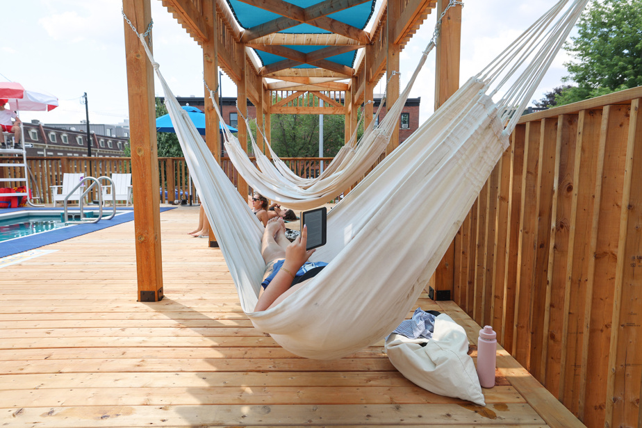 Étendue dans un des hamacs qui longent la piscine, Théo Dubuc-Carbonneau se repose après une courte baignade. « Je viens ici souvent, même qu’avec mon copain, on se donne parfois rendez-vous ici à l’heure du midi durant nos journées de travail », ajoute la résidante d’Hochelaga, qui a aussi fréquenté la première mouture du projet, en 2022.
