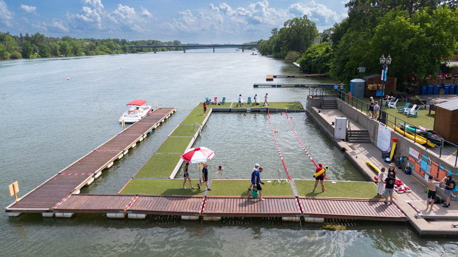 L’implantation de ce projet unique au Québec a été facilitée par le fait que la Ville possède son propre quai et que les tests menés l’été dernier ont démontré que l’eau est baignable plus de 90 % du temps. Les corridors de nage aménagés en eau libre sont généralement dans des lacs, et non en rivière, ou dans le fleuve, comme le bain portuaire du bassin Louise, à Québec1.