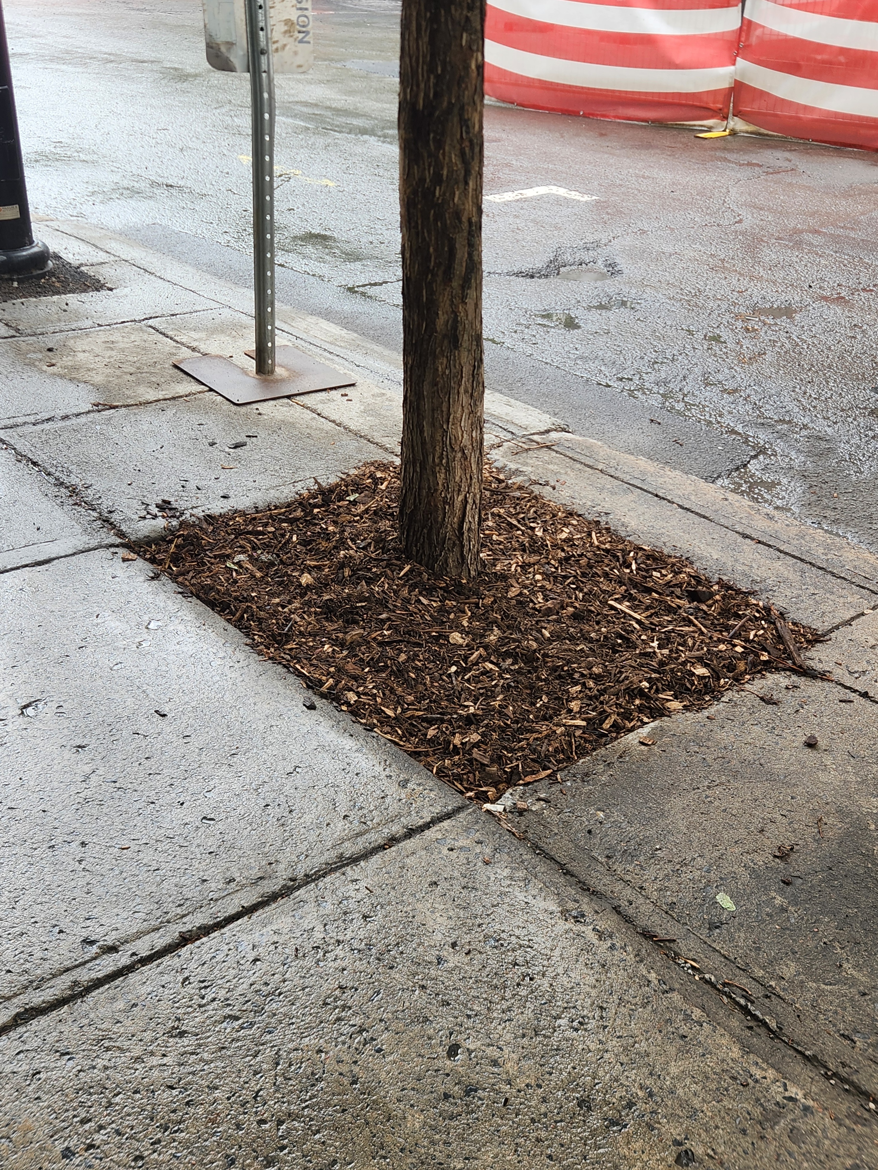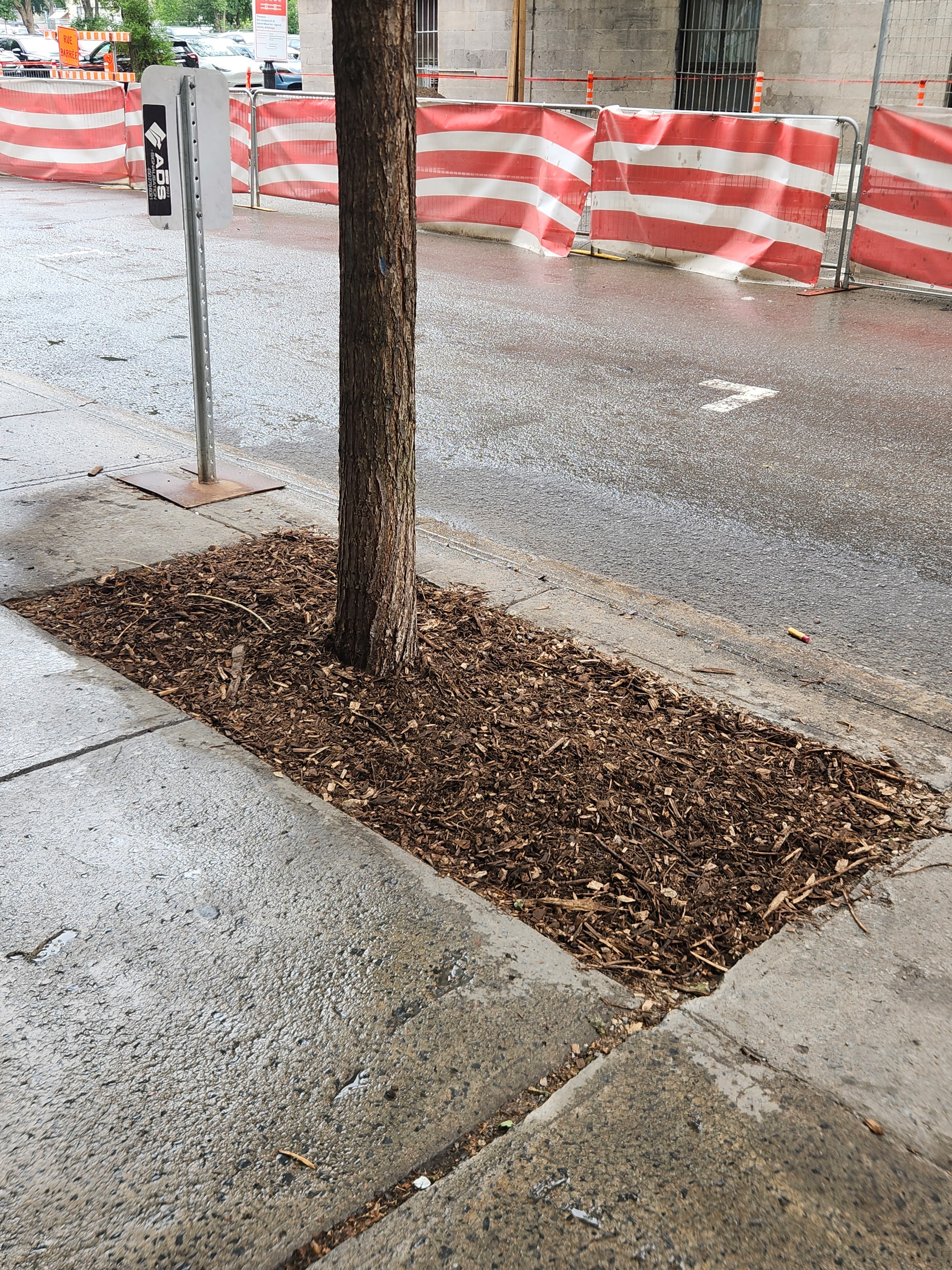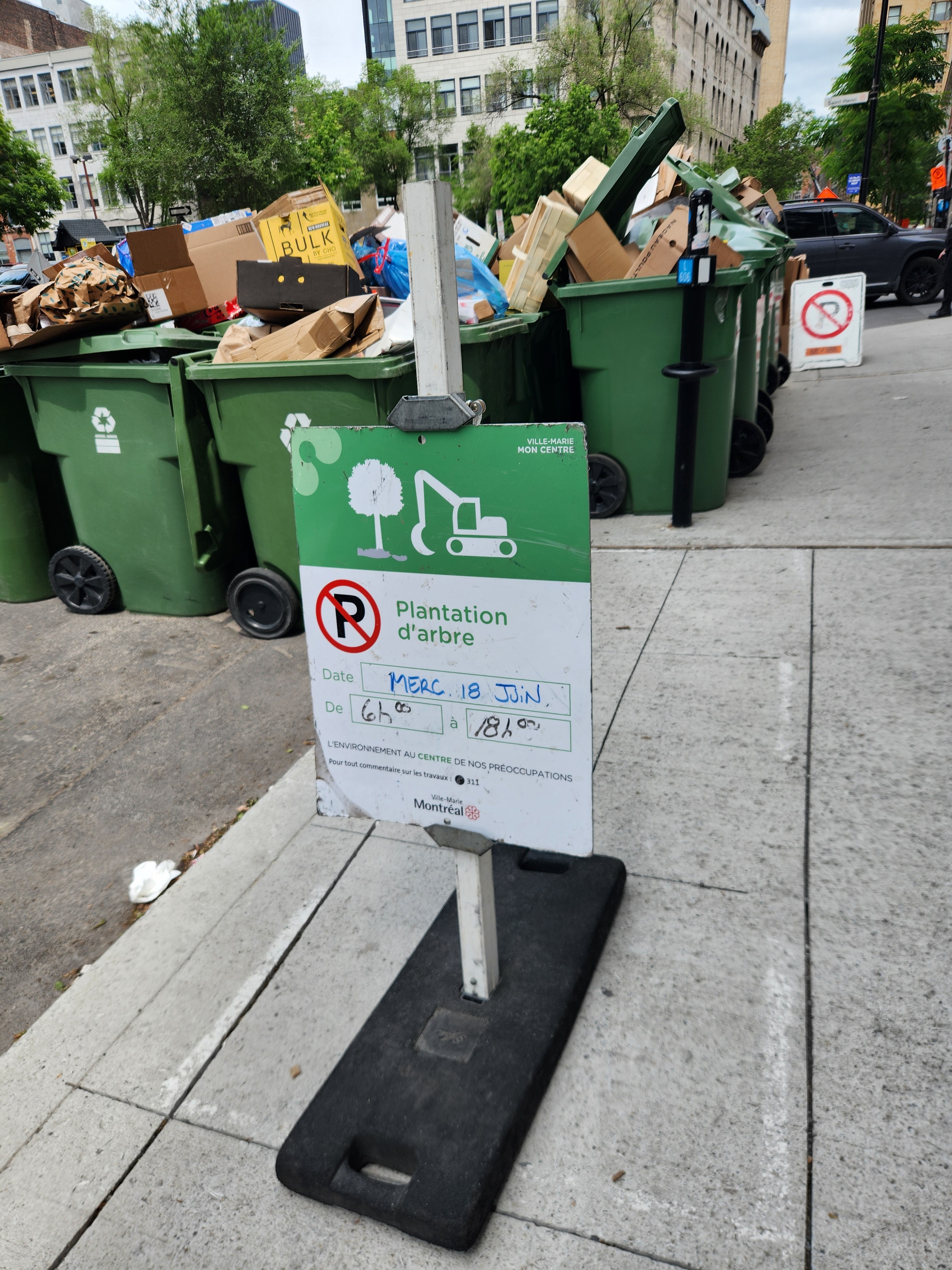 Le trottoir a été coulé par la Ville de Montréal. J’étais sur place lors du coulage et les employés de la ville ont balayé du revers de la main le fait qu’il fallait laisser des espaces pour les arbres. Un an plus tard, la ville scie le béton pour en planter. Ça vous donne une idée de la désorganisation ![]()