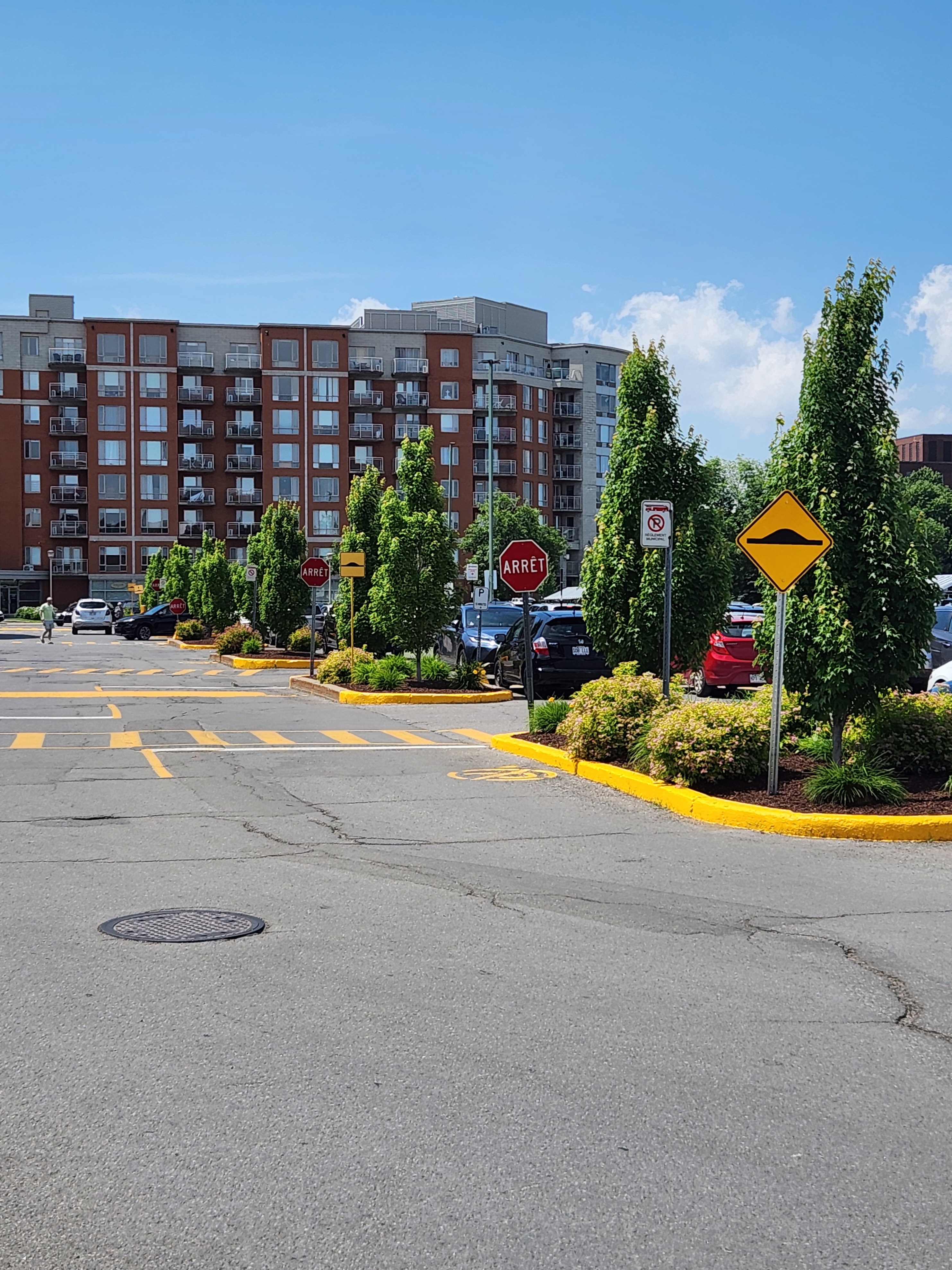 Des arbres plutôt jolis et bien garnis dans le stationnement du centre commercial “Le Village” sur l’Ile des Soeurs.
