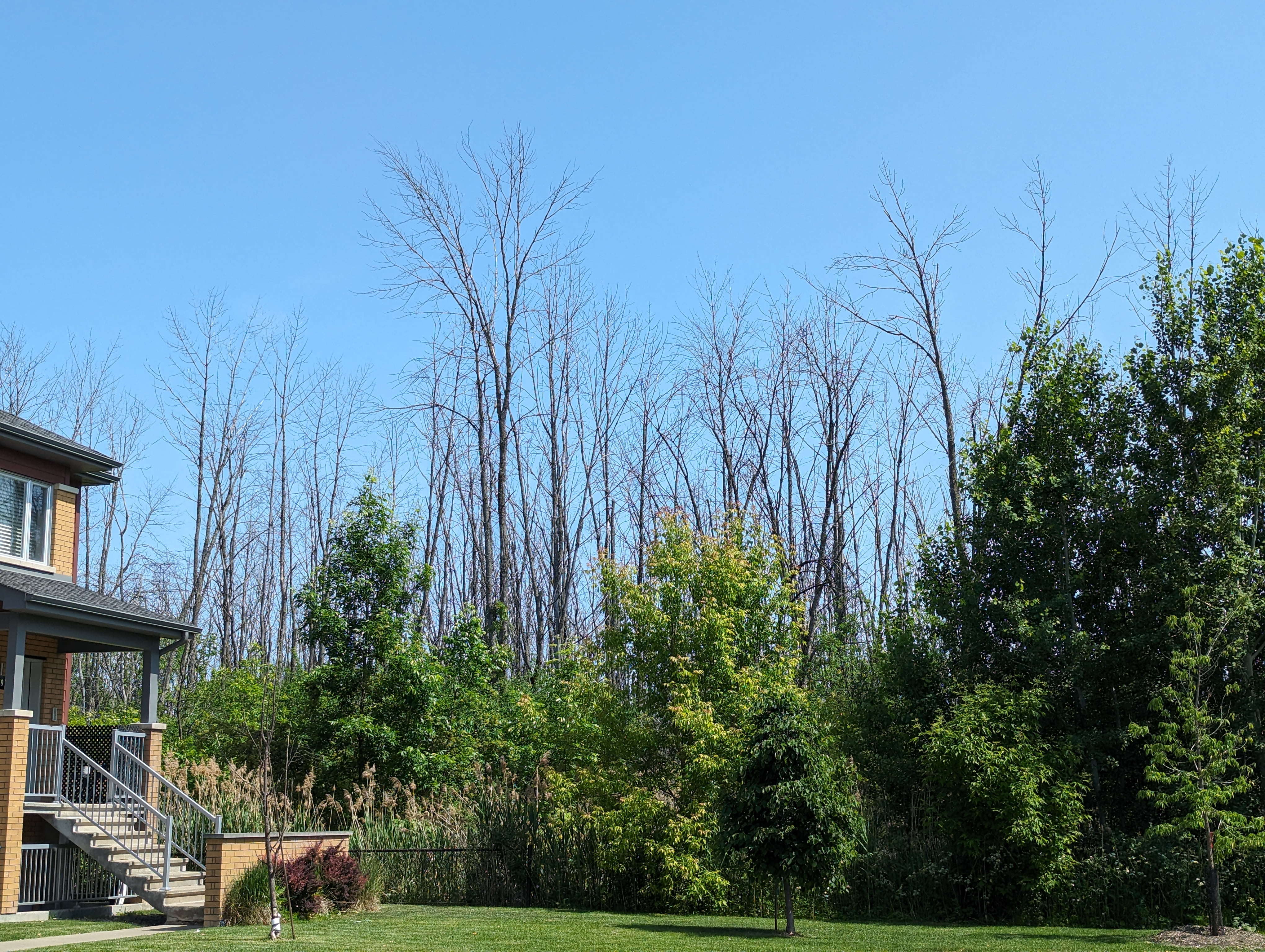 Ce sont tous des frênes morts par l’agrile. Ce genre de boisé est assez commun dans la région de Montréal. Ce sont d’anciennes friches agricoles, très souvent humides, qui ont été peuplés par les frênes qui adorent ce type de conditions.