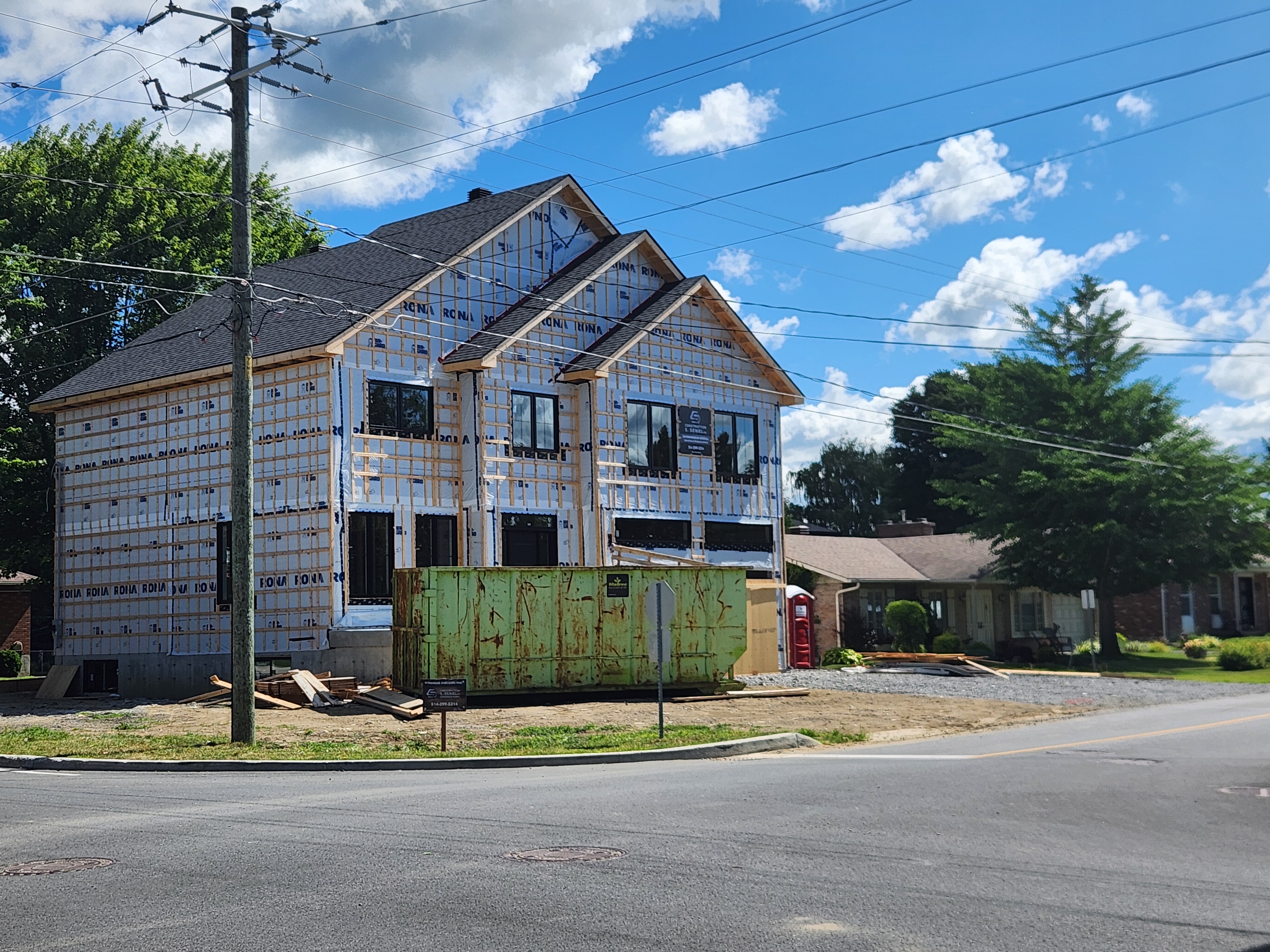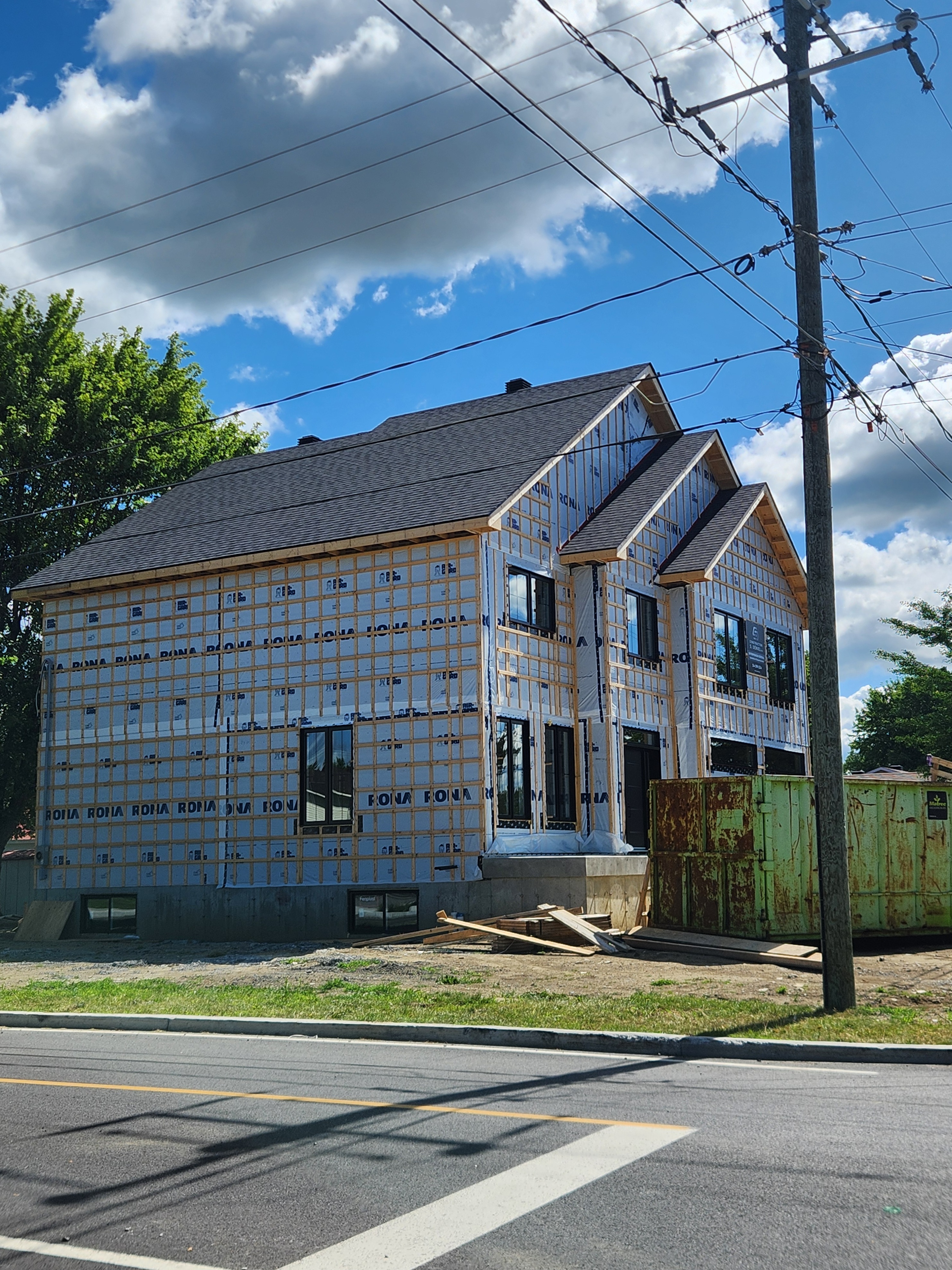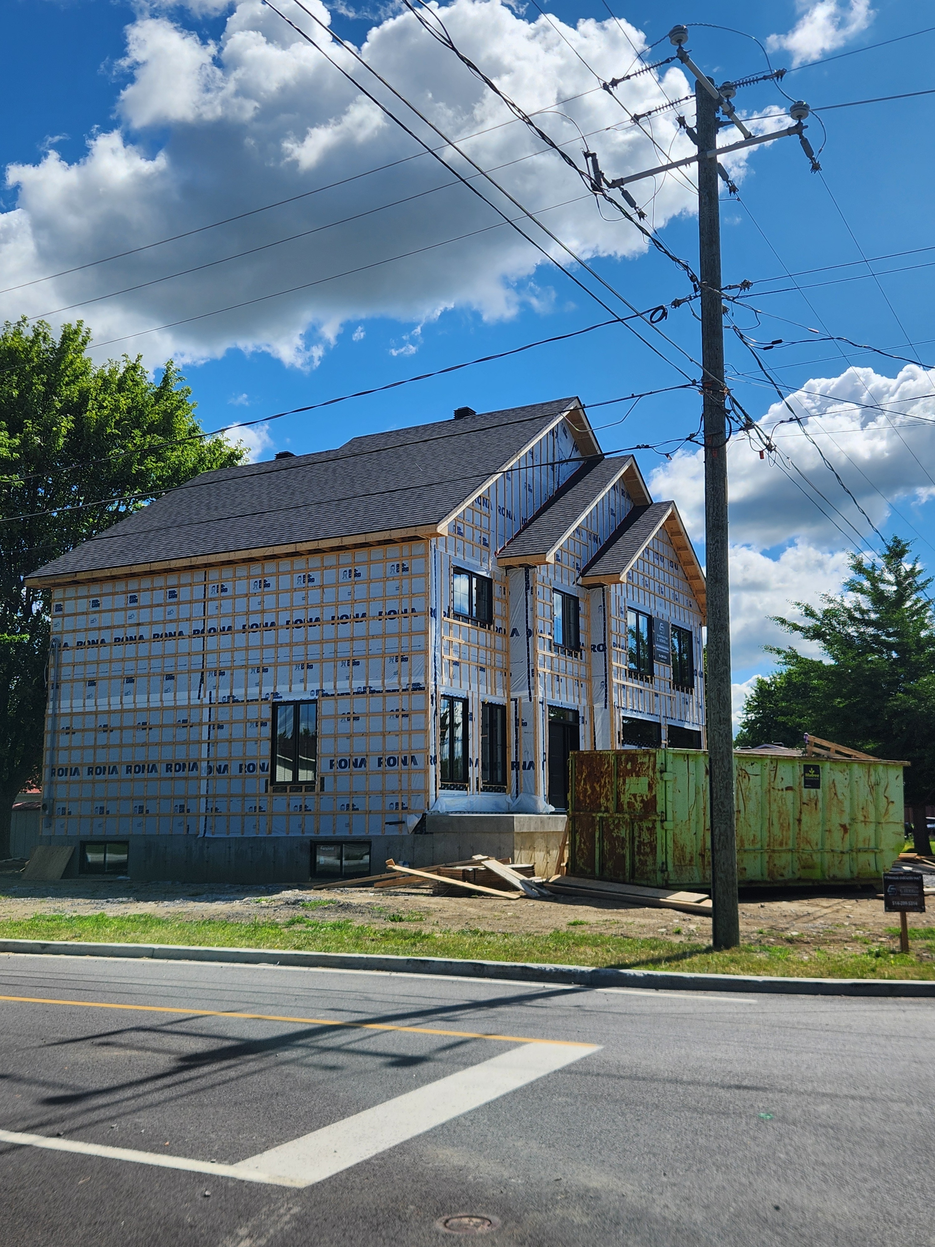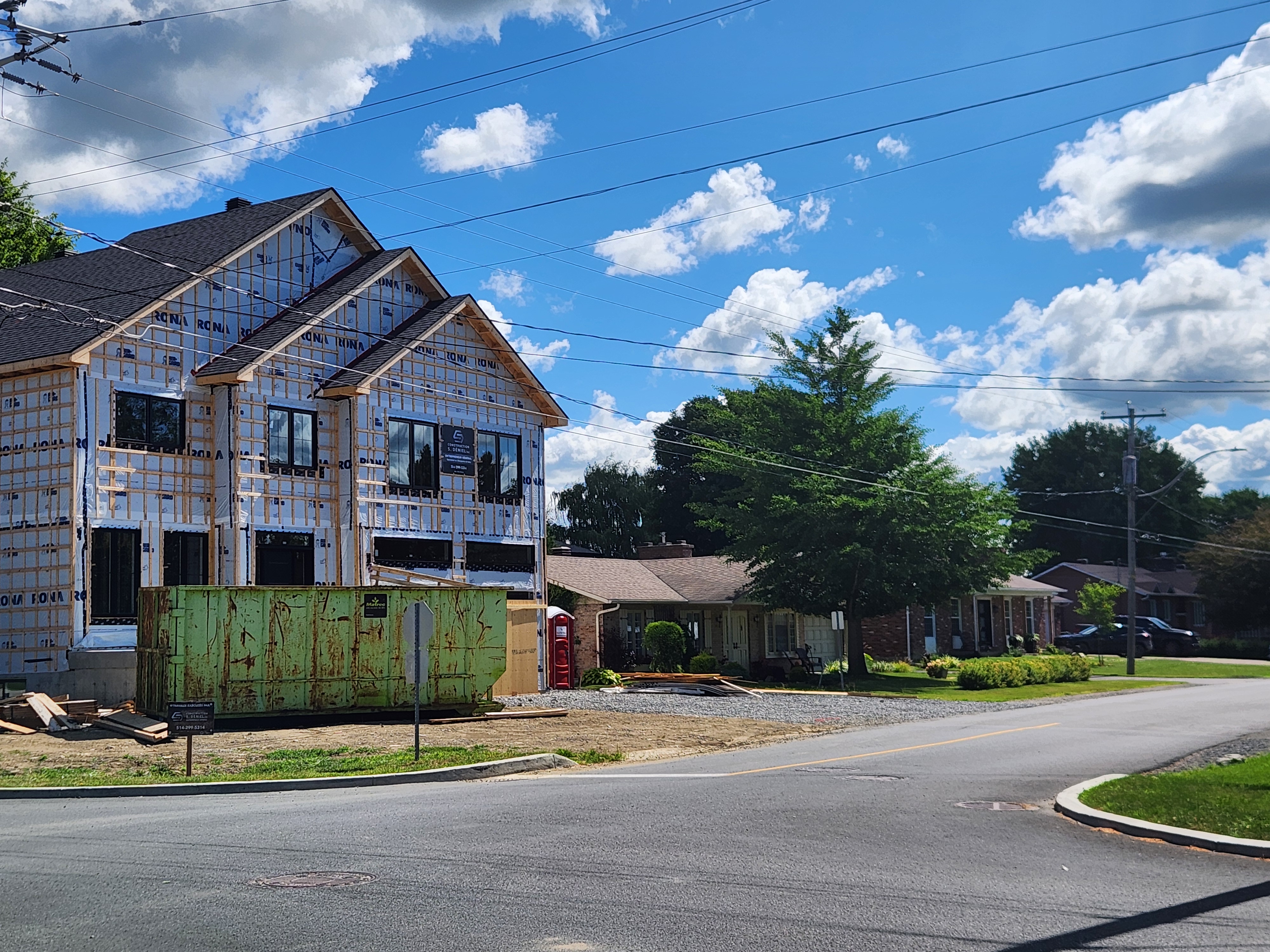 Toujours intéressant de comparer l’architecture des maisons de banlieue à travers les époques. Je constate que depuis les années 2000, les proportions des maisons au Québec ont vraiment grossi. Cette maison unifamiliale en construction actuellement, sur un coin de rue, tranche avec la petitesse des maisons directement à sa droite, construites dans les années 60-70. Il y a de plus en plus de ces dychotomies sur le territoire.