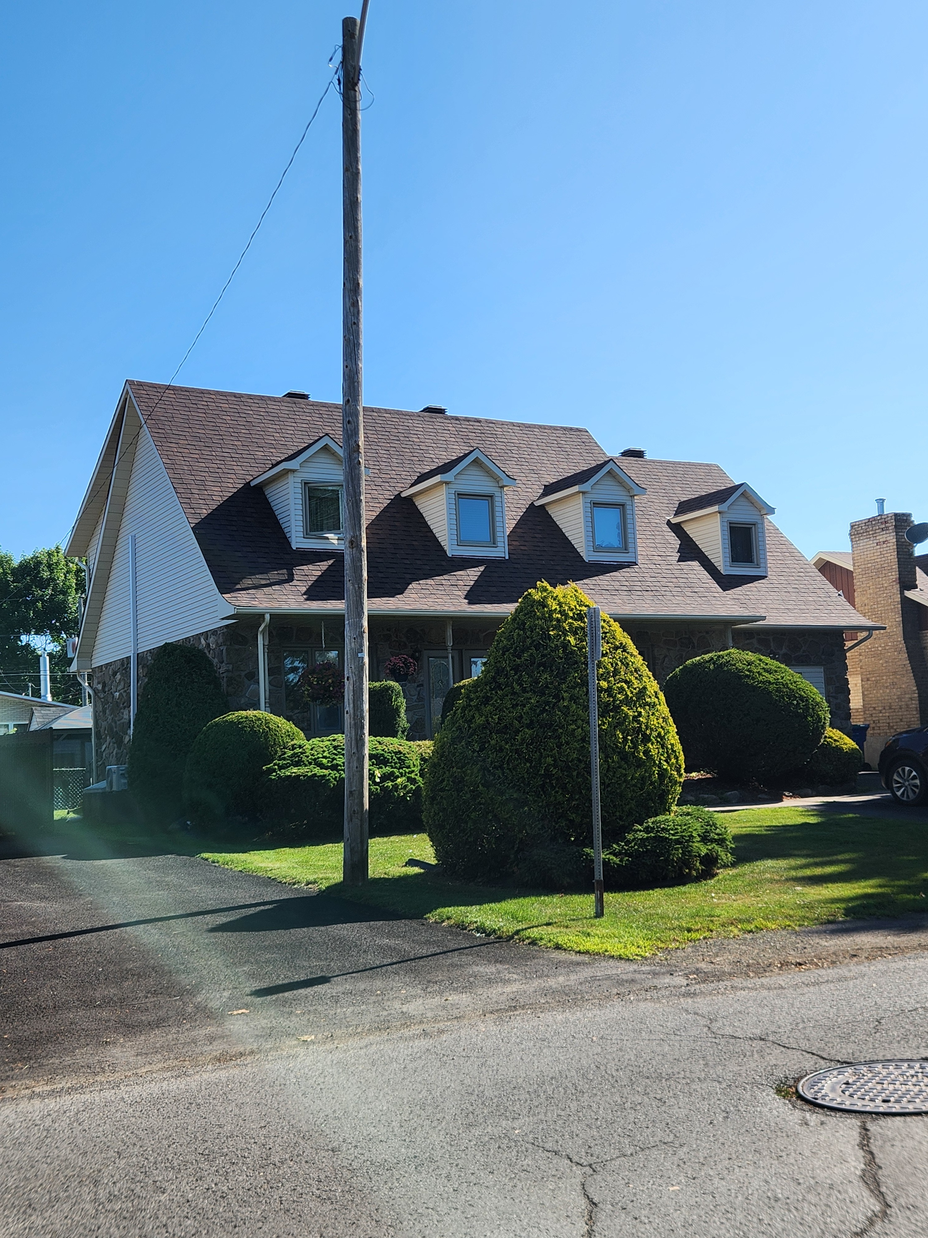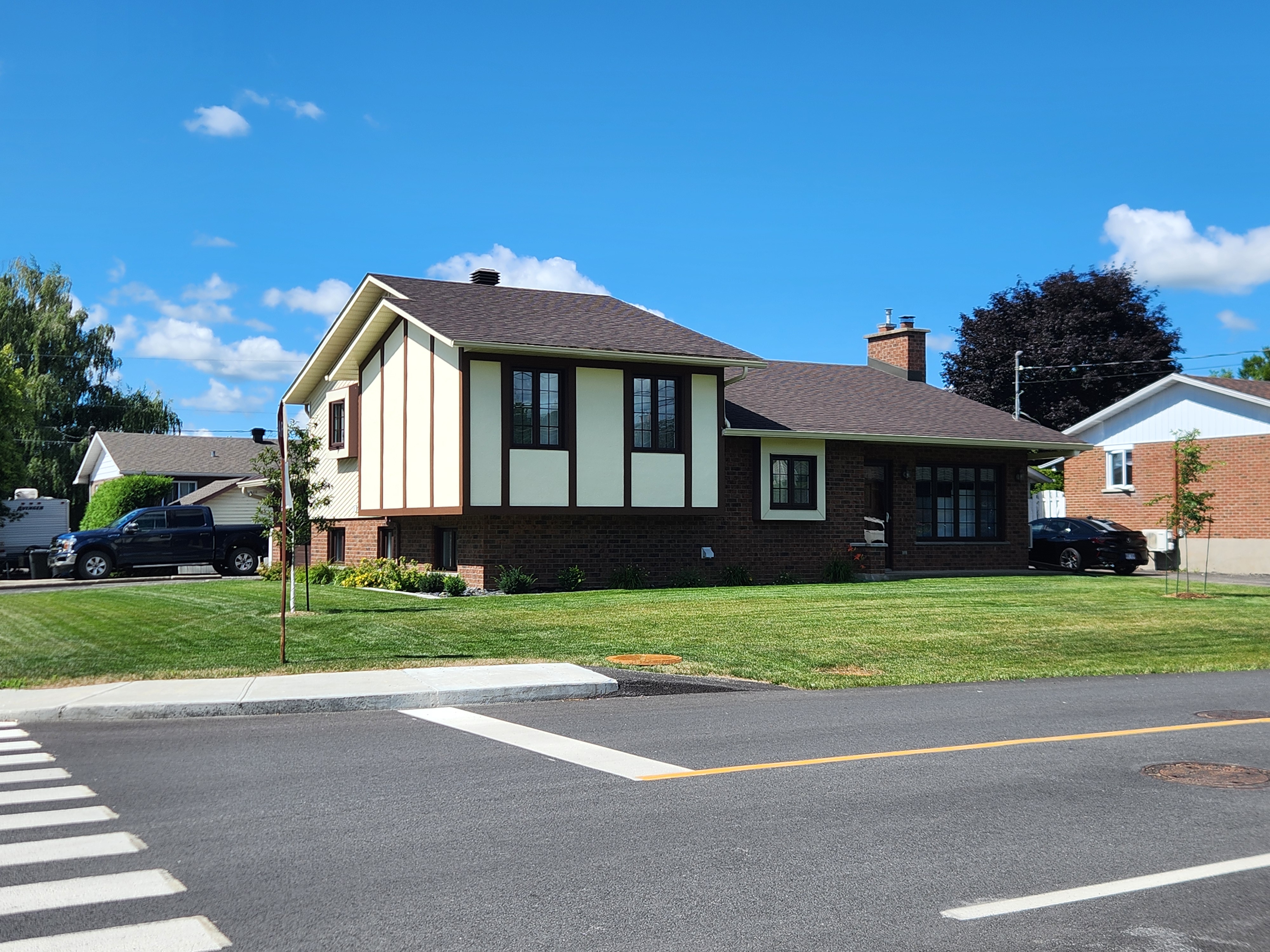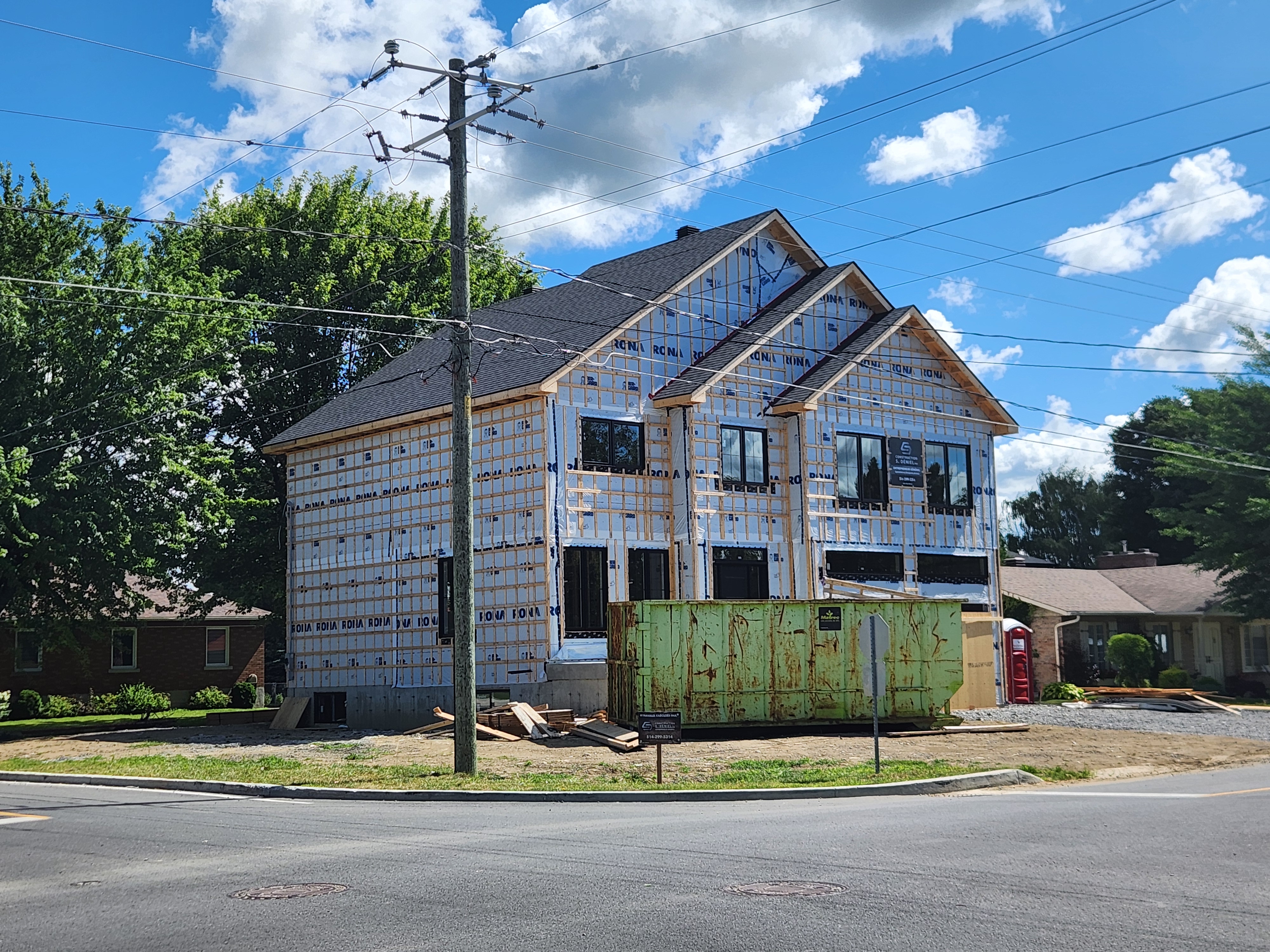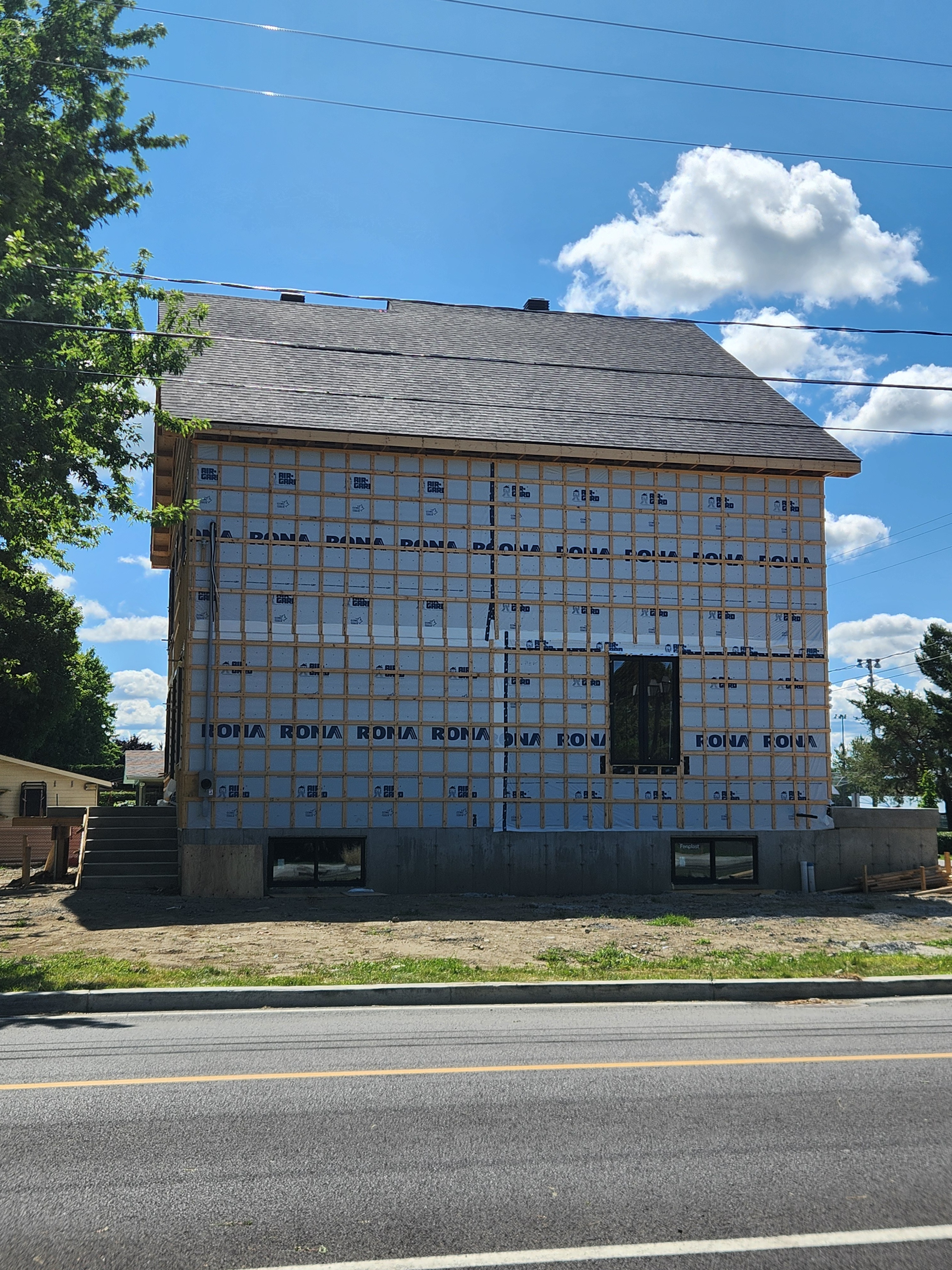 Toujours intéressant de comparer l’architecture des maisons de banlieue à travers les époques. Je constate que depuis les années 2000, les proportions des maisons au Québec ont vraiment grossi. Cette maison unifamiliale en construction actuellement, sur un coin de rue, tranche avec la petitesse des maisons directement à sa droite, construites dans les années 60-70. Il y a de plus en plus de ces dychotomies sur le territoire.