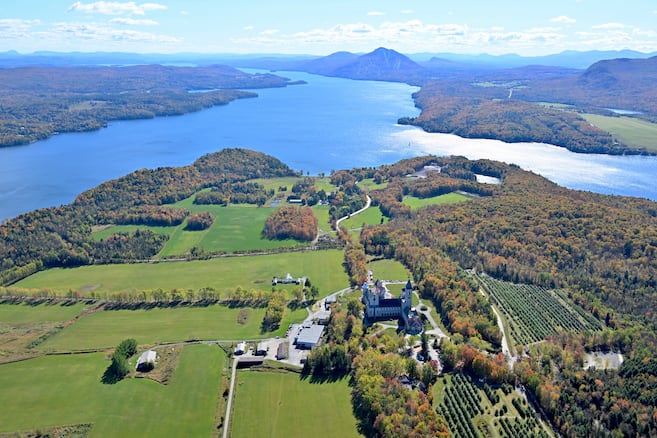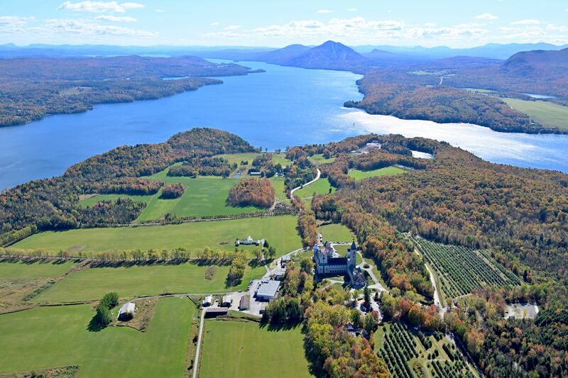 Pour la chronique-entrevue d’aujourd’hui, un vol au-dessus de l’abbaye de Saint-Benoît-du-Lac, un lieu monastique et récréotouristique situé près du lac Memphrémagog, en Estrie. Ces photos ont été prises à l’automne 2025.