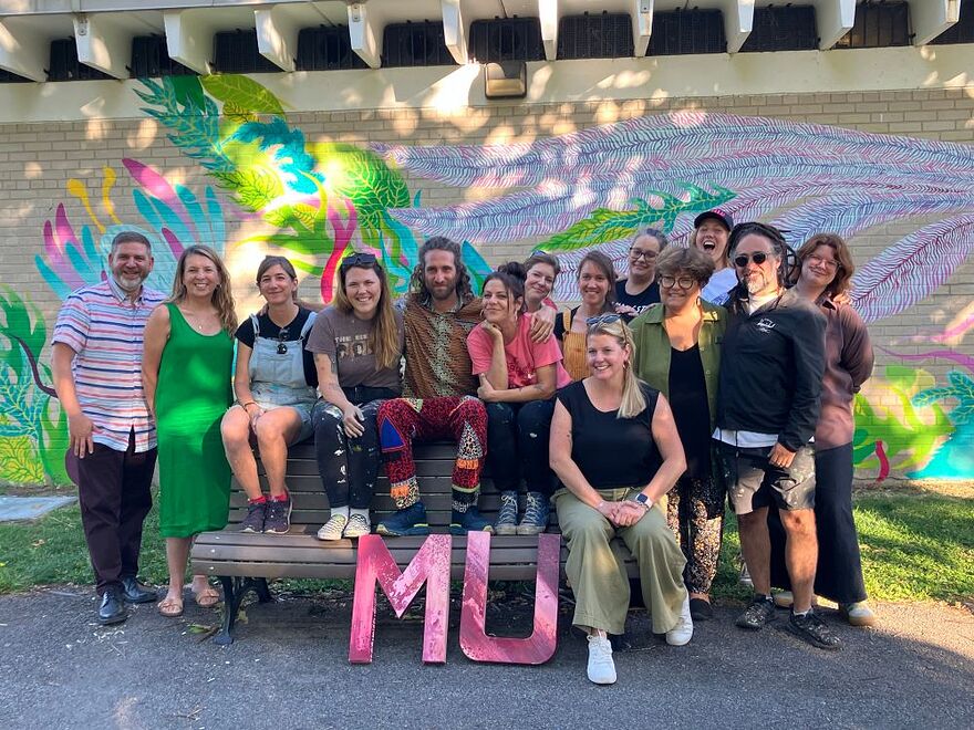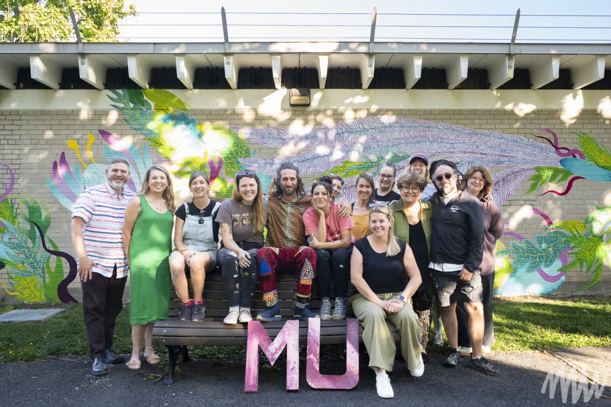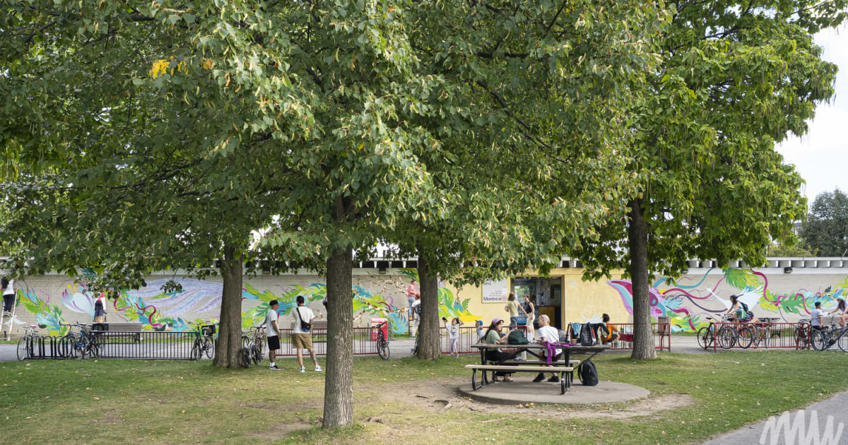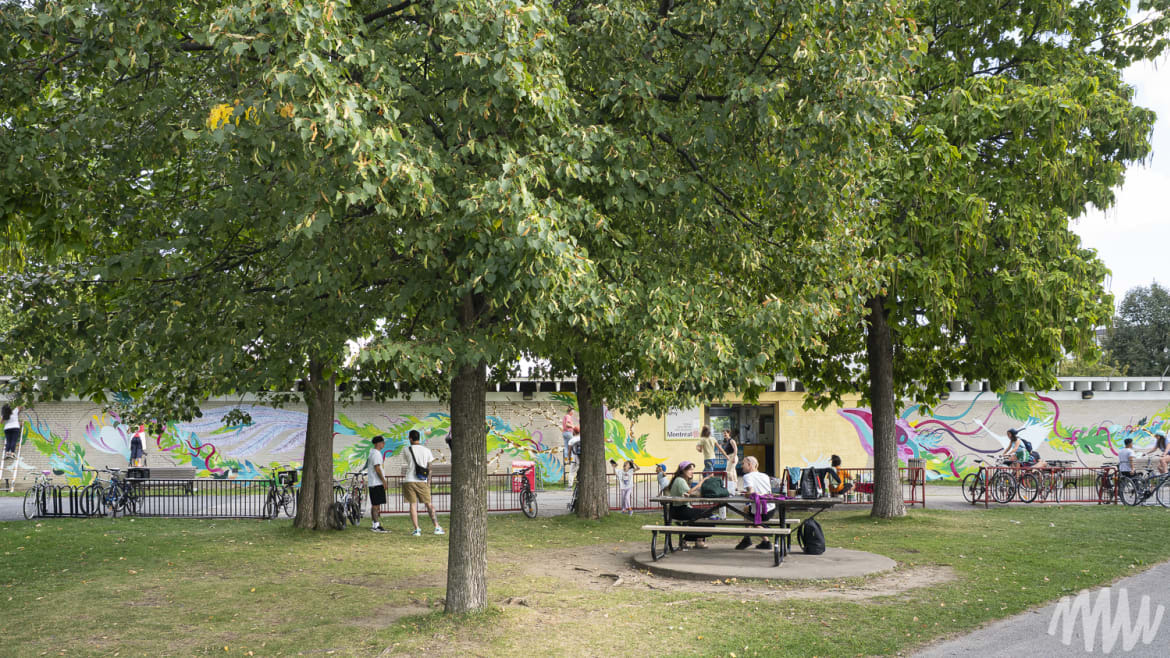 À l’occasion du centenaire du parc Jarry, l’arrondissement de Villeray–Saint-Michel–Parc-Extension a confié à MU la réalisation d’une murale monumentale sur le pavillon des baigneurs qui abrite la piscine, au cœur du parc.