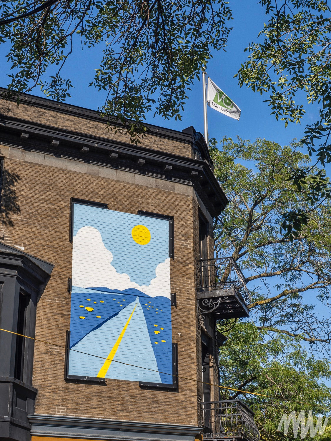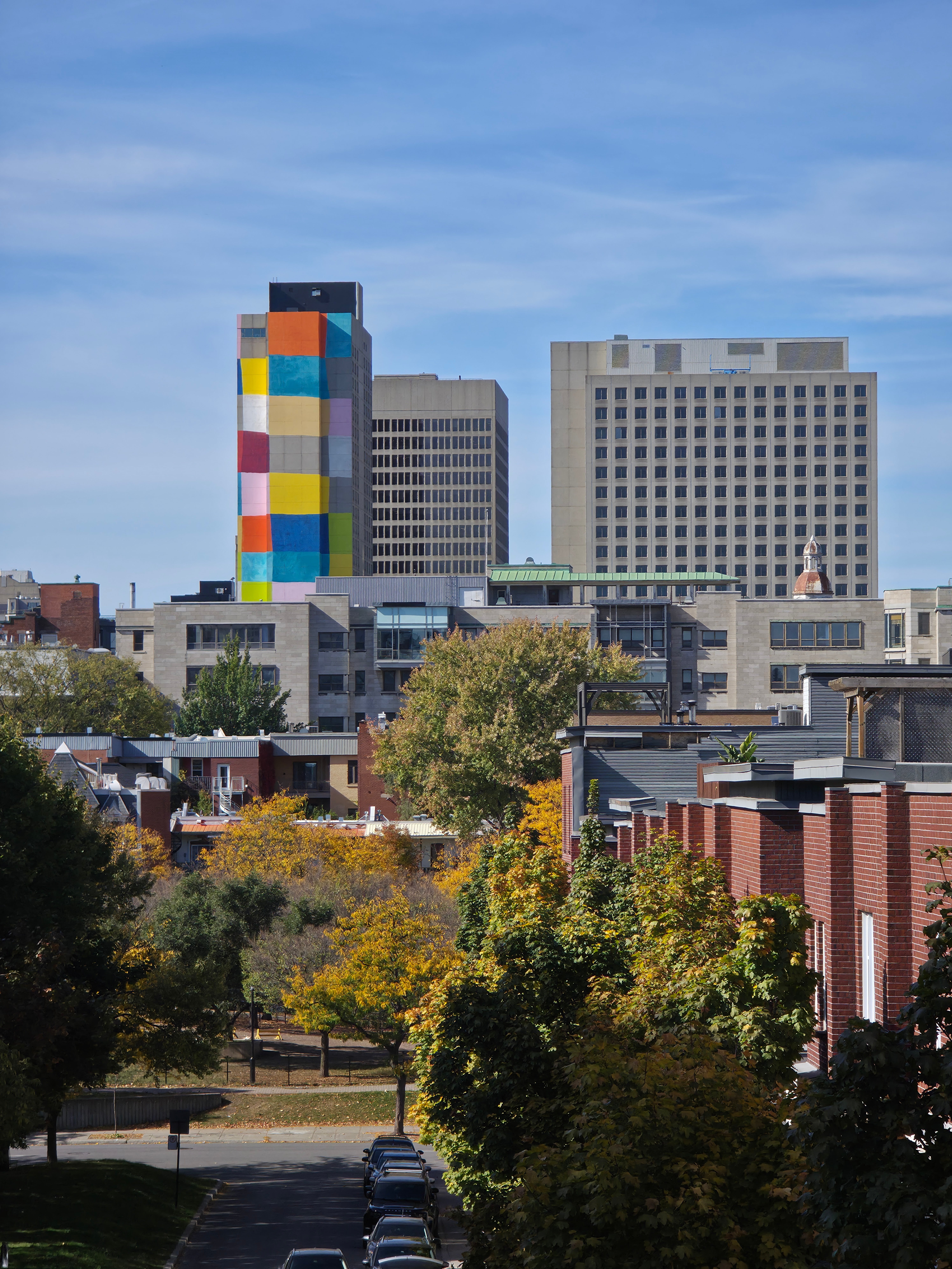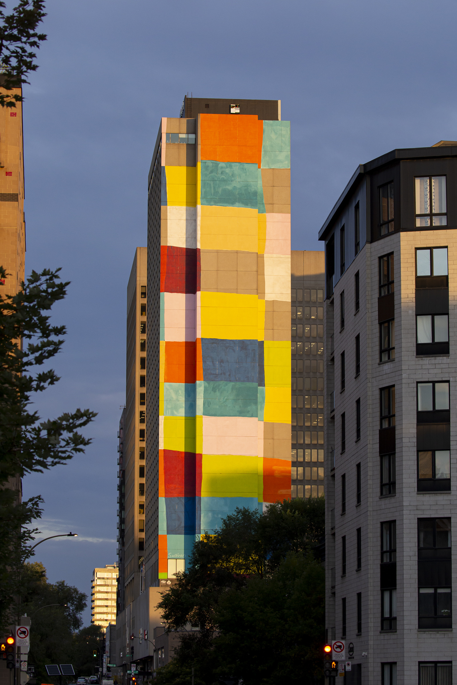 La murale intitulée Damiers a été créée par Mu en 2023 à l’occasion du 100e anniversaire de Françoise Sullivan. On la voit ici d’un point de vue destiné à disparaître, sur la rue Labelle, juste au sud de Sainte-Catherine.