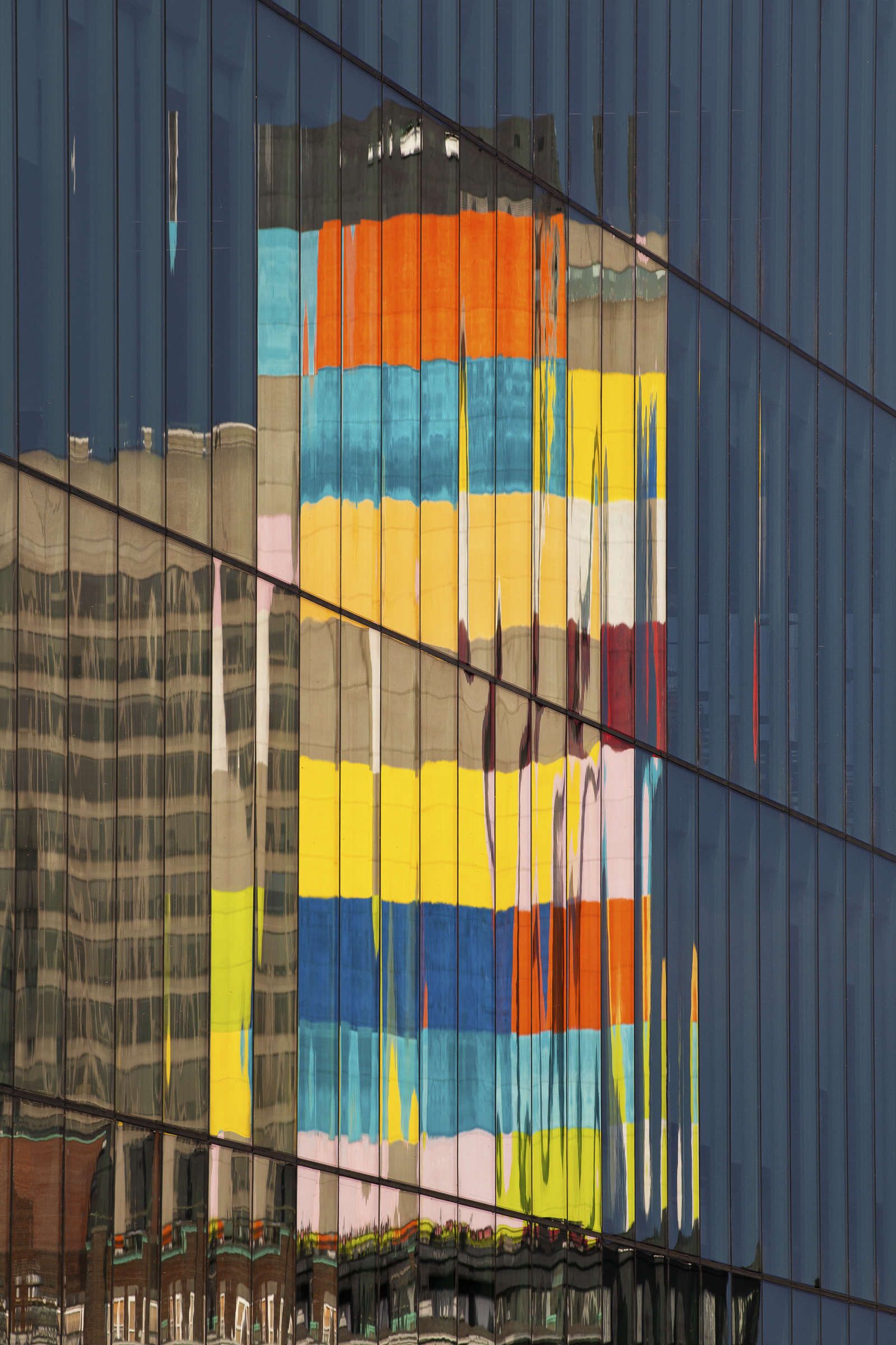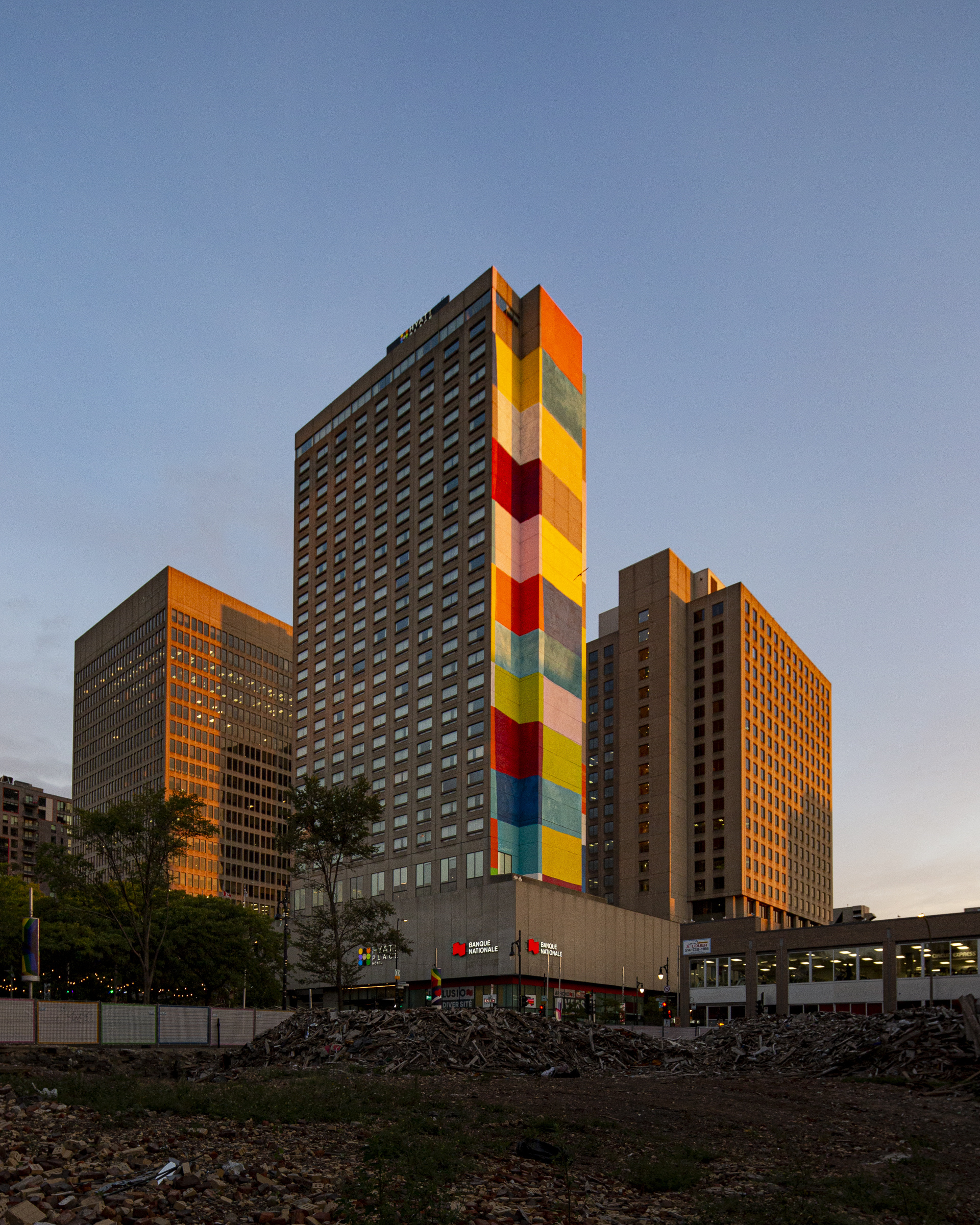 La murale, qui couvre toute la hauteur de l’hôtel Hyatt de Place Dupuis, est bien visible à partir de la rue Saint-Hubert. Elle se reflète aussi sur le mur de la Place Gare Viger.