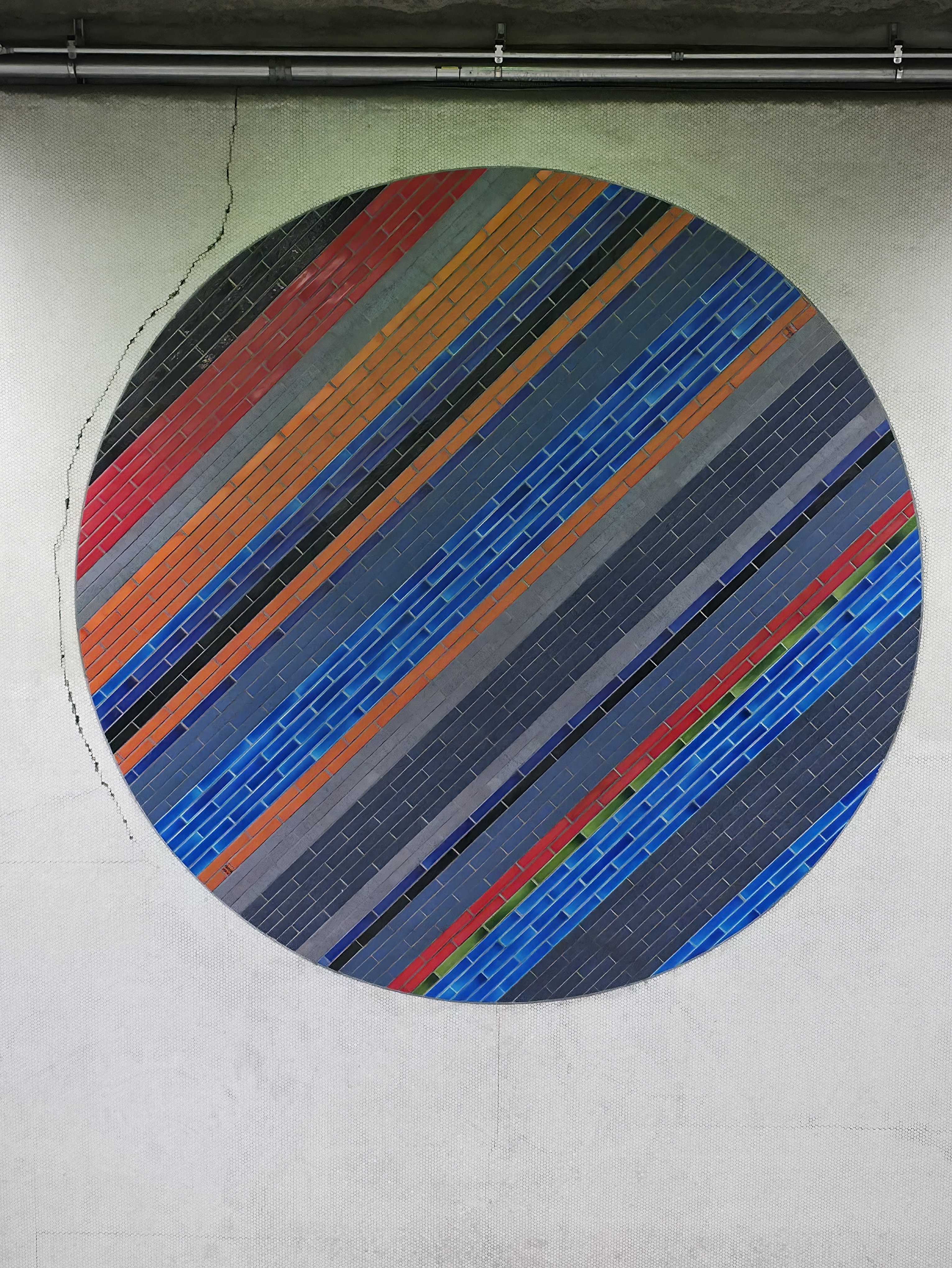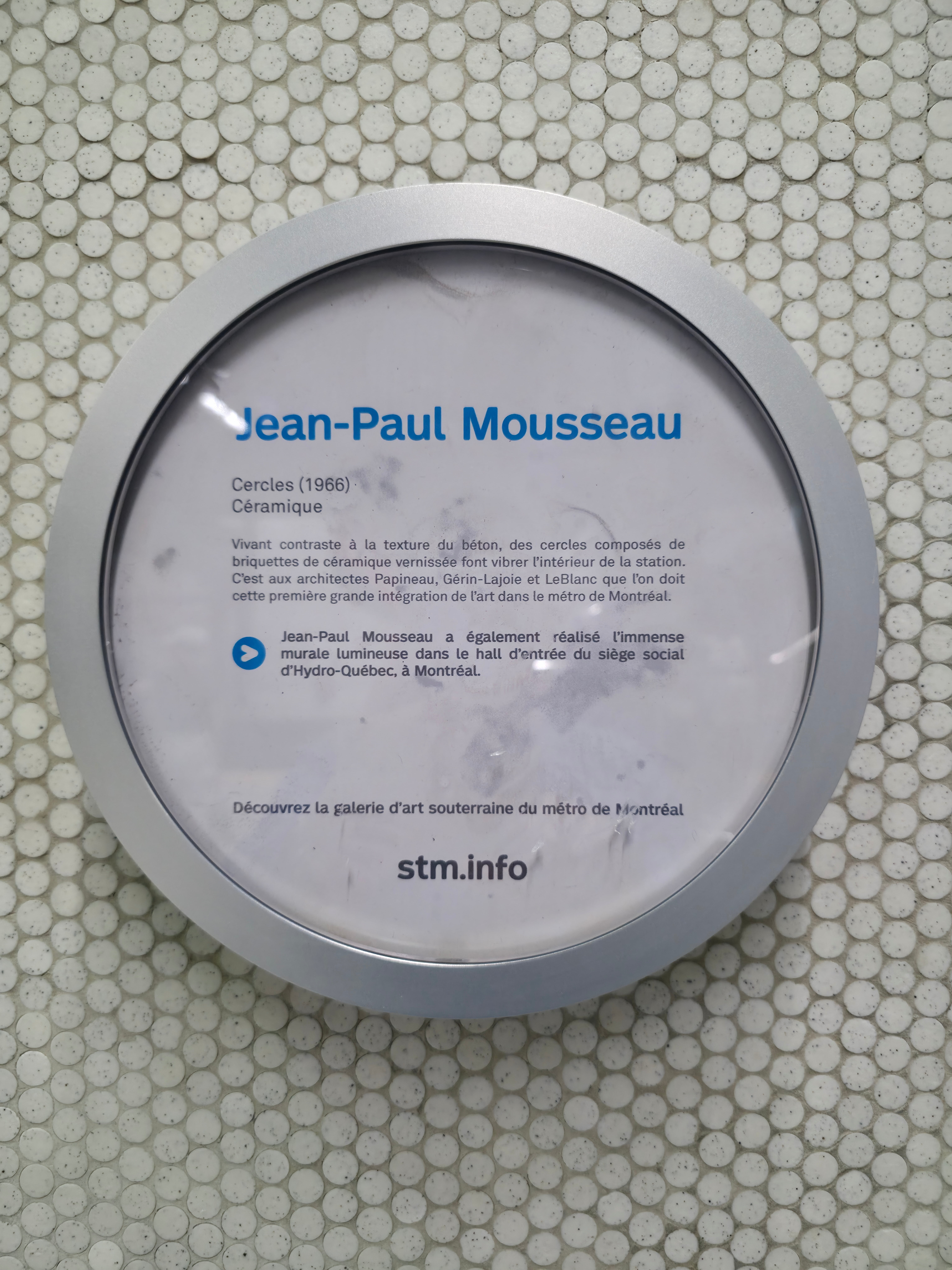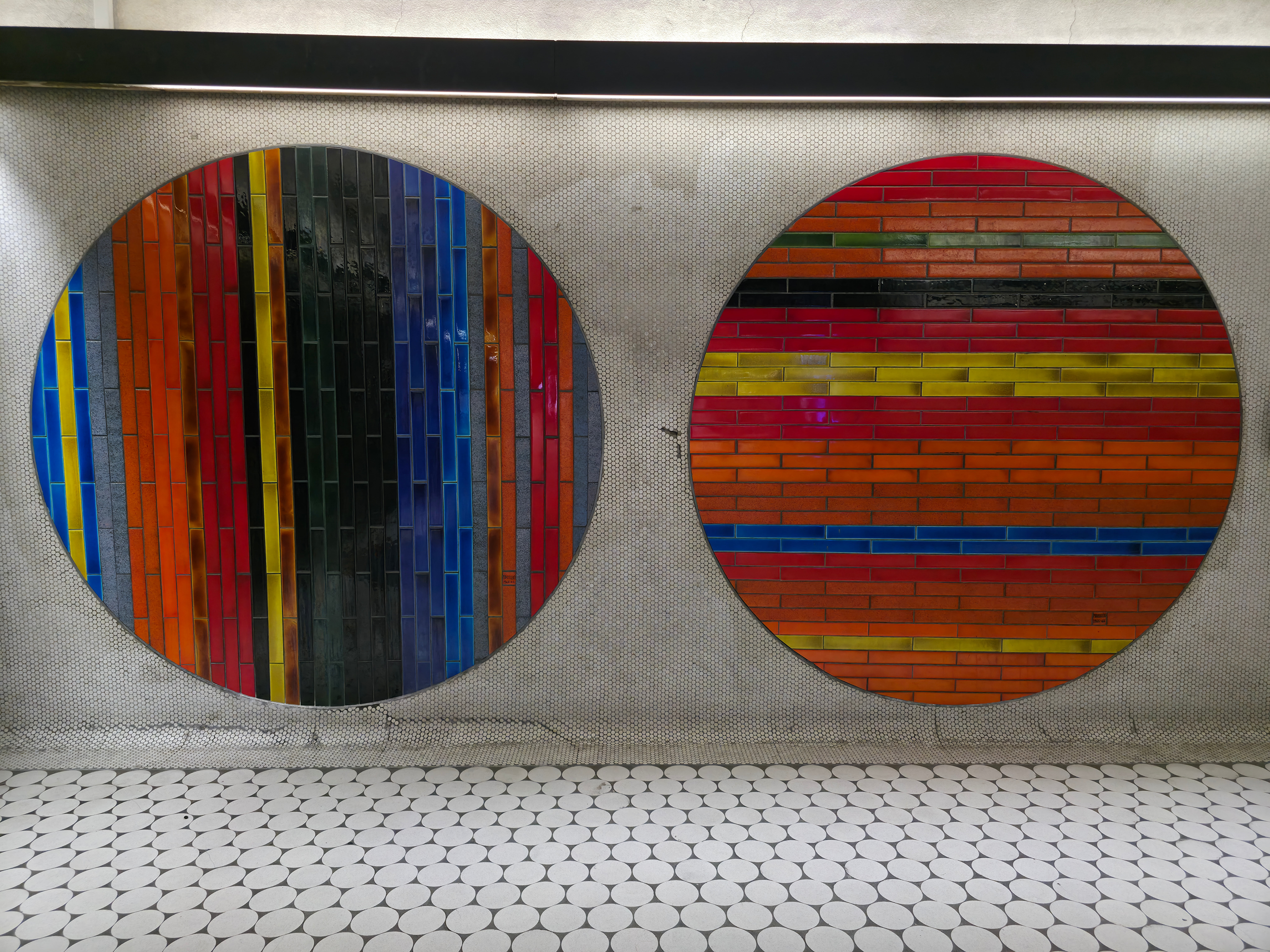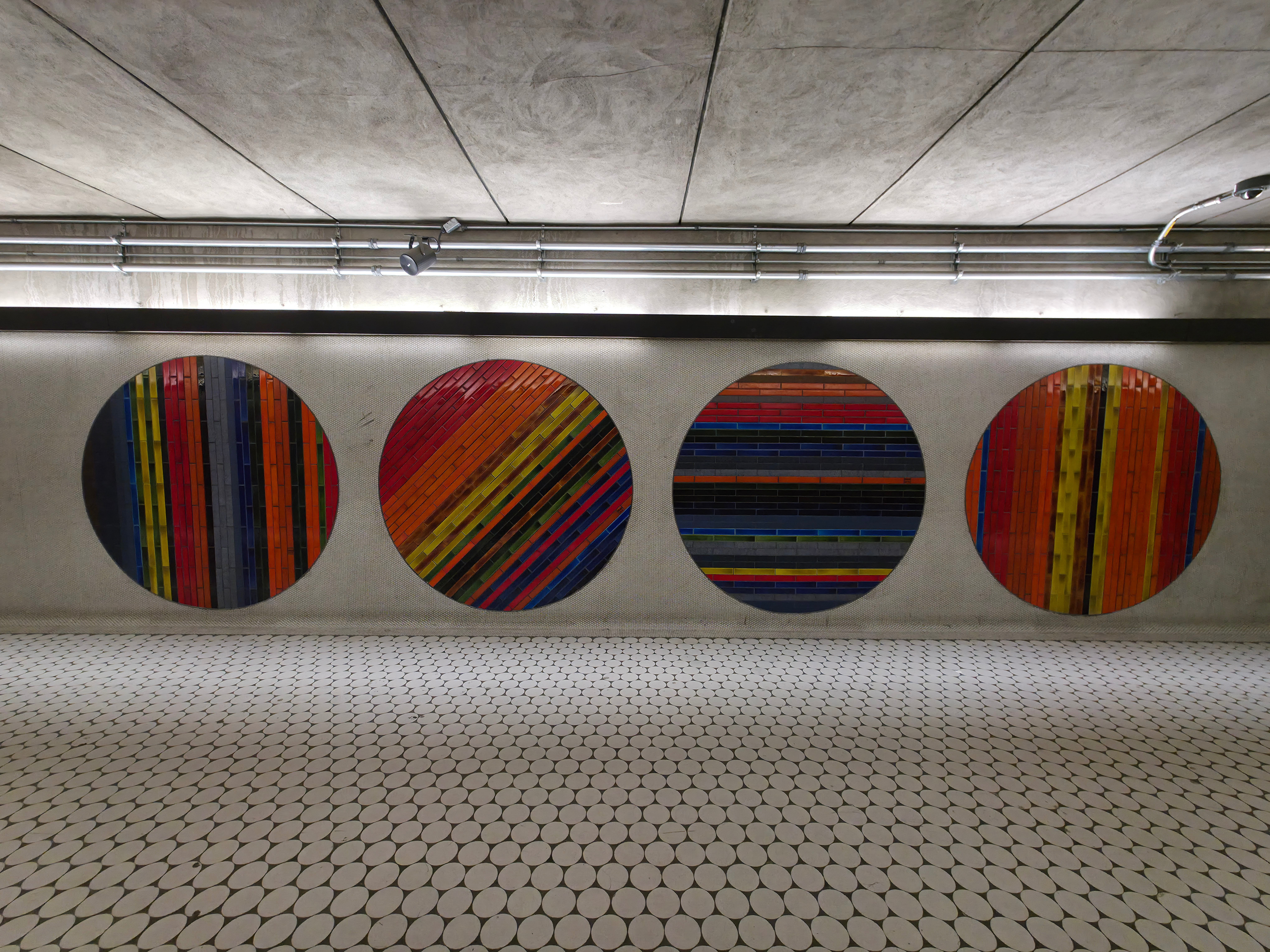 Quelques-uns des nombreux tondo du peintre automatiste Jean-Paul Mousseau à la station de métro Peel. Ces oeuvres en céramique de Jean-Paul Mousseau ont été réalisées par le céramiste Claude Vermette.