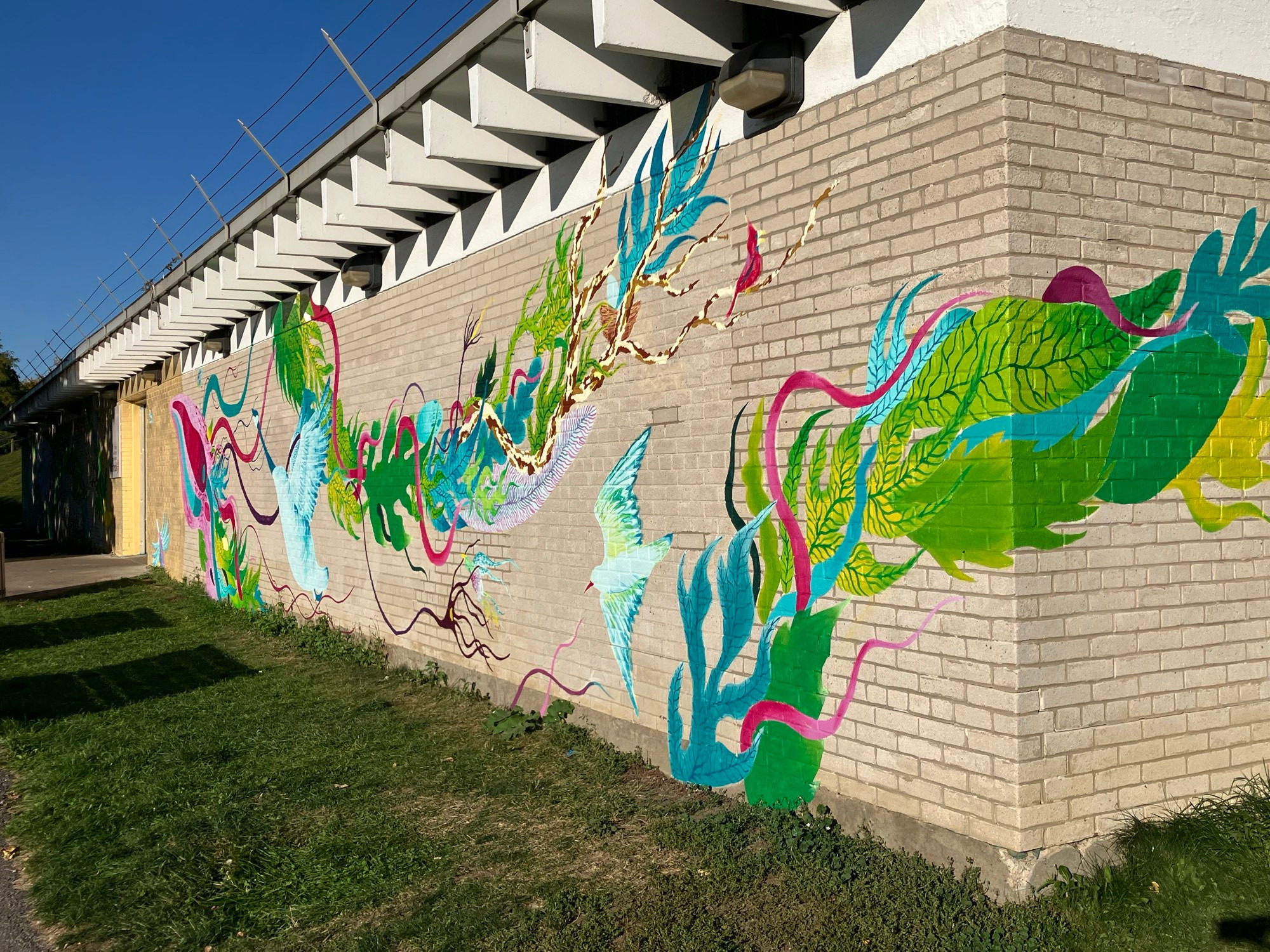Déployée sur trois façades, la fresque aux formes végétales et aériennes métamorphose le pavillon des baigneurs en un point d’ancrage visuel vibrant et méditatif. Une célébration du vivant au cœur de la ville. En parallèle, un atelier communautaire a réuni des citoyennes et citoyens du quartier autour de la création de nids d’oiseaux en argile. Ce geste symbolique prolonge la réflexion artistique et invite à renouveler notre regard sur la nature et sur notre rôle dans l’écosystème urbain.