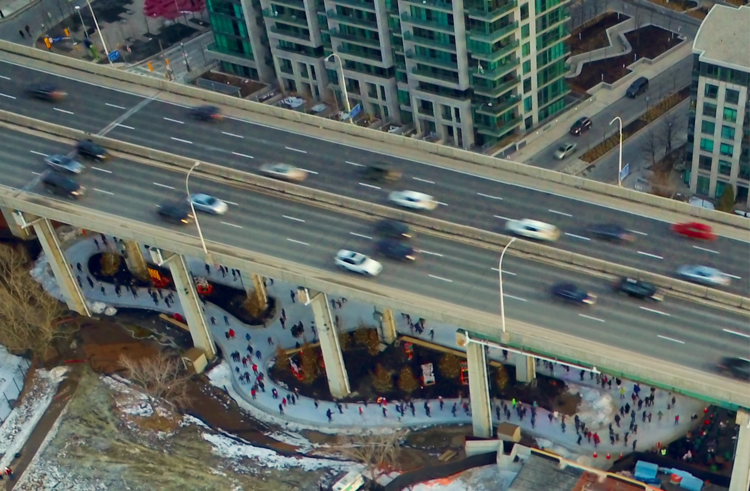 Intéressant, mais cette section du Gardiner Expressway est adjacente à une parc. Ça change tout. L’environnement de la métropolitaine est très différent. Le boulevard Crémazie n’offre pas un cadre qui permet d’espérer une animation de la sorte sous l’autoroute.