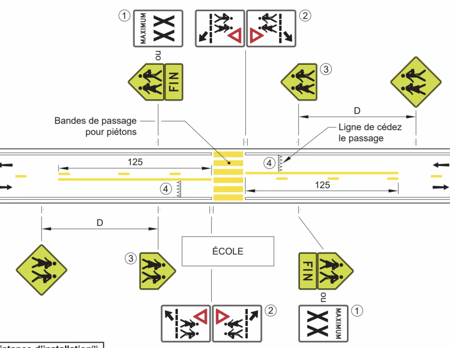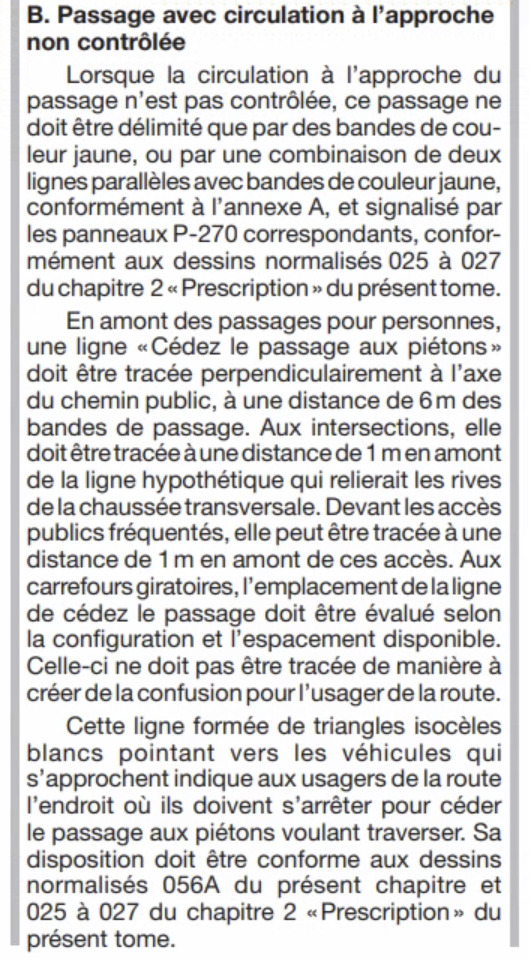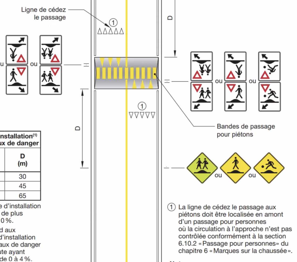 Tout traverse piétonne non contrôlé (c’est-à-dire sans panneau arrêt ni feux de circulation), doit être en jaune et accompagné avec ces triangles isocèles.